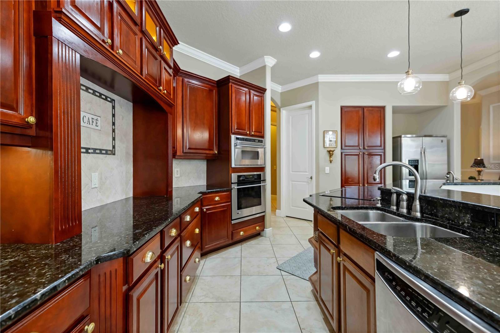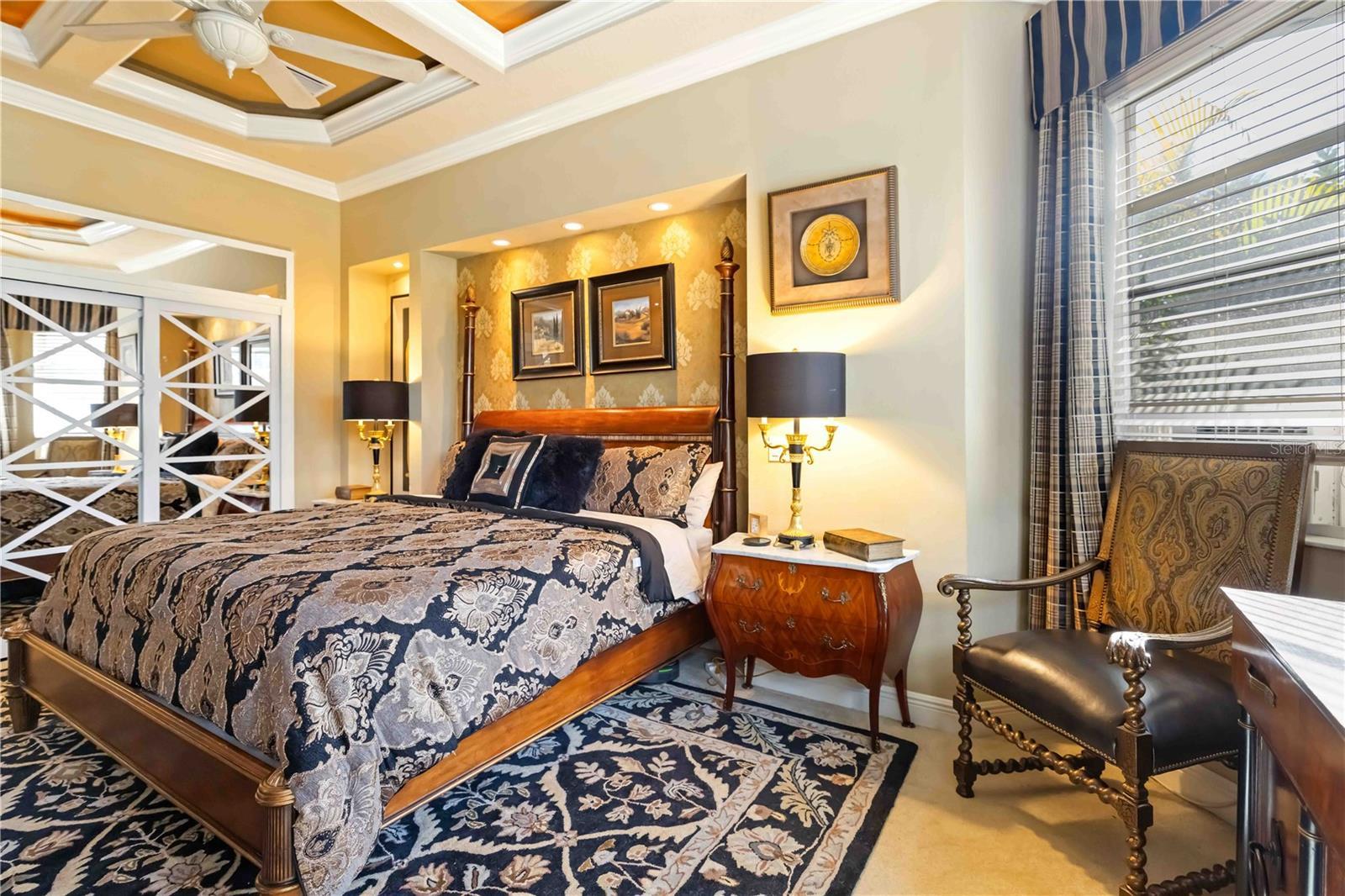 - Built-in Features, Ceiling Fans(s), Central Vaccum, Coffered Ceiling(s), Crown Molding, Eat-in Kitchen, High Ceilings, Kitchen/Family Room Combo, Open Floorplan, Primary Bedroom Main Floor, Solid Wood Cabinets, Split Bedroom, Stone Counters, Tray Ceiling(s), Walk-In Closet(s), Window Treatments