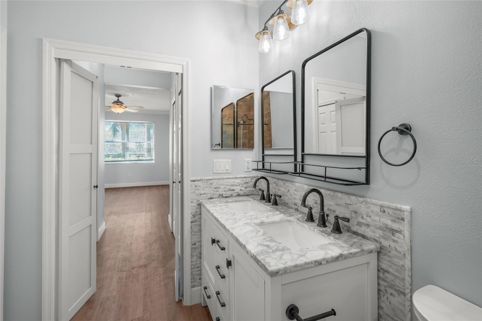 Located in the highly desirable Stonehaven gated community, this sought-after ground-floor 3-bedroom, 2-bath residence offers an exceptional blend of comfort, quality, and convenience. Ideally positioned near the community pool, lakes, and recreation areas, and just minutes from I-75, world-famous Siesta Key Beach, and an abundance of shopping, dining, and everyday conveniences, this home delivers both lifestyle and accessibility. Built with concrete block construction and featuring hurricane impact windows and doors, the residence provides peace of mind year-round. Inside, enjoy luxury vinyl plank flooring throughout, volume ceilings with crown molding, ceiling fans in all living areas, window treatments, and dimmable lighting in every room. Smart-home upgrades include a Ring front door camera, smart lock entry, and an ADT security system (unmonitored). The interior laundry room includes a large-capacity washer and dryer with cabinetry, complemented by a quick-recovery hot water heater and whole-home soft water system. The well-appointed kitchen features tall wood cabinetry, a pantry with pull-out shelving, Corian countertops with dual integrated sinks, under-cabinet lighting, a breakfast bar, and upscale black Whirlpool appliances. The primary suite offers an updated bath with new tile, mirrors, and a dual-sink marble-top vanity, a newly tiled shower with dual shower heads and controls, linen closet, double-door bath entry, and two customized closets. The second bath includes a new single-sink vanity with a shower-over-tub. A screened lanai with shade and storage closet extends the living space, while the one-car garage features built-in cabinetry and overhead storage. Second and third bedrooms include wall closets, window treatments, ceiling fans, and dimmable lighting—making this home truly move-in ready.