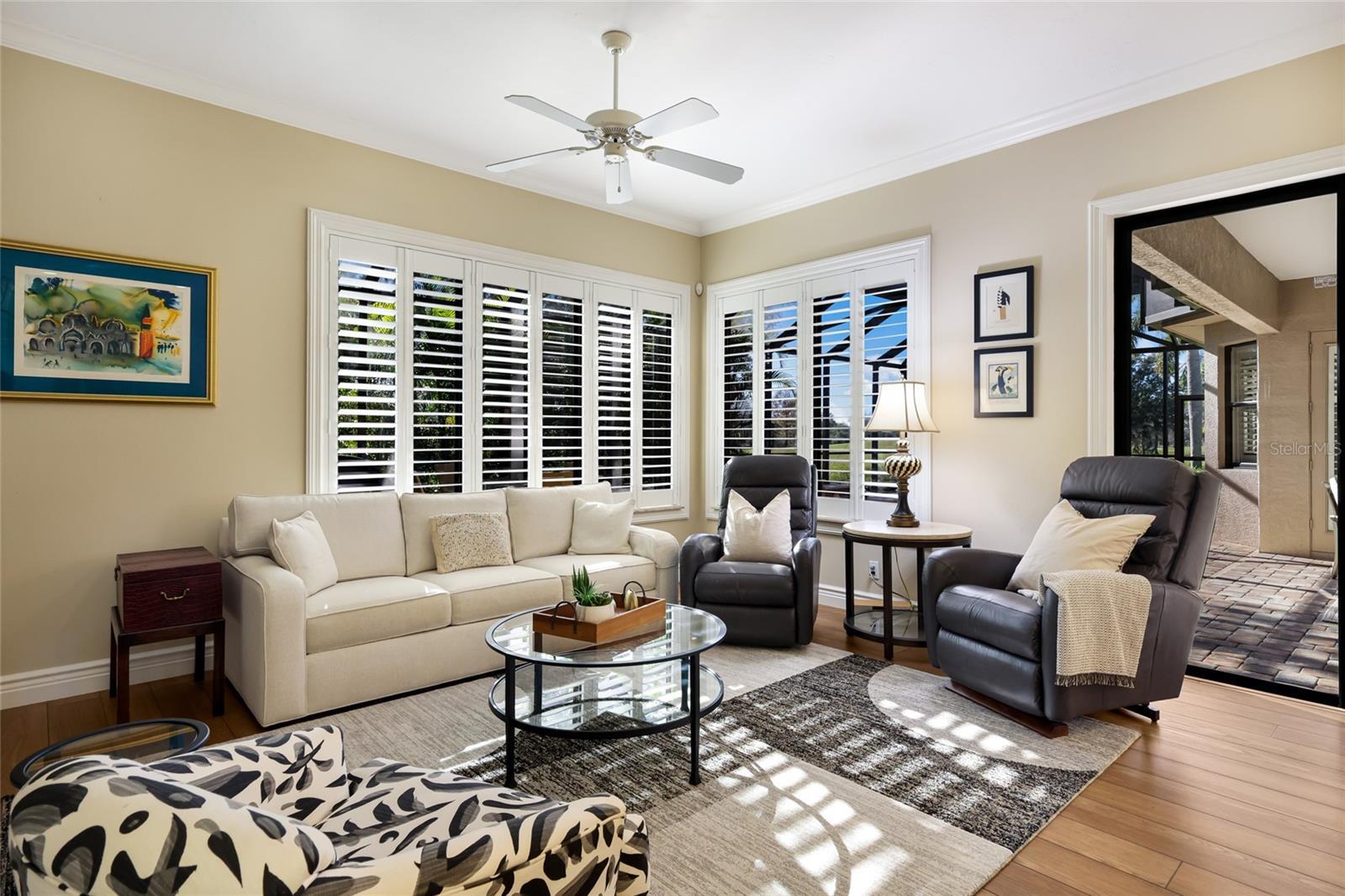 Relish spacious living with sunset golf views in a custom residence built by Gibraltar Homes on a private corner lot of the Vilamour enclave in Lakewood Ranch Country Club. Encompassing 3,445 square feet, the Caterina III floor plan was enlarged from its original plan offering three bedrooms, a number of upgrades, designer ceilings, crown moldings and premium appealing features. Captivating curb appeal leads into the living room introducing the inviting aesthetic that sets the tone with rotunda ceiling capped with accent lighting, and a generously-sized dining room perfect for family gatherings. The open-concept residence centers around the large updated kitchen, featuring an oversized island and countertops, white cabinetry, stainless appliances, breakfast bar and a oversized walk-in pantry. The kitchen effortlessly flows into the spacious adjoining family room with accent wall featuring an electric fireplace, and direct access to the expansive screened lanai, where you’ll enjoy a heated pebble tec pool, scenic golf course views, pre-plumbed for an outdoor kitchen, and an extended covered area perfect for gathering. A sanctuary for pampering and relaxation, the owner’s retreat showcases tray ceiling, two oversized walk-in closets, and a dazzling remodeled en-suite bath with a double tray ceiling, separate vanities, walk-in shower and soaking tub. Guests will appreciate the main level bedroom with its own private full bath, while upstairs boasts the home’s third bedroom, full bath, and oversized bonus room with built-in office area. Other highlights of this sprawling home include a separate office/den on the main level, an ample-sized laundry room with cabinetry and sink, two 2024 AC units, plantation window shutters, 8’ interior doors, and a three car garage. An impeccable maintenance-included residence within the #1 top-selling master-planned community known for its vibrant lifestyle, dining, shopping, A-rated schools and non-mandatory membership opportunities to become a member of Lakewood Ranch Golf & Country Club, which include four 18-hole championship golf courses, tennis, state-of-the-art Fitness center, clubhouses, junior Olympic-sized pool, pickleball and more.