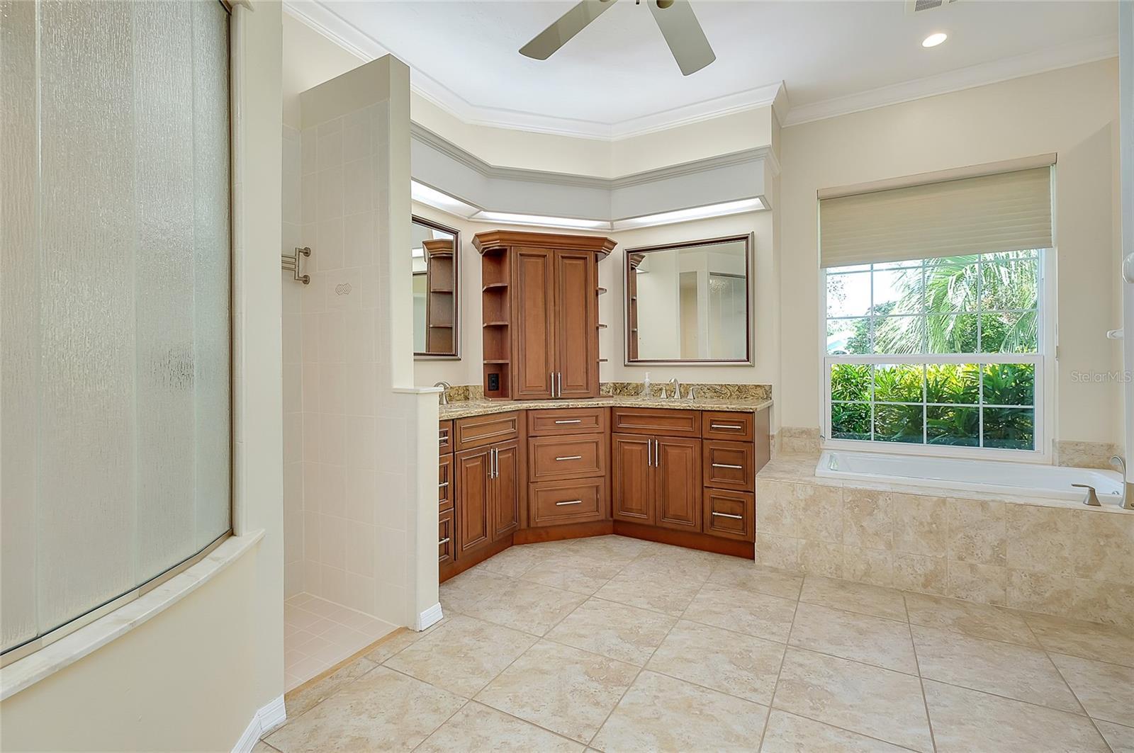 - Built-in Features, Ceiling Fans(s), Crown Molding, Eat-in Kitchen, High Ceilings, Kitchen/Family Room Combo, Open Floorplan, Primary Bedroom Main Floor, Solid Wood Cabinets, Split Bedroom, Stone Counters, Thermostat, Tray Ceiling(s), Vaulted Ceiling(s), Walk-In Closet(s), Window Treatments