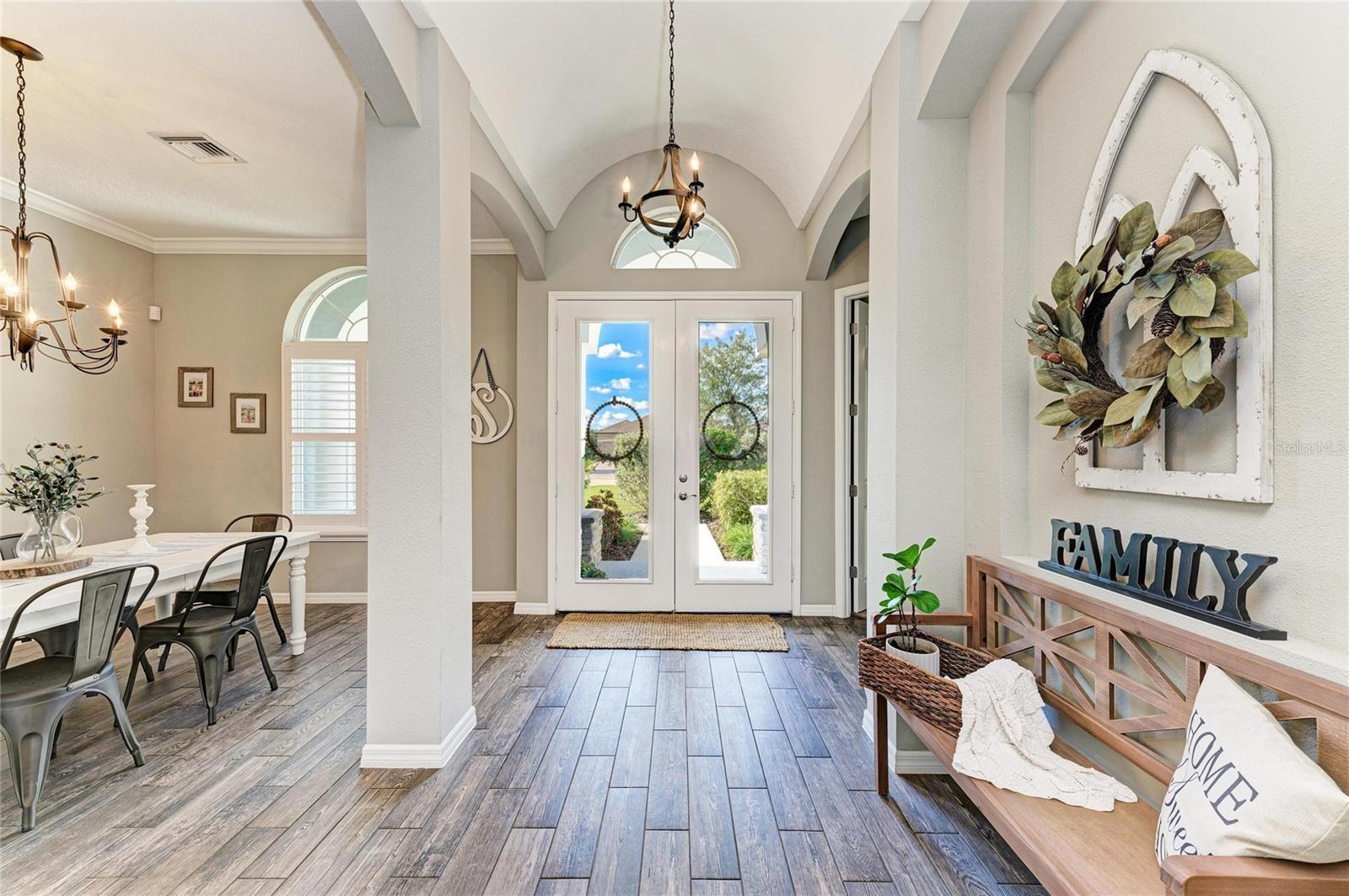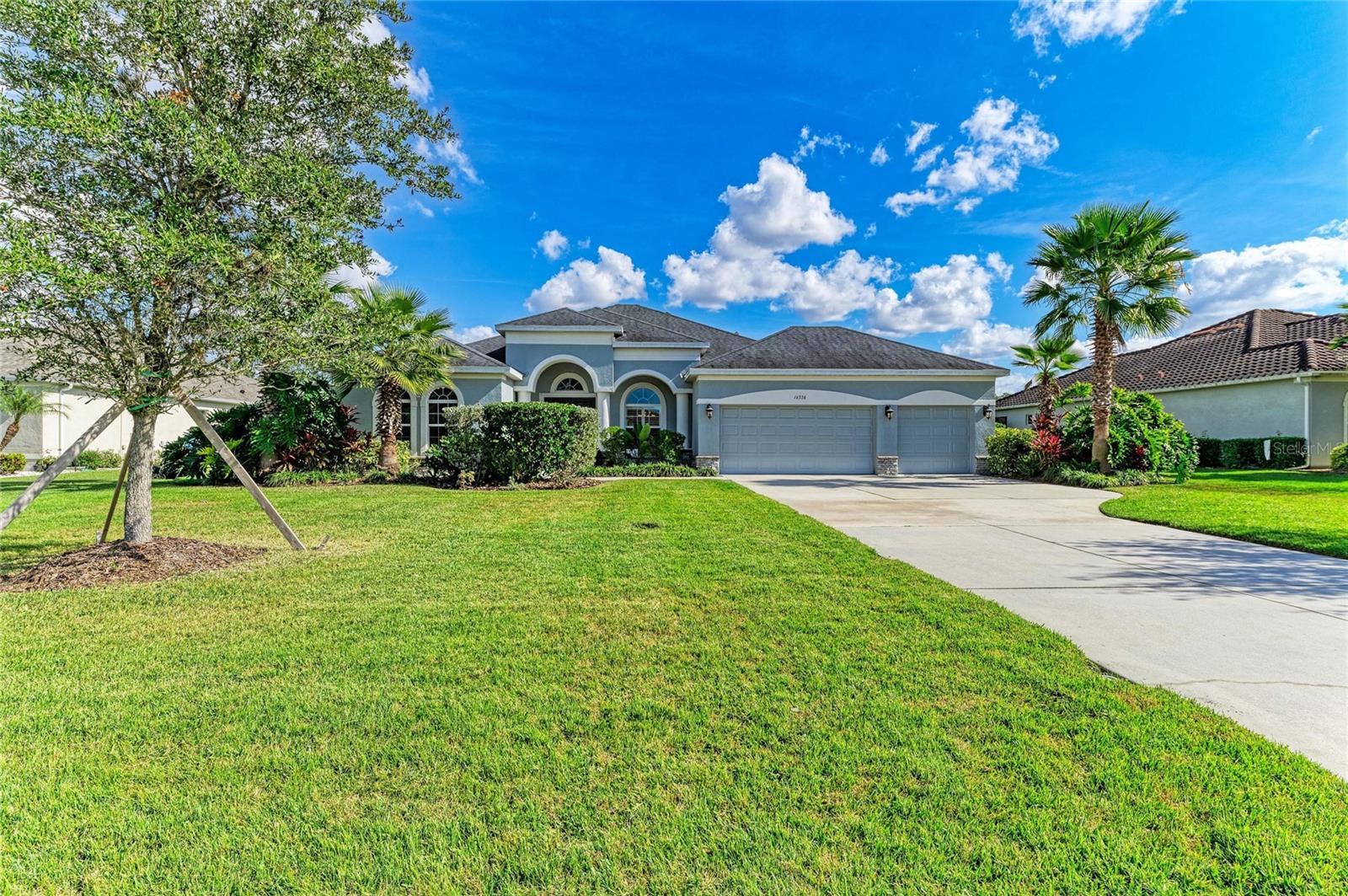 3 Bedrooms PLUS HUGE DEN Pool Home with 3 Car Garage! Welcome to this stunning quality-built and highly desired Aruba model by Medallion Home, a beautifully designed single-family residence that blends elegance, space, and indoor-outdoor living on an expansive 0.60 acre oversized lot with a serene conservation view. From the moment you arrive, you are greeted by double leaded-glass entry doors and a breathtaking barrel-tray ceiling in the foyer, setting the tone for the exceptional craftsmanship found throughout the home. Inside, the open and airy great room features soaring 10-foot ceilings with tray ceiling details, seamlessly flowing into the dining room and an impressive chef’s kitchen—perfect for entertaining. The kitchen is bright and expansive, showcasing stainless steel appliances with built-in microwave and oven, a separate cooktop, beautiful cabinetry with lighting, and a massive island that comfortably seats four. A spacious and charming breakfast nook with bay windows overlooks the sparkling pool and lush backyard, creating the perfect place to enjoy morning coffee. Triple sliding glass doors fully open to the outdoor living area with peaceful conservation views and privacy. The outdoor lanai space is already pre-plumbed with electrical and plumbing, offering endless potential for a future outdoor kitchen. This thoughtfully designed split floor plan includes three bedrooms plus a large office with double doors located at the front of the home—ideal for remote work or a private retreat. The two secondary bedrooms feature stylish custom concrete flooring, while arched windows at the front of the home with plantation shutters add architectural charm. The primary suite is a true sanctuary, offering two large walk-in closets and a luxurious spa-like bathroom with dual sinks, a vanity with a bank of drawers, a large soaking tub, and an exceptionally large walk-in shower. Additional highlights include a spacious laundry room with cabinets and a utility sink, and a three-car garage with epoxy floors, high ceilings and built-in storage from the ceiling, providing ample space for vehicles, hobbies, and organization. Located in the highly desirable Twin Rivers community, residents enjoy access to a park, picnic areas, long walking trails and a boat ramp into Gamble Creek, perfect for launching your boats, kayaks or canoes and embracing Florida’s outdoor lifestyle. No CDDs here and a low HOA! This home offers the perfect combination of luxury, functionality, and location—an exceptional opportunity to own a refined retreat in one of the area’s most sought-after communities.