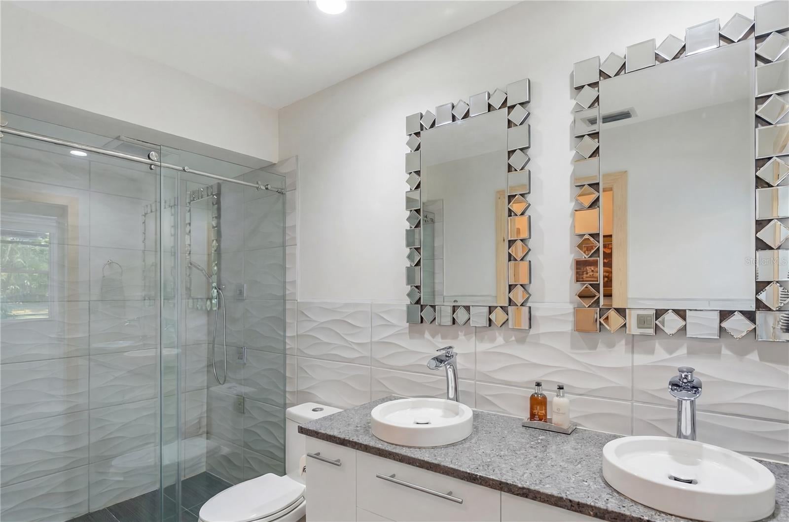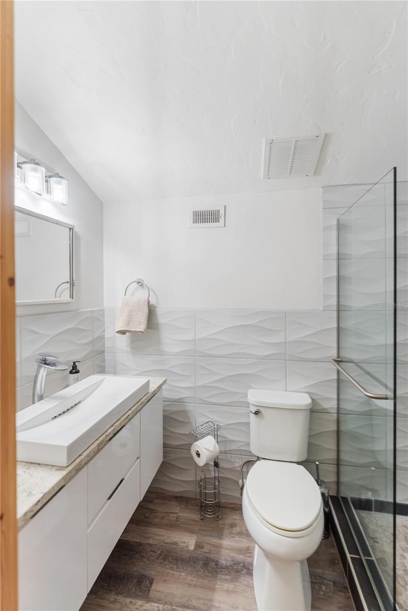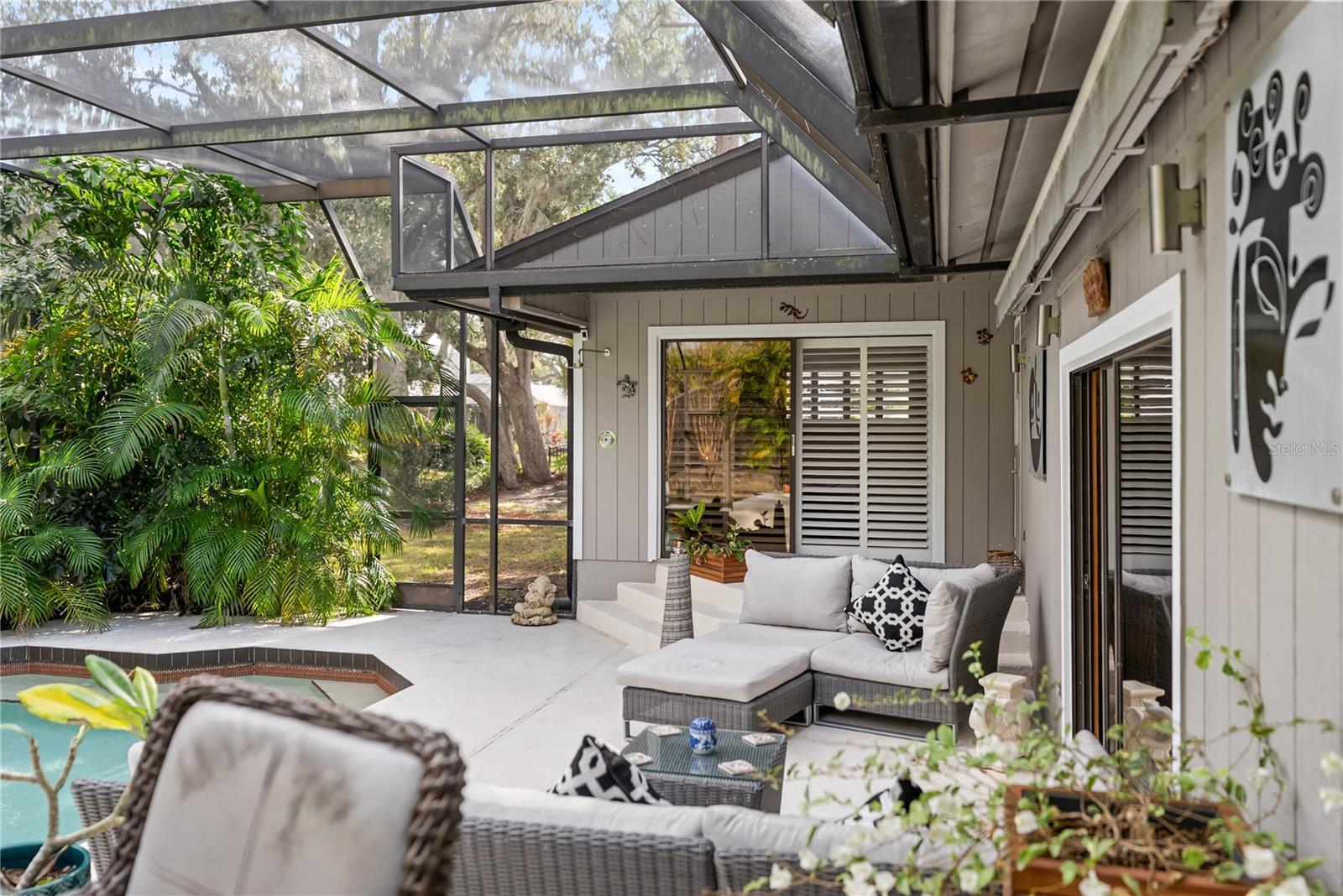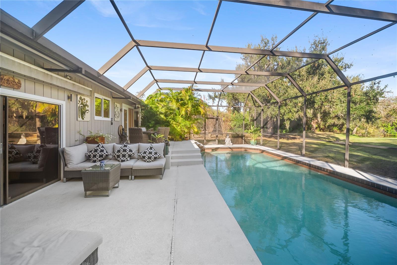 Set in the quiet and charming Beneva Woods community, this lovingly remodeled 4-bedroom, 3-bath home offers privacy, architectural character, and a peaceful connection to nature, just 15 minutes from downtown Sarasota. The home is surrounded by mature trees and opens to a serene backyard with a screened pool and tranquil lake views beyond. Enjoy a quiet morning coffee or a relaxed evening swim; the outdoor space feels like a private retreat. Inside, the home blends clean modern lines with warm natural textures and an eclectic, artistic sensibility. Vaulted ceilings, exposed beams, and thoughtful architectural details create a light-filled, airy feel throughout the main living spaces. The kitchen is generous and well designed, with ample cabinetry and modern finishes, overlooking the living area, perfect for everyday living and relaxed entertaining. The primary suite is calm and inviting, with a beautifully updated spa-style bathroom featuring dual vanities and sculptural vessel sinks. Plantation shutters open to overlook the pool and greenery beyond, allowing the suite to feel quietly connected to the serene outdoor setting. On the main level, a flexible floor plan includes additional bedrooms and a full bath that also serves conveniently as a pool bath. A striking open staircase leads to a spacious loft on the second level with its own en-suite bath, offering an ideal space for guests, a home office, or a private retreat. Additional features include two A/C units, two hot water heaters, a wood-burning fireplace, a large laundry room with direct access to a private dog run, and a two-car garage that includes a small air-conditioned space ideal for a workshop, hobby area, or additional storage. This is a home that feels intentional, peaceful, and deeply cared for - a rare opportunity to enjoy privacy, architectural interest, and serenity while remaining close to Sarasota’s beaches, dining, and vibrant cultural life.