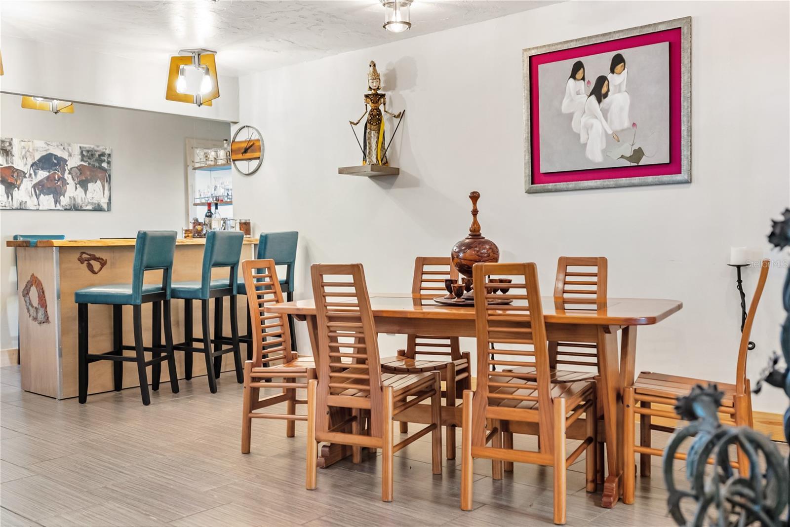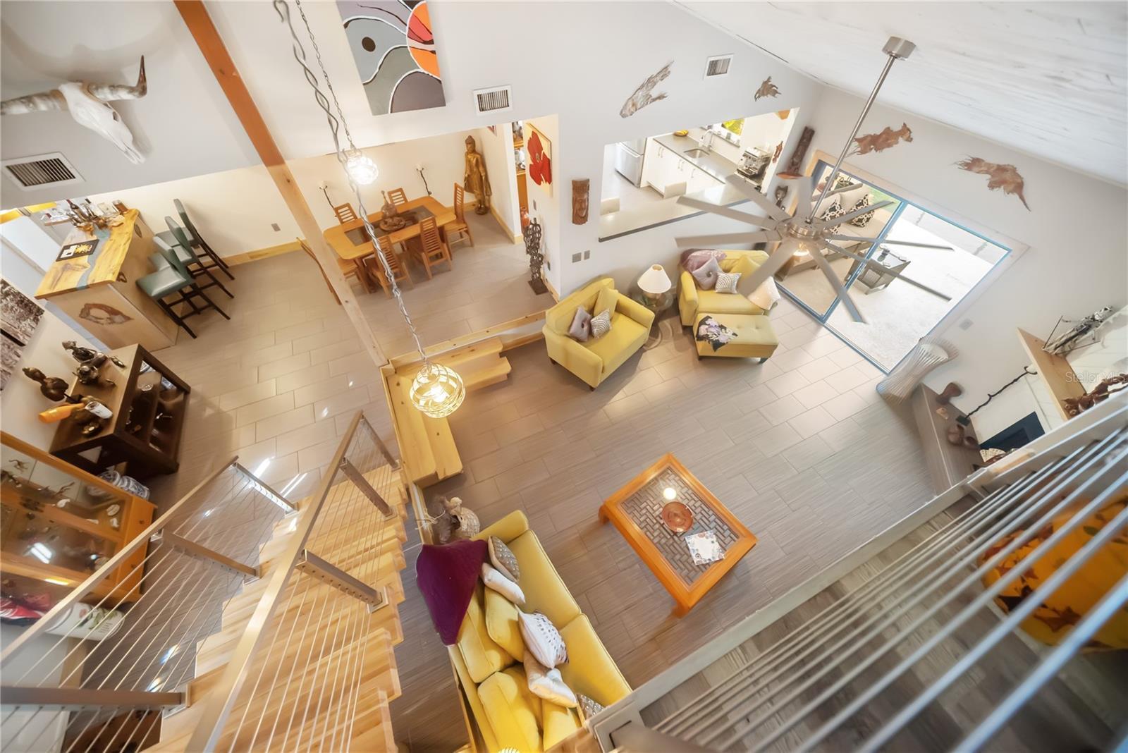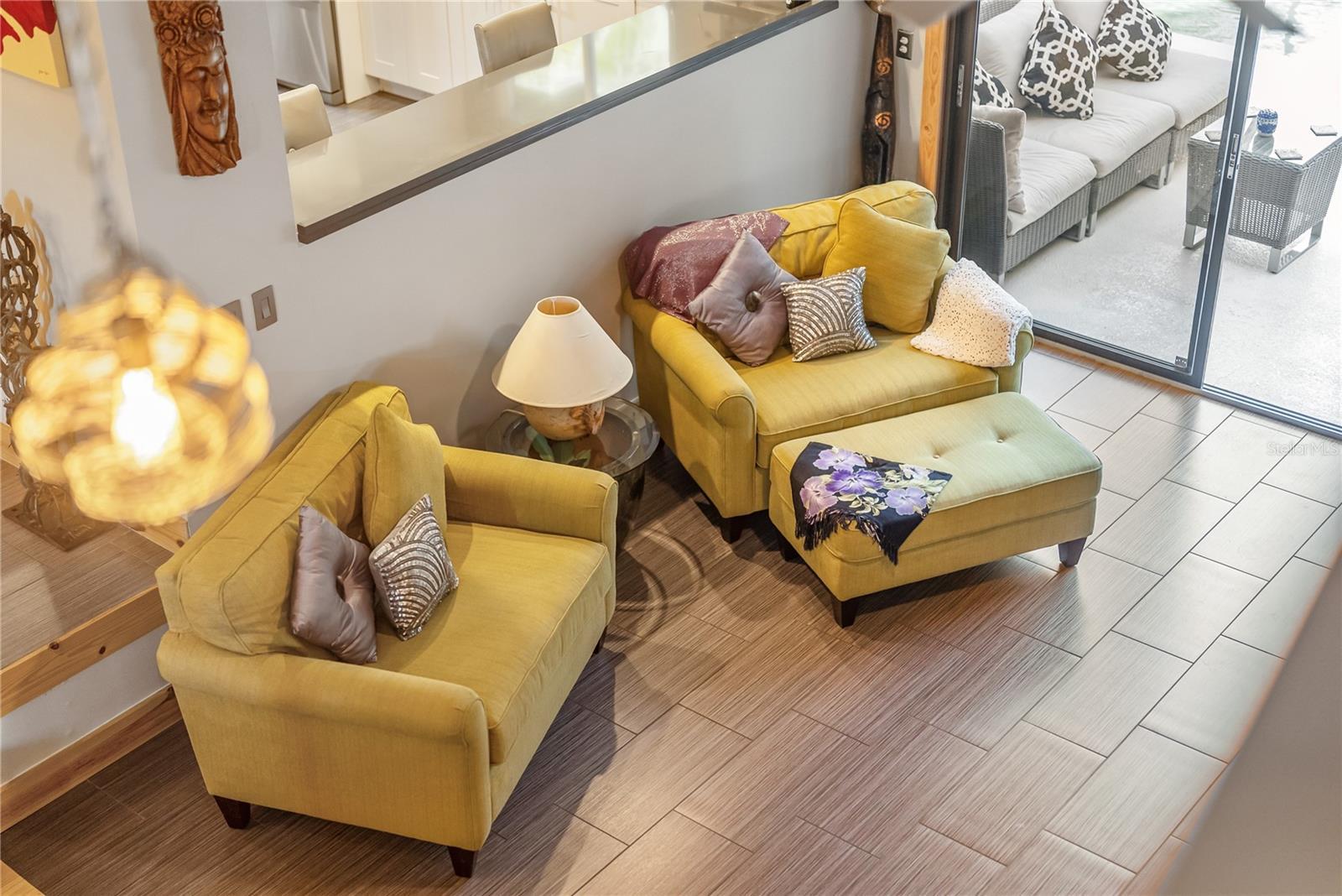 Set in the quiet and charming Beneva Woods community, this lovingly remodeled 4-bedroom, 3-bath home offers privacy, architectural character, and a peaceful connection to nature, just 15 minutes from downtown Sarasota. The home is surrounded by mature trees and opens to a serene backyard with a screened pool and tranquil lake views beyond. Enjoy a quiet morning coffee or a relaxed evening swim; the outdoor space feels like a private retreat. Inside, the home blends clean modern lines with warm natural textures and an eclectic, artistic sensibility. Vaulted ceilings, exposed beams, and thoughtful architectural details create a light-filled, airy feel throughout the main living spaces. The kitchen is generous and well designed, with ample cabinetry and modern finishes, overlooking the living area, perfect for everyday living and relaxed entertaining. The primary suite is calm and inviting, with a beautifully updated spa-style bathroom featuring dual vanities and sculptural vessel sinks. Plantation shutters open to overlook the pool and greenery beyond, allowing the suite to feel quietly connected to the serene outdoor setting. On the main level, a flexible floor plan includes additional bedrooms and a full bath that also serves conveniently as a pool bath. A striking open staircase leads to a spacious loft on the second level with its own en-suite bath, offering an ideal space for guests, a home office, or a private retreat. Additional features include two A/C units, two hot water heaters, a wood-burning fireplace, a large laundry room with direct access to a private dog run, and a two-car garage that includes a small air-conditioned space ideal for a workshop, hobby area, or additional storage. This is a home that feels intentional, peaceful, and deeply cared for - a rare opportunity to enjoy privacy, architectural interest, and serenity while remaining close to Sarasota’s beaches, dining, and vibrant cultural life.