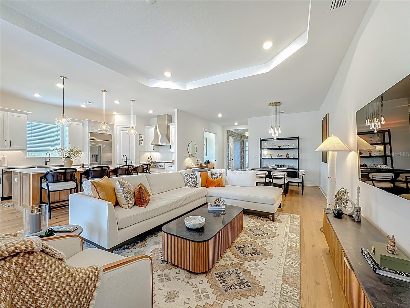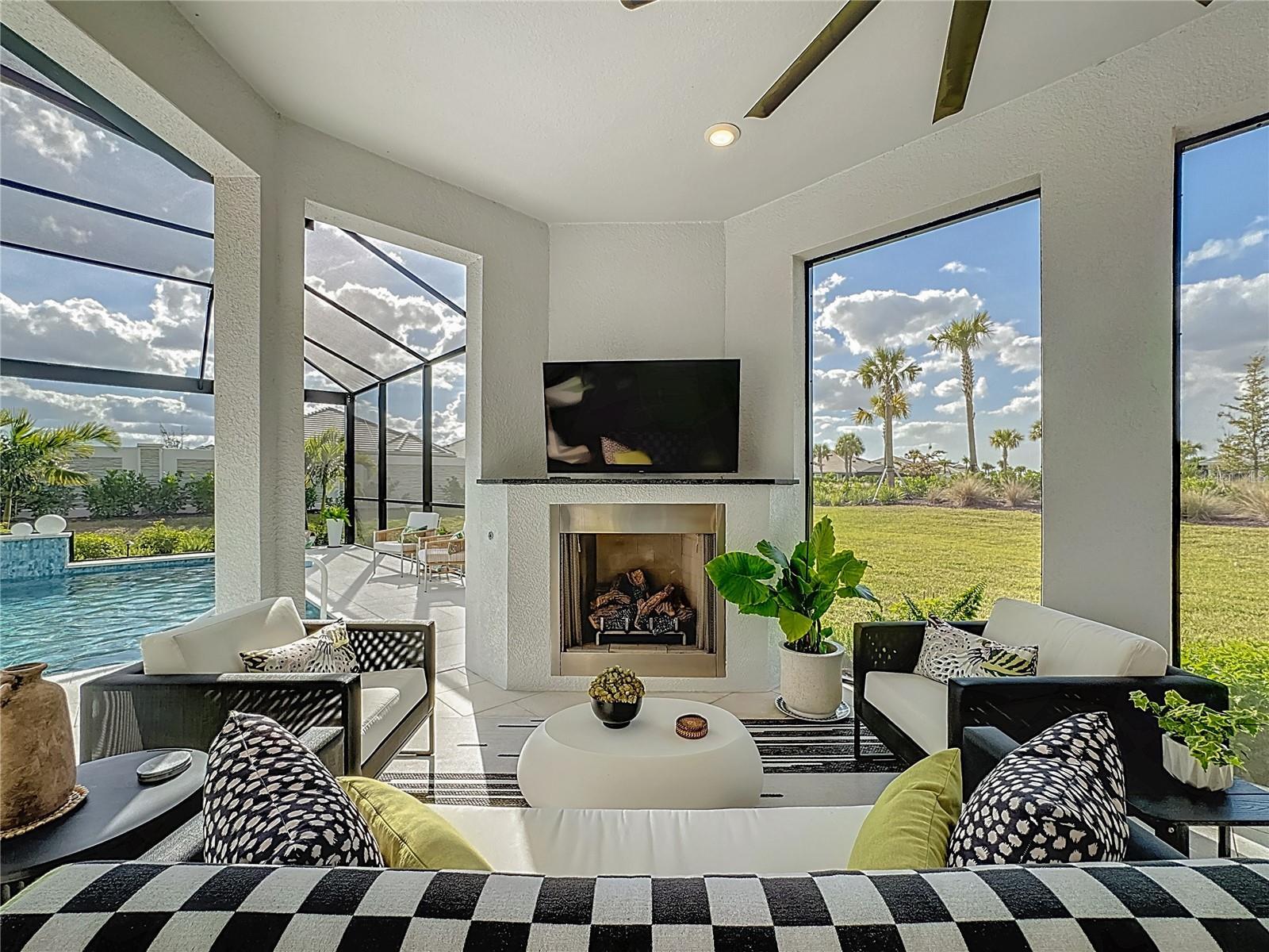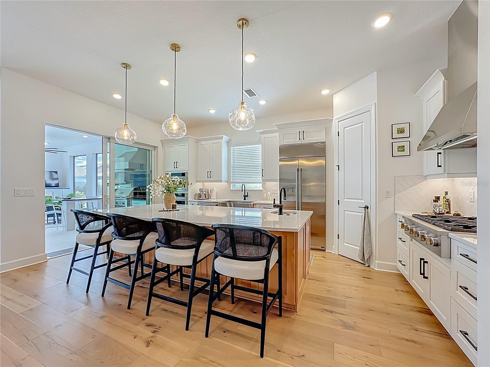 Located in the sought-after Esplanade at Azario in Lakewood Ranch, this professionally decorated single-family home on a corner lot, offers luxury living with an open, entertainer-friendly design. The home features three bedrooms, three full bathrooms, an over sized garage, and a versatile flex room/office that easily serve as a fourth bedroom. The gourmet kitchen showcases quartz countertops, upgraded cabinetry, stainless steel appliances, tile backsplash, and an oversized island with prep sink and built-in bar refrigerator. The open floor plan flows into the eat-in dining area and spacious family room with tray ceilings and large sliders that flood the home with natural light. Enjoy seamless indoor-outdoor living on the private lanai featuring a built-in outdoor kitchen, fireplace, and a heated pool and spa with sun shelf and waterfall features. The home offers two primary suites with walk-in closets and spa inspired baths with double quartz vanities and porcelain tile. Additional highlights include upgraded hardwood floors, hurricane impact windows and doors, custom window treatments and decorative wallpaper. Residents enjoy resort-style amenities including a golf course, spa, fitness center, tennis and pickleball courts, community pools, culinary center with formal and casual dining, social clubs, coffee shop, and dog parks.