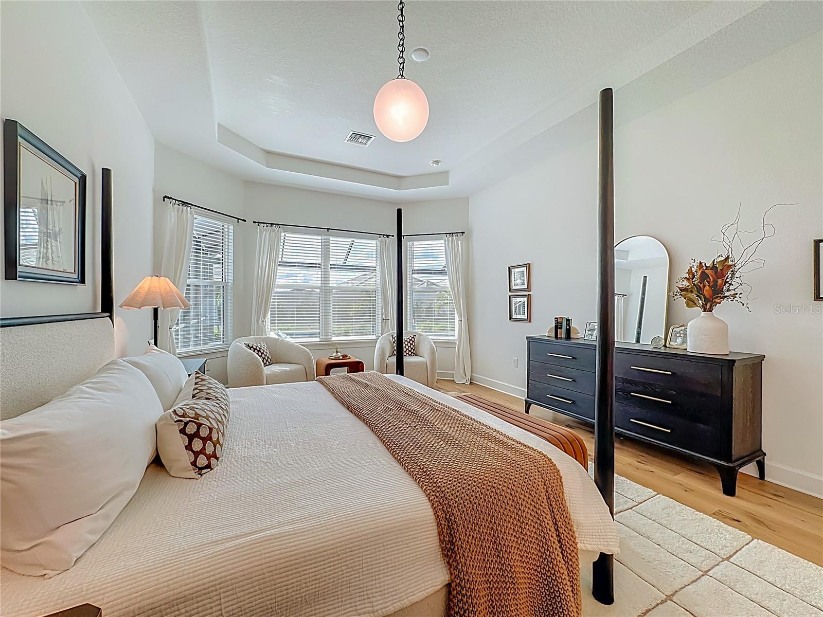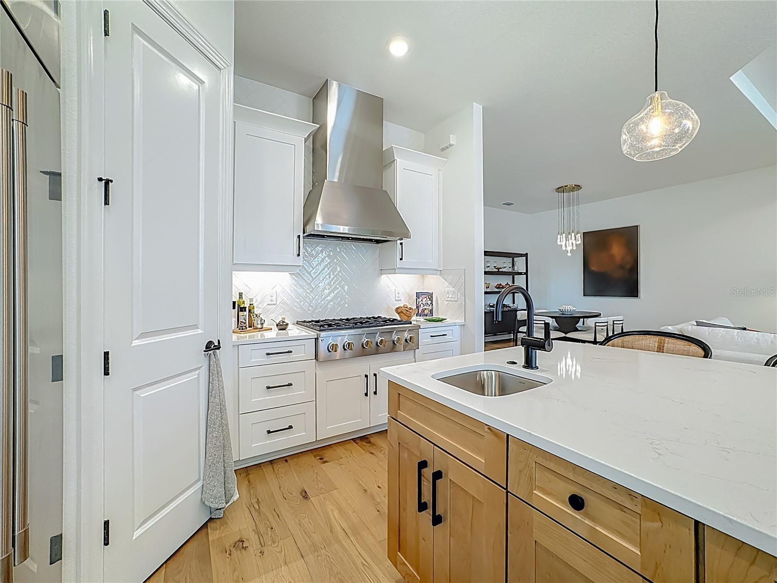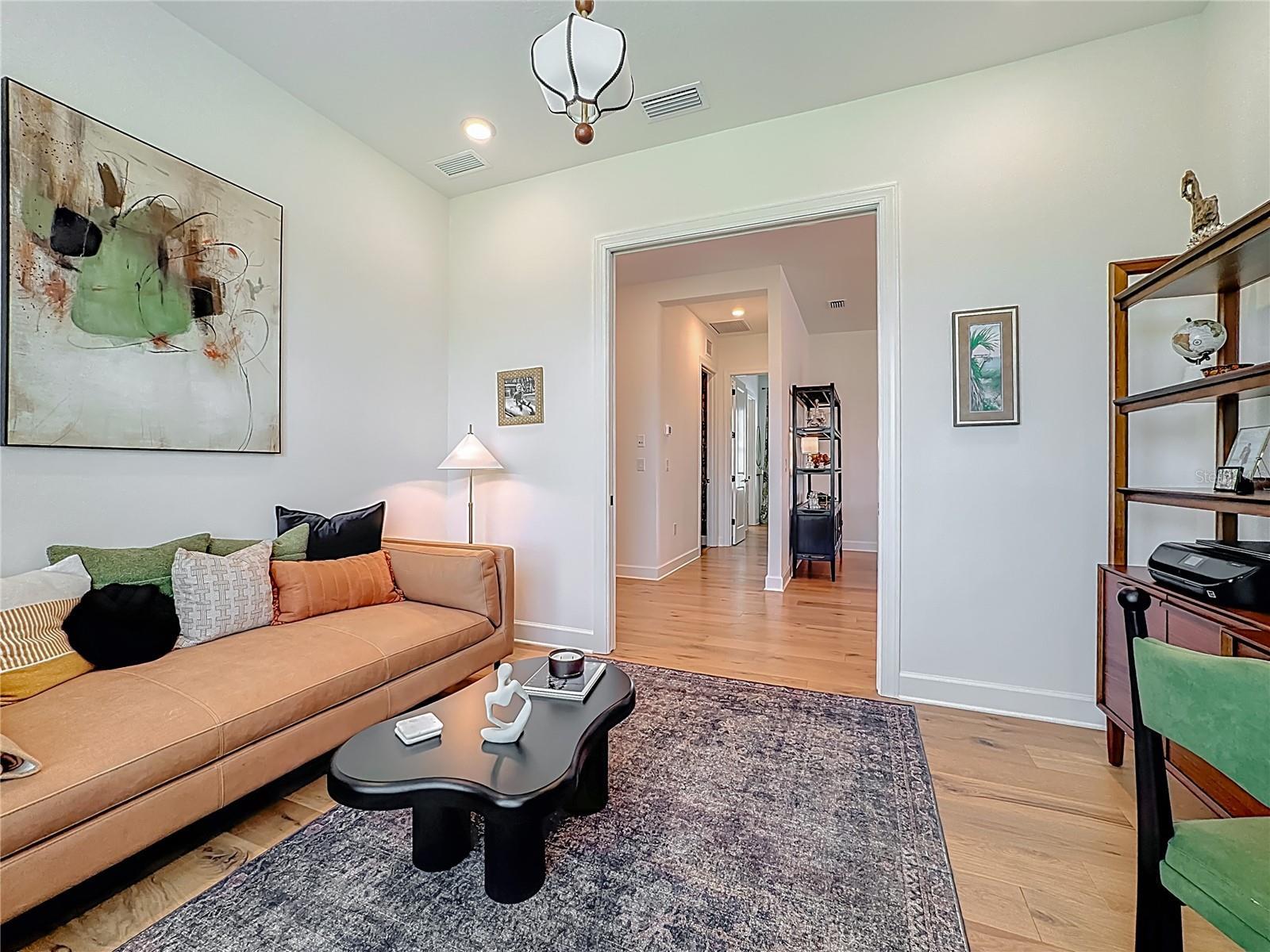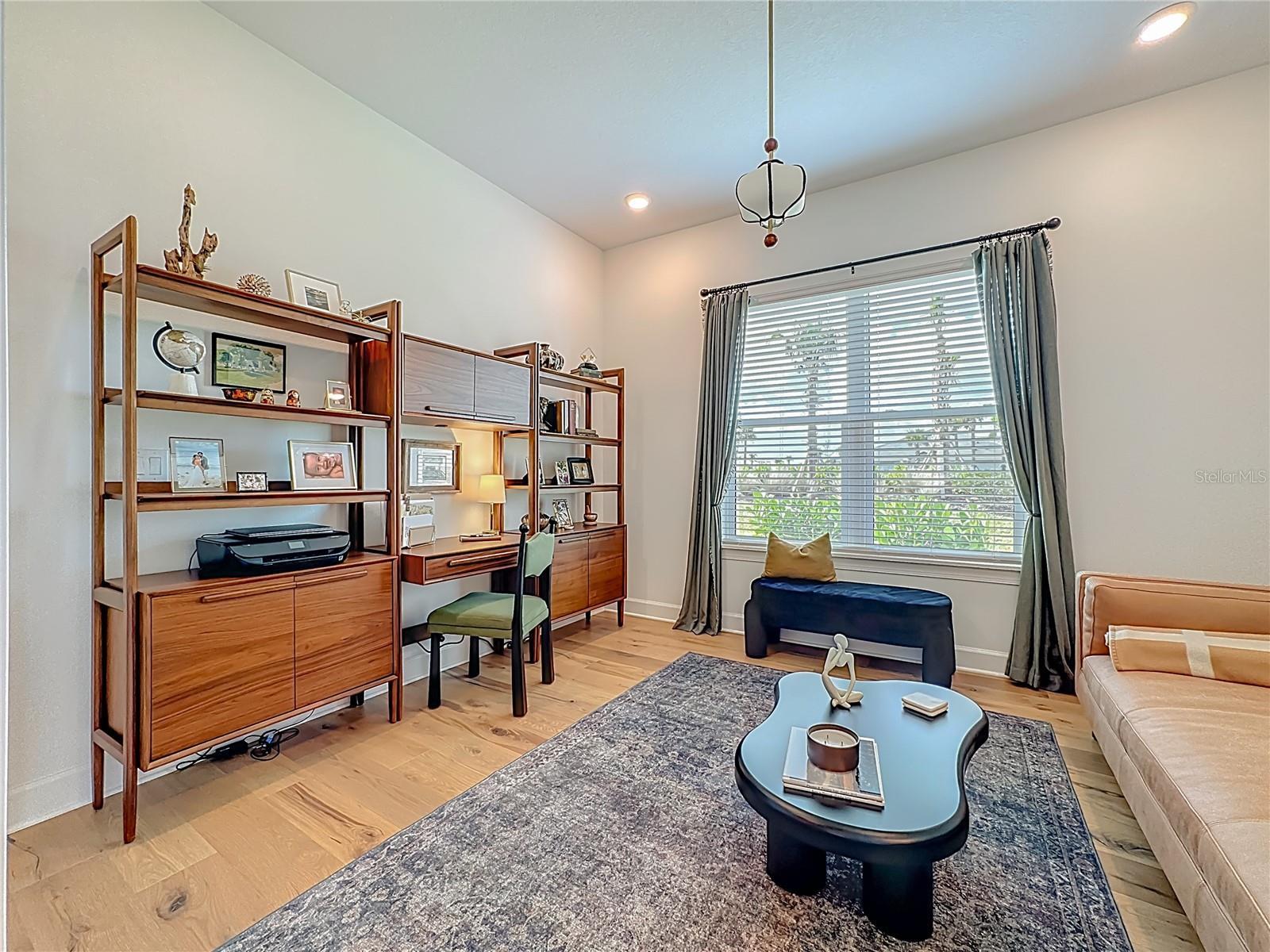 Located in the sought-after Esplanade at Azario in Lakewood Ranch, this professionally decorated single-family home on a corner lot, offers luxury living with an open, entertainer-friendly design. The home features three bedrooms, three full bathrooms, an over sized garage, and a versatile flex room/office that easily serve as a fourth bedroom. The gourmet kitchen showcases quartz countertops, upgraded cabinetry, stainless steel appliances, tile backsplash, and an oversized island with prep sink and built-in bar refrigerator. The open floor plan flows into the eat-in dining area and spacious family room with tray ceilings and large sliders that flood the home with natural light. Enjoy seamless indoor-outdoor living on the private lanai featuring a built-in outdoor kitchen, fireplace, and a heated pool and spa with sun shelf and waterfall features. The home offers two primary suites with walk-in closets and spa inspired baths with double quartz vanities and porcelain tile. Additional highlights include upgraded hardwood floors, hurricane impact windows and doors, custom window treatments and decorative wallpaper. Residents enjoy resort-style amenities including a golf course, spa, fitness center, tennis and pickleball courts, community pools, culinary center with formal and casual dining, social clubs, coffee shop, and dog parks.