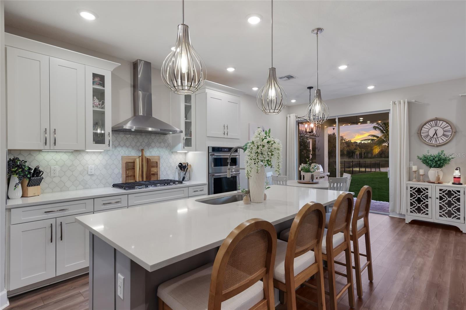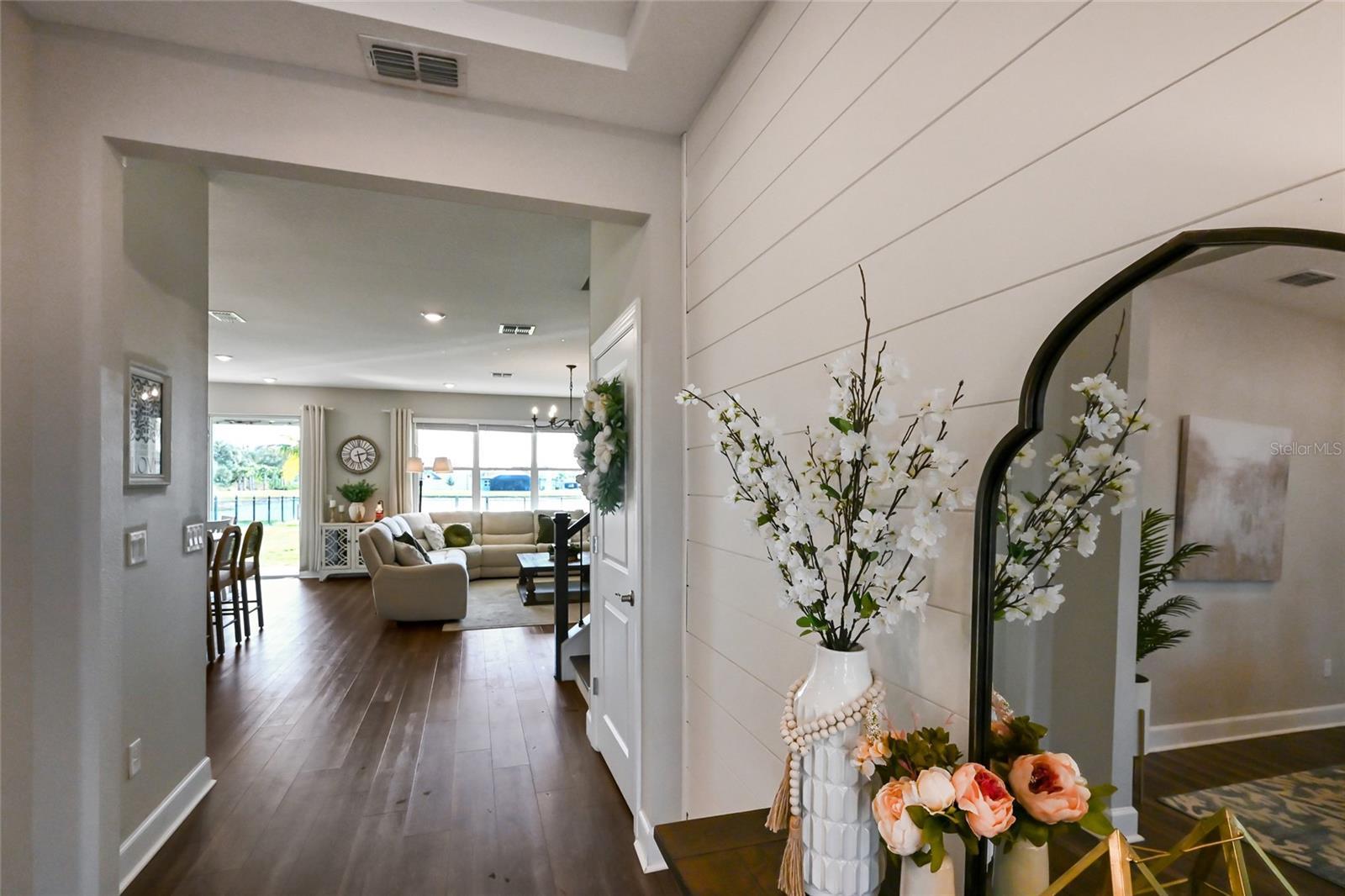 This STUNNING five bedroom, three bathroom Meritage home offers 2,988 sq. ft. of thoughtfully designed living space with a two car garage, located within the sought-after gated community of Savanna in Lakewood Ranch. From the moment you enter, you’re welcomed by a BEAUTIFUL entryway featuring TRAY ceilings and a striking modern wood ACCENT wall, setting the tone for the rest of the home. A versatile front room can be used as a FORMAL dining area or flex space and offers lovely views of the outdoors. The open concept floor plan flows seamlessly into the kitchen and living room combination, making it perfect for entertaining. The kitchen is a chef’s dream with UPGRADED cabinetry, TILED backsplash, BUILT-IN oven, cooktop, stainless steel hood, stainless steel appliances, an island with seating, modern pendant lighting, and a walk-in pantry. Just off the kitchen is a casual dining area with sliders overlooking the pond and backyard. The living room is both inviting and serene, featuring windows with lanai views and another MODERN WOOD ACCENT wall. The first floor also includes a convenient bedroom or office, along with a beautifully upgraded full bathroom featuring a modern vanity, tub/shower combo, stylish wood detailing, and DESIGNER wallpaper. LUXURY VINYL plank flooring runs throughout the entire first floor. Upstairs, updated WOOD STAIRS AND RAILINGS lead to an open media room, ideal for movie nights or a game room. The primary suite is bright and spacious, with pond views, tray ceilings, a wood accent wall, and an ensuite bath offering dual sinks and a walk-in glass enclosed tiled shower. Three additional generously sized bedrooms share a full bath with dual sinks and a tub/shower combo. The laundry room is conveniently located upstairs and includes cabinetry and a utility sink. All bedrooms feature upgraded carpet. Step outside to a PEACEFUL, fully FENCED backyard with a covered paved lanai, sealed pavers, and tranquil pond views, creating the perfect setting for entertaining, relaxing, or enjoying breathtaking sunsets. The home is enhanced by UPGRADED LANDSCAPING with PALM TREES and white STONE accents, adding to its curb appeal. A new humidifier system has also been installed. This move-in-ready home is truly a GEM, with every detail thoughtfully designed. Savanna is a fabulous community with LOW HOA resort-style amenities such as a clubhouse, swimming pool, state-of-the-art fitness center, basketball courts, playground, dog park and numerous walking paths. Lakewood Ranch is known for their A+ rated school system and is perfectly located just a short ride to downtown Sarasota, St. Pete, world class shopping, fine dining and the FAMOUS Gulf beaches! Don't wait to make this your HOME and begin your FLORIDA Lifestyle!