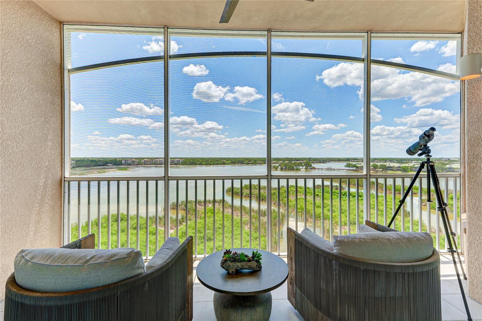 Very private and rarely available top-floor 2-bedroom plus den/office residence offering breathtaking 10+ mile panoramic views from the 7th floor in an exclusive gated waterfront community in the heart of downtown Lakewood Ranch. Enter through the private gates and enjoy the convenience of covered parking beneath the building, a private storage locker, and elevator access directly to the top floor. Upon opening the front door, you are immediately welcomed by an exceptional open floor plan and high-quality finishes throughout. The owner’s suite features awe-inspiring water and woods and golf and estuary views, creating a serene retreat to start each day. Both the owner’s suite and the family room provide access to a spacious private lanai, where you can relax and take in the abundant Southwest Florida wildlife overlooking Lake Uihlein and the Legacy Golf Course. Recent upgrades include a $30,000 custom laundry renovation with added storage and a built-in wine cooler. Additional features include impact-resistant windows and sliders, as well as a built-in fire sprinkler system for peace of mind. Community amenities are truly resort-style and include a heated lakeside pool, spa, fire pit, grilling stations, a well-equipped fitness center, and a beautiful clubhouse with catering kitchen and expansive outdoor entertaining areas. Kayak storage with lake access is also available. Lakewood Ranch Main Street is just a few hundred feet away, offering a cinema, miniature golf, boutique shopping, restaurants, and year-round entertainment. Ideally located just minutes from UTC Mall, with easy access to downtown Sarasota and Bradenton, I-75, and a short drive to the stunning beaches of Lido Key and Anna Maria Island. Be sure to view the attached live video tour and 3D walkthrough for a complete experience of this exceptional home.