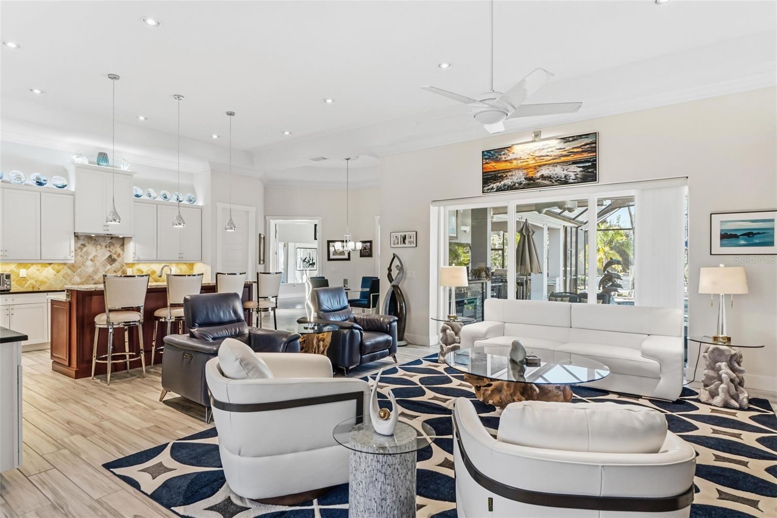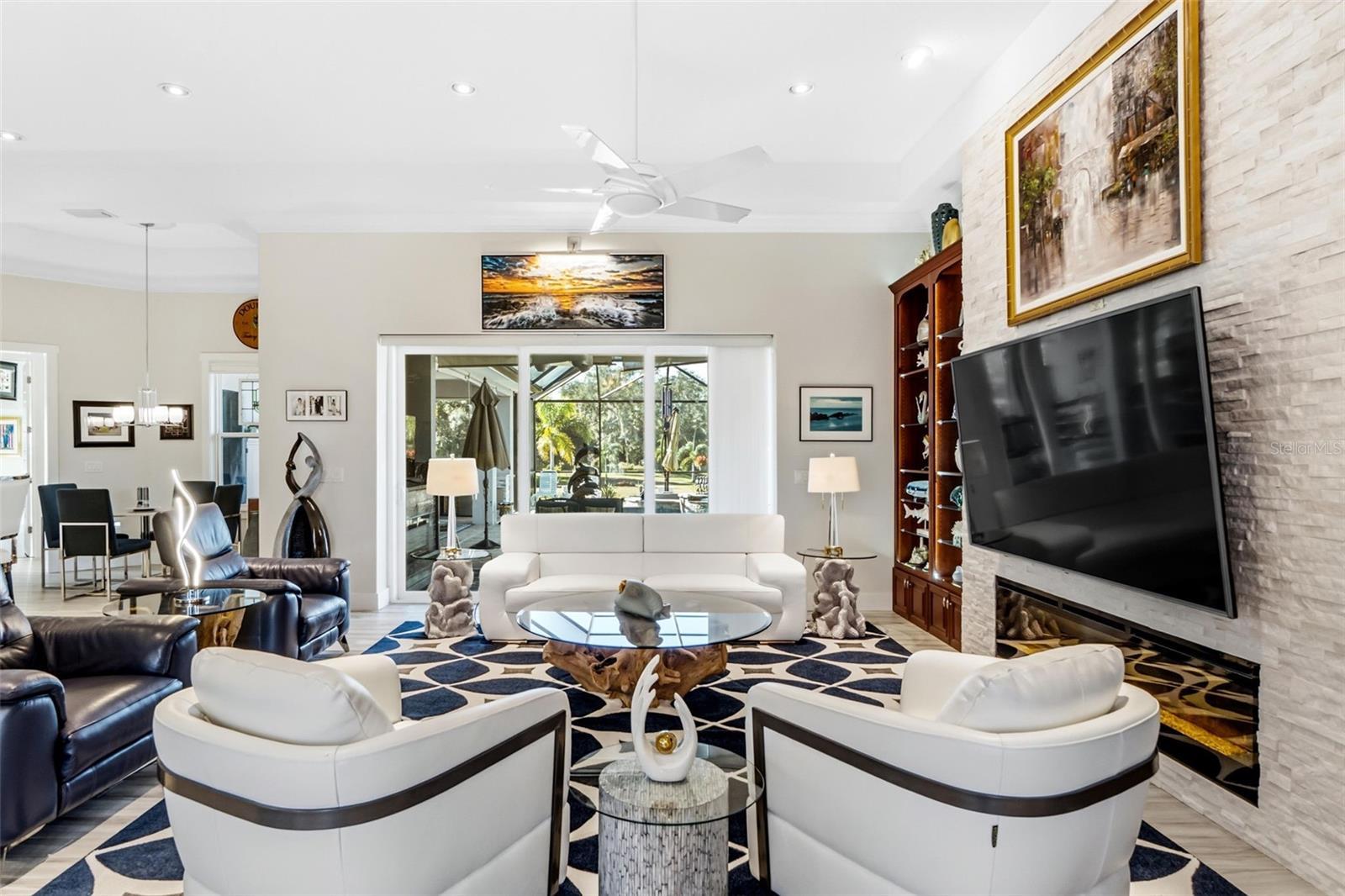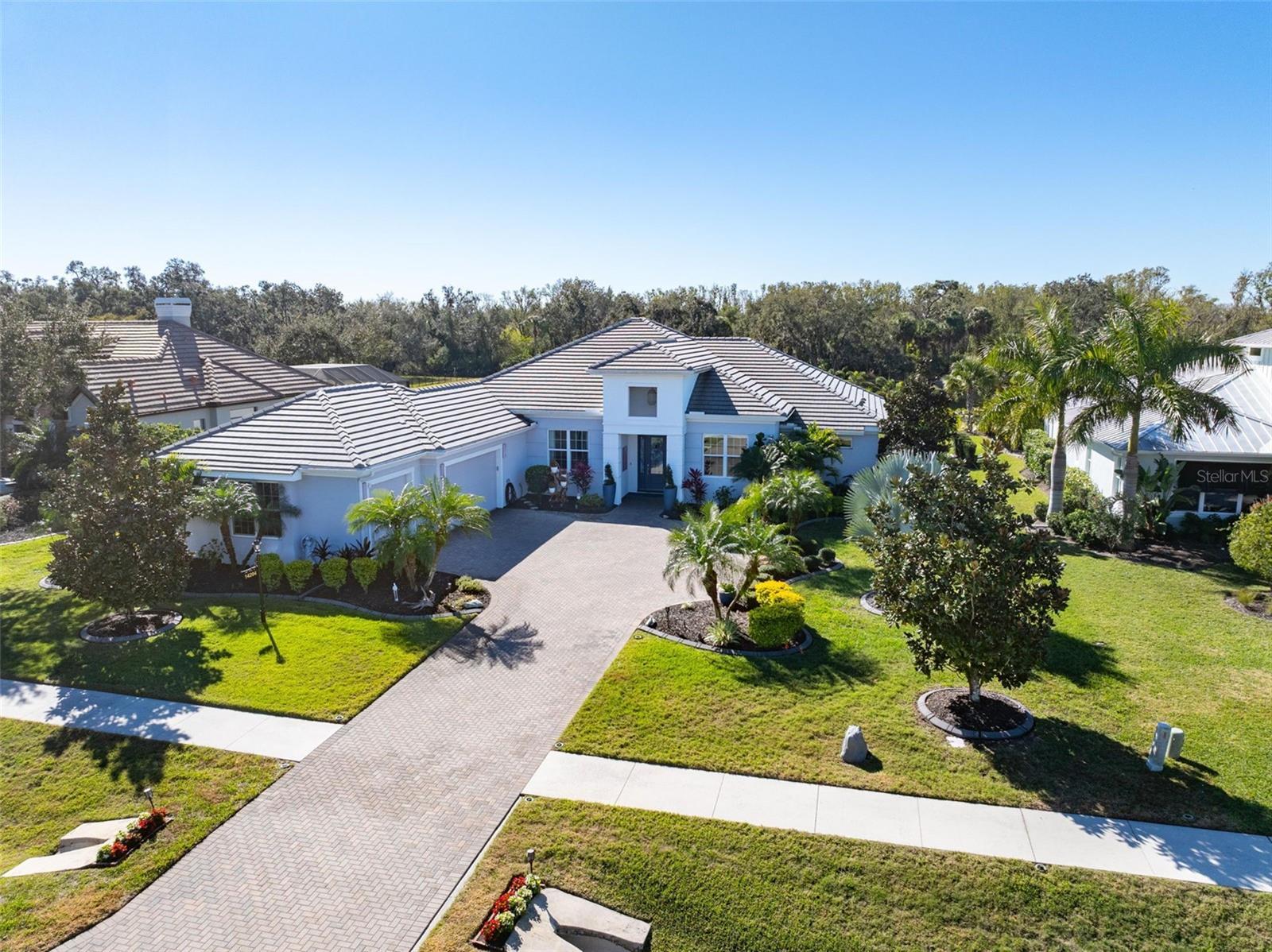 Set on a rare 40,000-square-foot estate-sized lot in the coveted Winding River community of Bradenton, this custom-built residence delivers privacy, elegance, and resort-style living at its finest. Built by Bruce Williams in 2017, the 3,402-square-foot single-family home offers three bedrooms, two and a half baths, along with a separate dining room and a dedicated office/study, ideal for today’s flexible lifestyle. The generously sized bonus room (14x36) is complete with a wood floating floor and flows seamlessly off the main living area. Designed for seamless indoor-outdoor living, the home features expansive covered living space with pocketing doors that open to a spectacular outdoor retreat. Enjoy resort-style amenities including a sparkling pool and spa, summer kitchen, covered outdoor dining area, and lush mature landscaping framing long, tranquil lake views—perfect for entertaining or quiet evenings at home. Inside, the open-concept kitchen showcases custom cabinetry, generous workspace, and flows effortlessly into the main living areas. A custom wine bar with three wine refrigerators adds a sophisticated touch for entertaining. The spacious primary suite is a private sanctuary, featuring a large double vanity, walk-in shower, and two walk-in closets. Ideally located just minutes from Lakewood Ranch and University Town Center, this exceptional home offers convenient access to premier shopping, dining, and entertainment, while maintaining the serenity of a private estate setting.