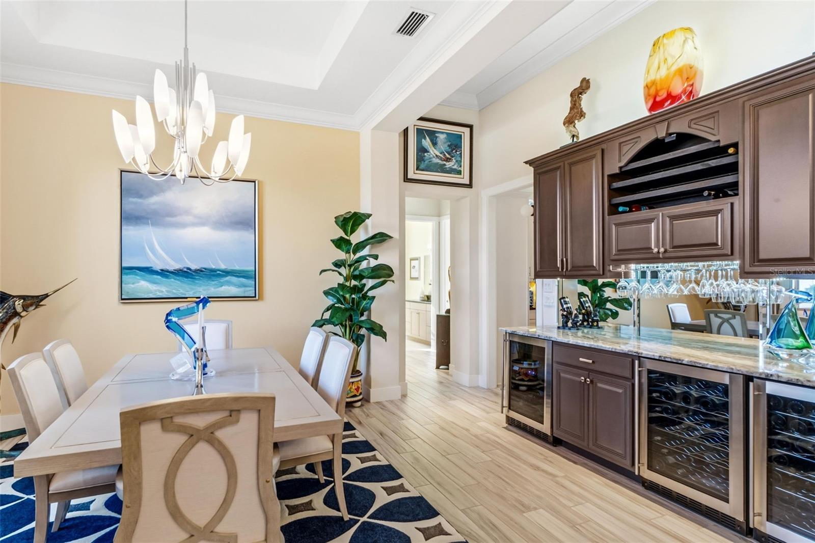 - Built-in Features, Ceiling Fans(s), Crown Molding, Dry Bar, Eat-in Kitchen, Kitchen/Family Room Combo, Open Floorplan, Primary Bedroom Main Floor, Solid Wood Cabinets, Split Bedroom, Stone Counters, Thermostat, Vaulted Ceiling(s), Walk-In Closet(s), Window Treatments