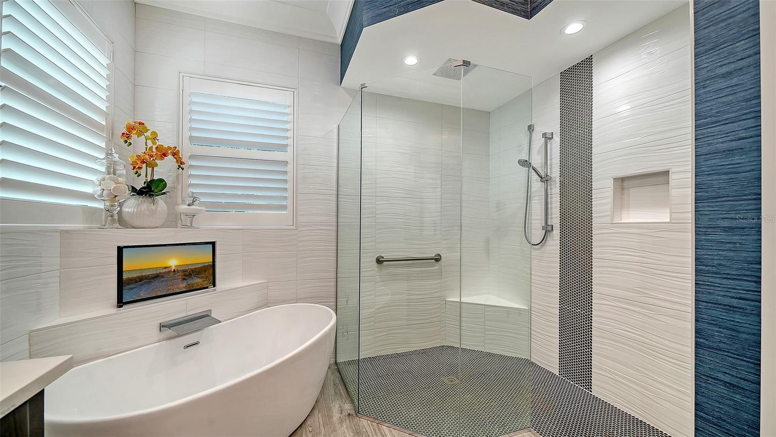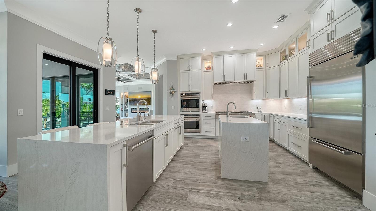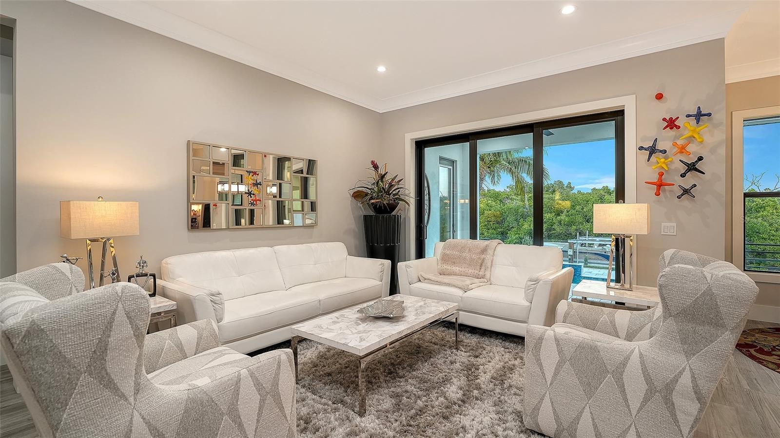 An extraordinary statement of modern coastal elegance, this custom waterfront residence built in 2018 is a masterclass in refined living, where architectural detail, craftsmanship, and setting converge in the coveted enclave of Siesta Cove. Framed by sweeping water views and constructed with hurricane-rated windows and doors, the residence offers both elevated design and enduring peace of mind. Spanning five bedrooms and six full bathrooms, the home is thoughtfully curated for effortless luxury. The primary en-suite retreat on the main level provides a private sanctuary, while light-filled interiors and tranquil water vistas create a seamless connection to the outdoors from nearly every room. The great room commands attention with intricate ceiling artistry, custom built-in shelving, and a sleek electric fireplace—an inviting yet dramatic centerpiece for both intimate evenings and grand entertaining. A temperature-controlled walk-in wine cellar and elegant wet bar elevate the experience further. At the heart of the home, the kitchen is a vision of light and sophistication, featuring new designer Cambria countertops (Wolf & Subzero appliances) including double ovens, built-in refrigerated drawer and a built-in freezer drawer, a generous walk-in pantry, and a welcoming eat-in layout complemented by an adjacent breakfast bar. Plantation shutters and discreet electric blinds throughout the home enhance the ambiance with effortless control of light and privacy. A richly appointed den or office behind French doors offers quiet refinement, while a sweeping staircase ascends to an upper level designed for both comfort and indulgence. Here, a spacious bonus room opens to a private screened balcony, ideal for sunrise reflections or sunset cocktails. Four additional bedrooms include three luxurious en-suite accommodations and a fourth with a dedicated full bath just beyond. One suite is distinguished by its own wet bar with refrigeration for morning coffee or evening refreshment, along with custom built-in closet drawers—an unexpected touch of indulgence. The outdoor living experience is nothing short of resort-caliber. A sparkling pool and spa, enhanced by a new electric pool heater, are complemented by an outdoor shower, built-in grill, and beverage cooler—creating a private oasis for entertaining under the stars. Boaters will appreciate the 39-foot private dock with water, electric, and lift, just moments (only 3 properties away) from the Intracoastal Waterway. Additional features include an elevator servicing all levels from the oversized three-car garage, abundant storage, a fully fenced yard, and lush, mature landscaping that envelops the property in privacy and beauty. Perfectly positioned near world-class beaches, upscale shopping, and fine dining, this exceptional Siesta Cove residence is more than a home—it is a lifestyle defined by grace, comfort, and uncompromising waterfront luxury.