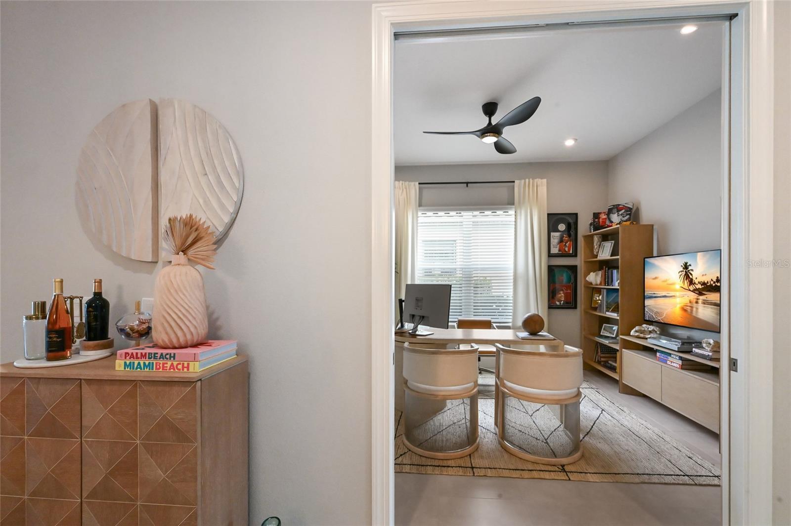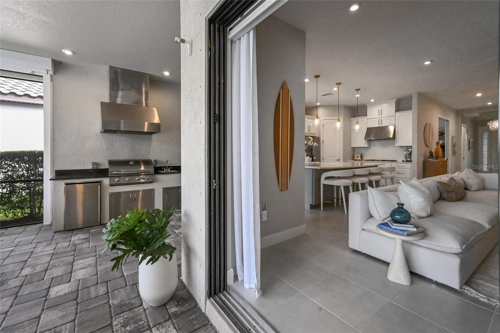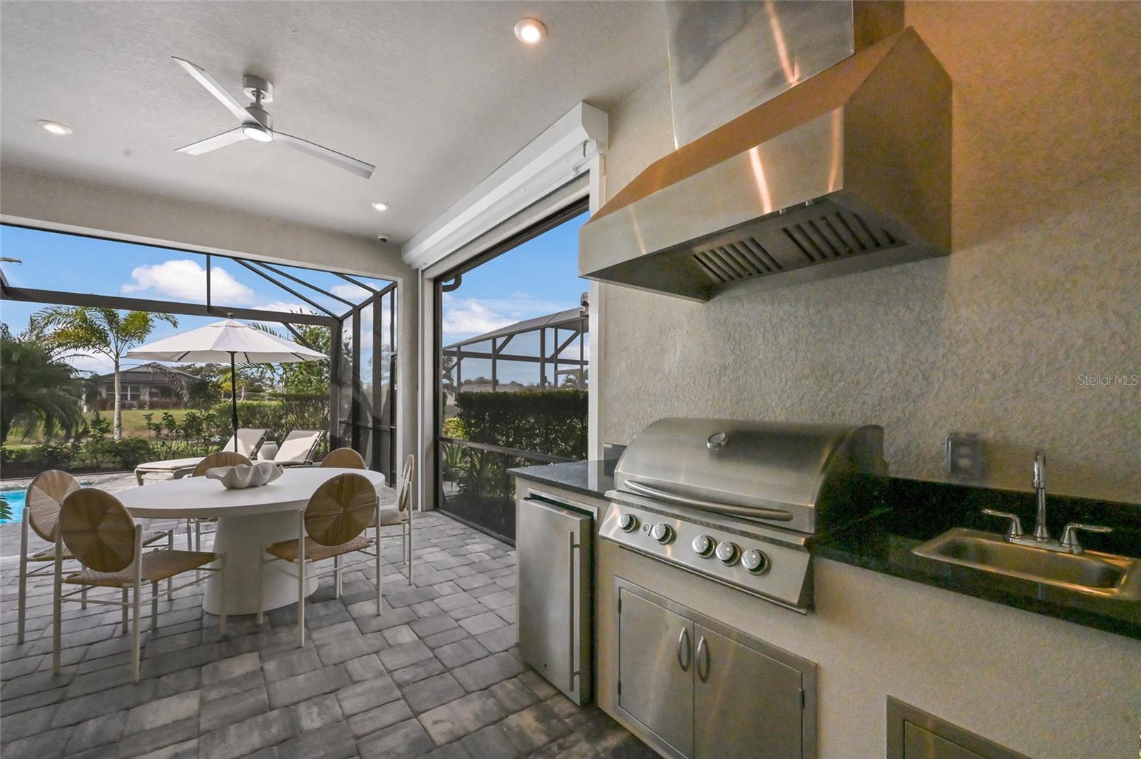 Located within Esplanade at Azario, one of Lakewood Ranch’s premier resort-style communities, this impeccably maintained three-bedroom, three-bath home with a private office offers an open floor plan and is thoughtfully equipped for both comfort and peace of mind, including a whole-house generator, impact windows and door at the front of the home, and motorized hurricane roll-down shades on the lanai; A neutral palette flows throughout the residence, which features quartz countertops throughout, custom-organized closets, ceiling fans in every room, a tankless water heater, and an oversized laundry room with cabinetry, utility sink, and laundry folding counter. The beautifully extended lanai is ideal for year-round enjoyment, showcasing a generous pool, panoramic screen enclosure, and a fully equipped outdoor kitchen with vented hood, while a four-foot garage extension and landscape lighting in both the front and rear enhance everyday functionality and curb appeal. This home features lower HOA fees as it does not include a deeded golf membership; however, annual golf passes are available. Residents enjoy access to the Azario amenities center featuring a Culinary Center, championship golf, heated lagoon-style pool, wellness spa, fitness center, tennis and pickleball courts, and a full social calendar, all conveniently located near Lakewood Ranch Main Street, Waterside, University Town Center, downtown Sarasota, I-75, beaches, shopping, dining, schools, and medical facilities.
