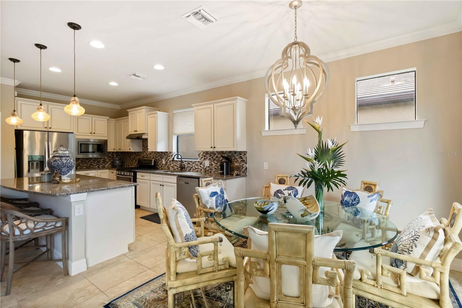 - Ceiling Fans(s), Crown Molding, Eat-in Kitchen, Kitchen/Family Room Combo, Solid Surface Counters, Stone Counters, Window Treatments
