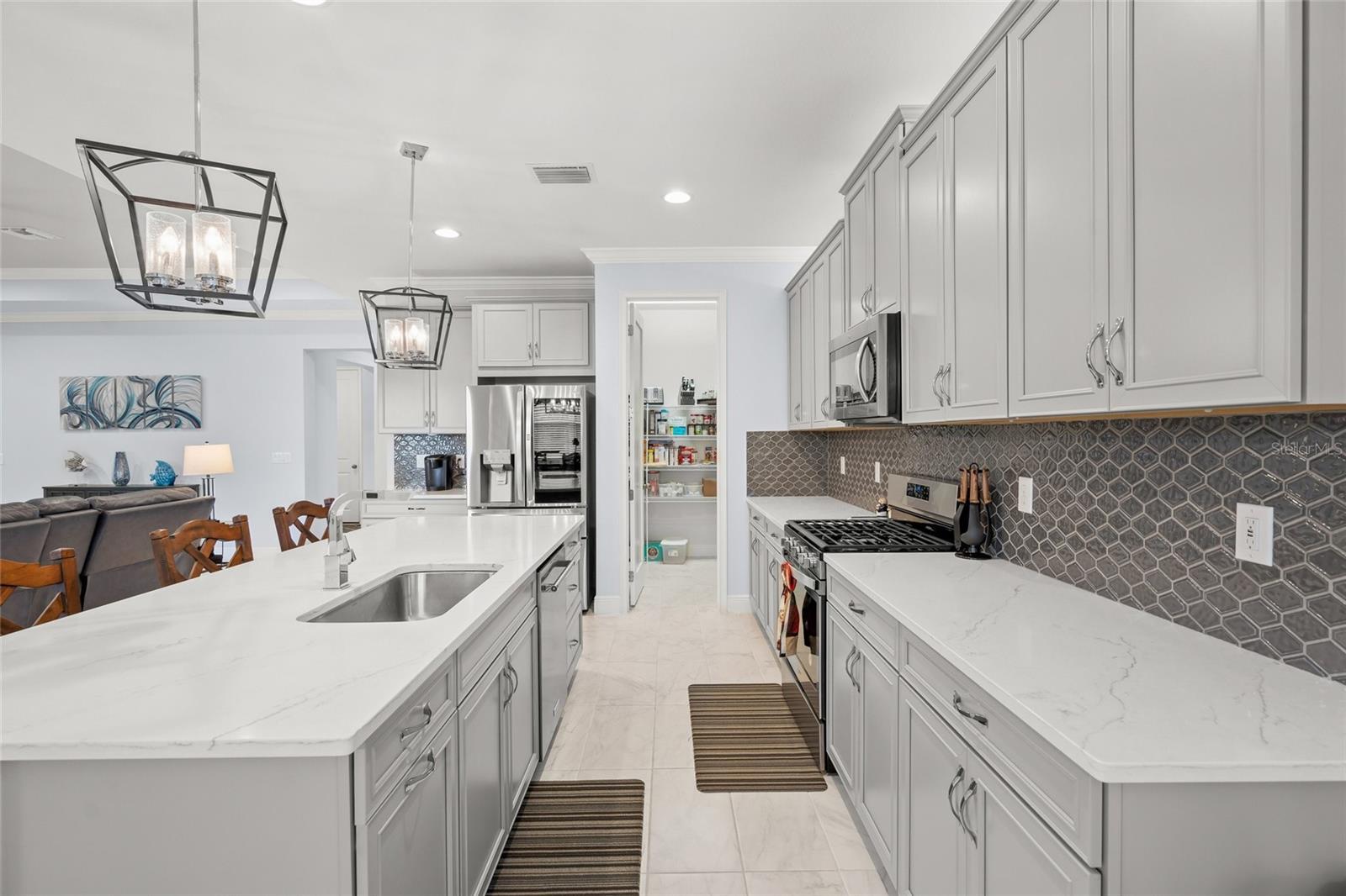 Fall in love with refined coastal living in this exceptional, sun-filled residence located within the amenity-rich, gated community of Sunrise Preserve at Palmer Ranch. This impeccably upgraded 2,489-square-foot home offers 3 bedrooms, 3 full baths, a den/study, and a 3-car garage, along with over $100,000 in premium enhancements beyond the builder’s upgrades—a rare opportunity for discerning buyers seeking luxury, comfort, and peace of mind. Thoughtfully designed with elegance and functionality in mind, the home showcases polished details throughout. Ideally positioned just steps from the clubhouse, fitness center, resort-style pool and spa, pickle ball, tennis, bocce ball, BBQ areas, and social gathering spaces, this maintenance-free community delivers an unparalleled lifestyle in one of Sarasota’s most sought-after neighborhoods. Built for both full-time and seasonal living, this home remained high and dry during hurricane season and is equipped with exceptional safety and efficiency features, including a whole-house natural gas generator, accordion hurricane shutters, impact-rated glass front door, gas appliances, and a high-efficiency 20 SEER HVAC system—offering security, reliability, and year-round comfort. The welcoming front entrance opens to a wide, open-concept layout with 9–10-foot ceilings, 8-foot doors, tray ceilings, and crown molding, creating a sense of spacious elegance from the moment you arrive. Tile flooring flows seamlessly, enhanced by curated designer touches such as custom feature walls in the living room, kitchen island, and primary suite, upgraded lighting, window treatments and ceiling fans in every room—perfect for entertaining or everyday living. The screened-in lanai—finished with tile flooring—creates an inviting indoor-outdoor living space ideal for relaxing or hosting guests. Additional landscaping provides privacy and enhances the tranquil setting. The spacious primary suite is a true retreat, offering a large walk-in closet and a luxurious en-suite bath with split dual vanities, premium granite countertops, and an oversized walk-in shower with dual shower heads. A split floor plan ensures privacy for guests, with two additional bedrooms—including one with a private en-suite bath—and a versatile office or den featuring elegant double French doors. The well-appointed laundry room includes built-in cabinetry and a utility sink, while the three-car garage offers storage racks and added functionality. Additional upgrades include a walk-in shower in the guest en-suite, extra cabinetry in the bar area and laundry room, whole-house water filtration and softening system, natural-gas-connected grill (no tanks required), and more. With NO CDD fees, Sunrise Preserve’s low HOA covers full community and individual landscaping, irrigation, and access to an impressive suite of resort-style amenities. The neighborhood is also large-pet friendly, adding to its appeal. Located in one of America’s most desirable small cities, Sarasota, FL offers an exceptional lifestyle—home to world-renowned Siesta Key Beach, boating, fishing, kayaking, golf, live music, farmer’s markets, fine dining, shopping, cultural and performing arts, Mote Marine Laboratory, the Ringling Museum, convenient airports, and easy access to professional sports and entertainment in nearby Tampa Bay. This extraordinary home blends luxury, security, and resort-style living—an exceptional opportunity for the buyer who wants it all.