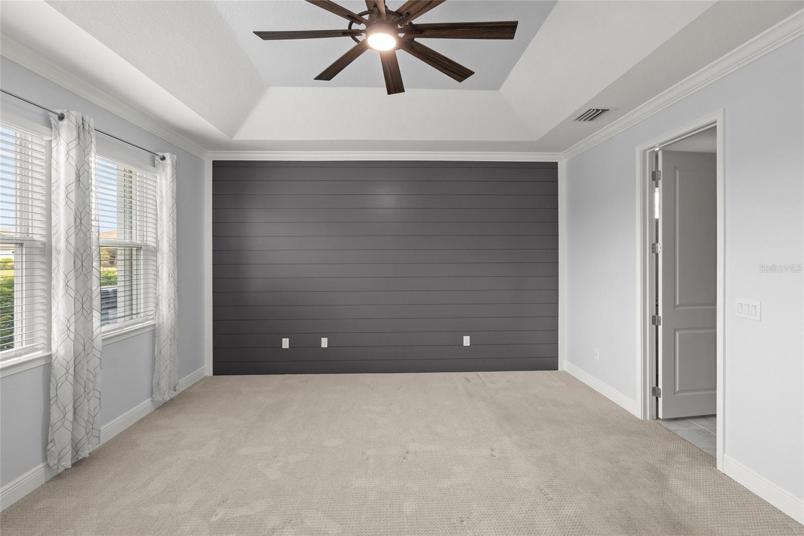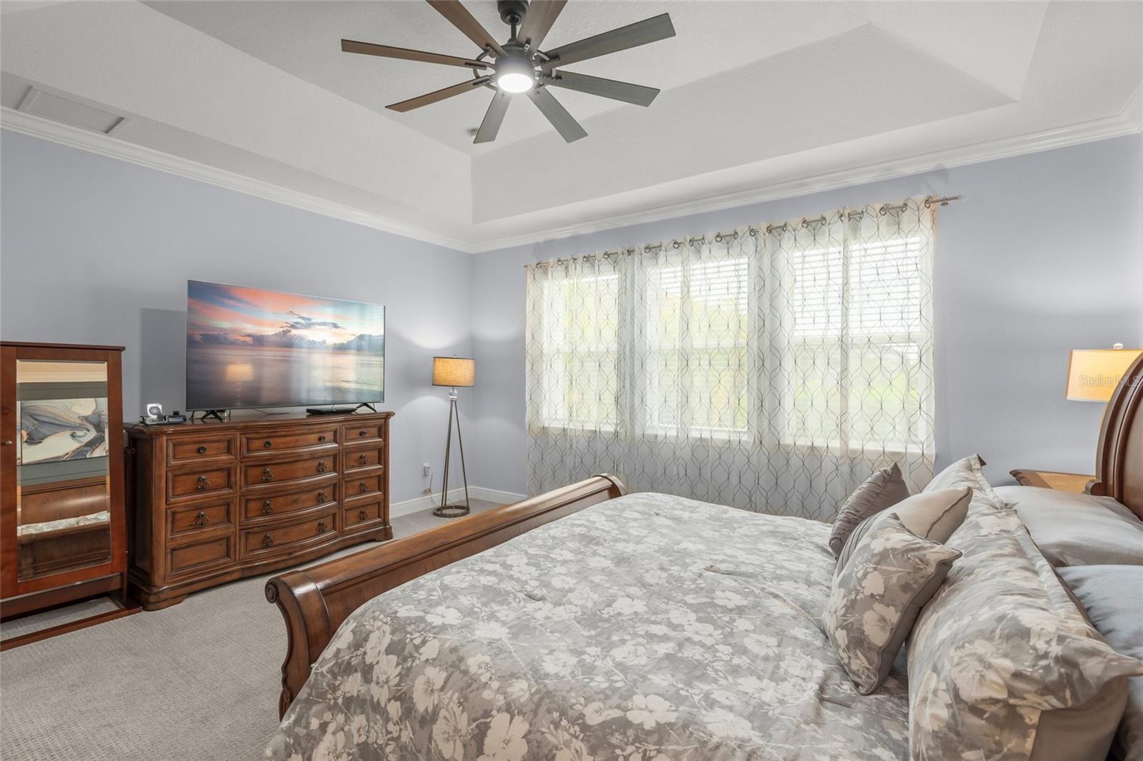 - Ceiling Fans(s), Crown Molding, Eat-in Kitchen, High Ceilings, In Wall Pest System, Kitchen/Family Room Combo, Open Floorplan, Solid Surface Counters, Tray Ceiling(s), Walk-In Closet(s), Wet Bar, Window Treatments
