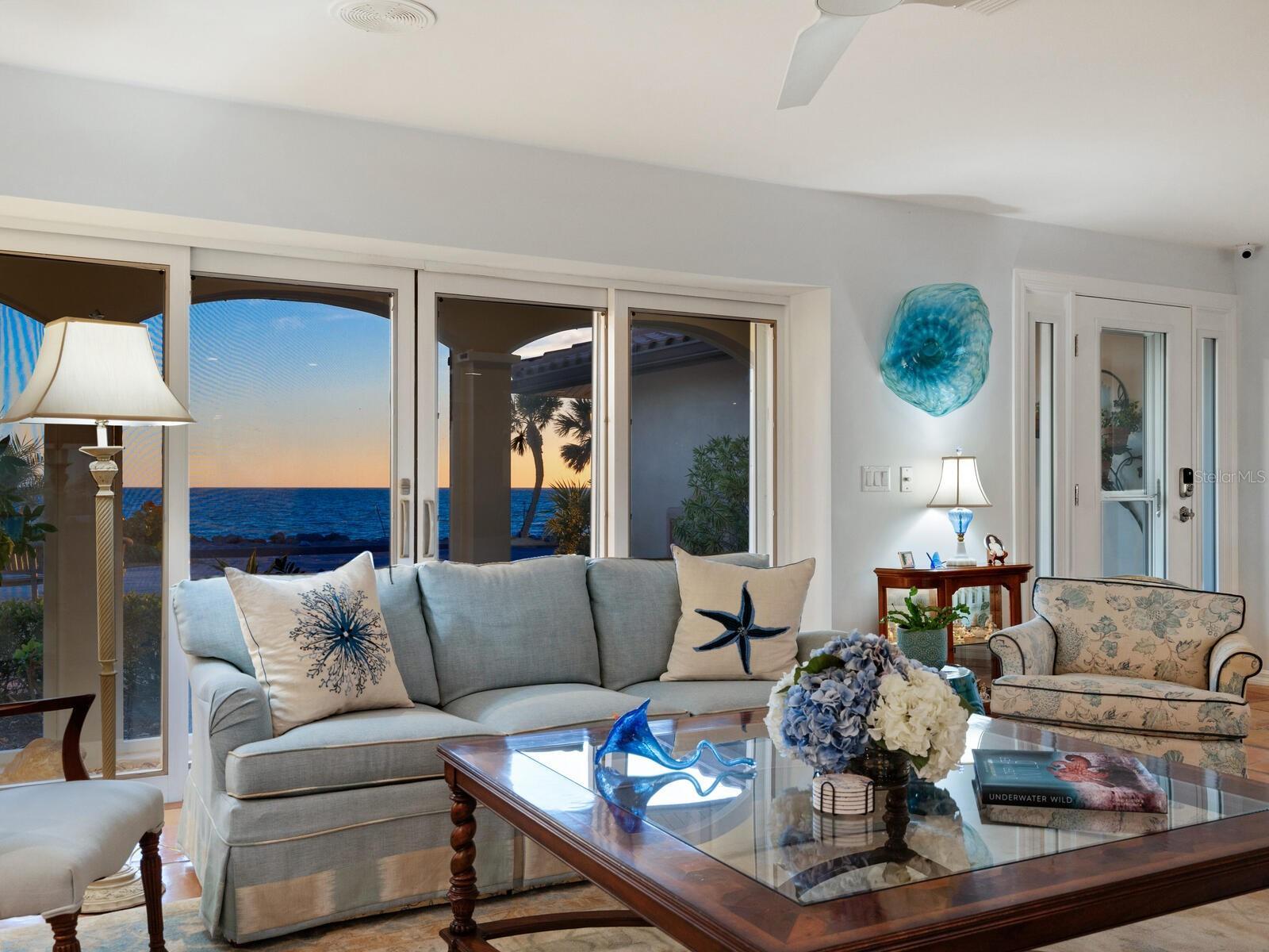 This captivating Gulf-to-Bay residence is the epitome of timeless coastal elegance. Begin your mornings on the lanai, coffee in hand, as the sun rises over the Intracoastal Waterway. Spend your days boating from the private bayside dock and your evenings on your stretch of sandy beach, where spectacular Gulf sunsets are a nightly ritual. Inside, expansive light-filled interiors frame breathtaking water views in nearly every room. The main living area enjoys bay and beach vistas, while a beachside family room and generously sized guest bedrooms easily accommodate king-sized furnishings. The kitchen is designed as a gathering place, complete with abundant beverage and wine refrigeration—ideal for effortless entertaining. The entire second level is devoted to a luxurious primary retreat, offering panoramic Gulf and bay views from a private beachside balcony and a bayside deck. The spa-inspired en-suite bath, finished in crisp coastal whites and blues, provides a tranquil setting with serene Gulf views. Designed for outdoor living, the backyard is a private tropical sanctuary featuring a large screened pool and spa, a covered stone lanai, expansive sun deck and an outdoor kitchen worthy of a Food Network showcase. Premium upgrades provide peace of mind, including a Kohler generator, new tile roof, hurricane-braced garage doors, impact-resistant windows and an automatic pool cover. On tranquil Casey Key, a quiet barrier island in South Sarasota, this exceptional home offers convenient access to world-class dining, shopping, golf, tennis, and the charm of downtown Venice and Sarasota. Whether arriving by private or commercial air, this is Florida living at its most refined.