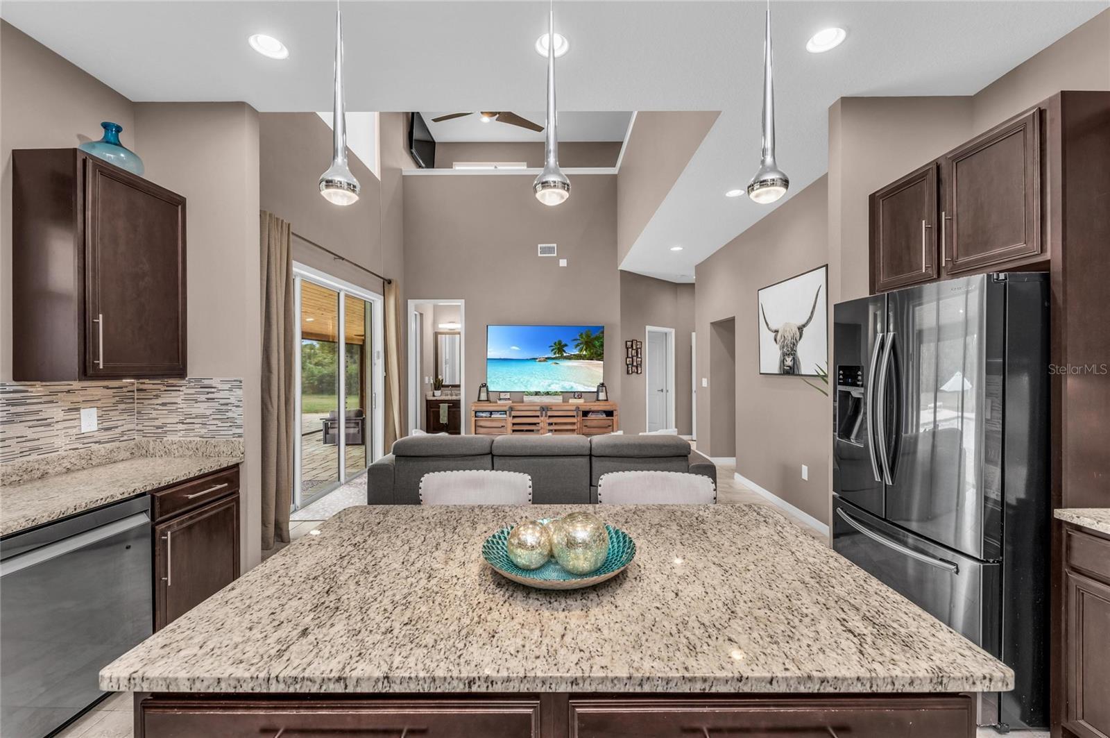 - Ceiling Fans(s), High Ceilings, Kitchen/Family Room Combo, Open Floorplan, Primary Bedroom Main Floor, Stone Counters, Thermostat, Vaulted Ceiling(s), Walk-In Closet(s), Window Treatments