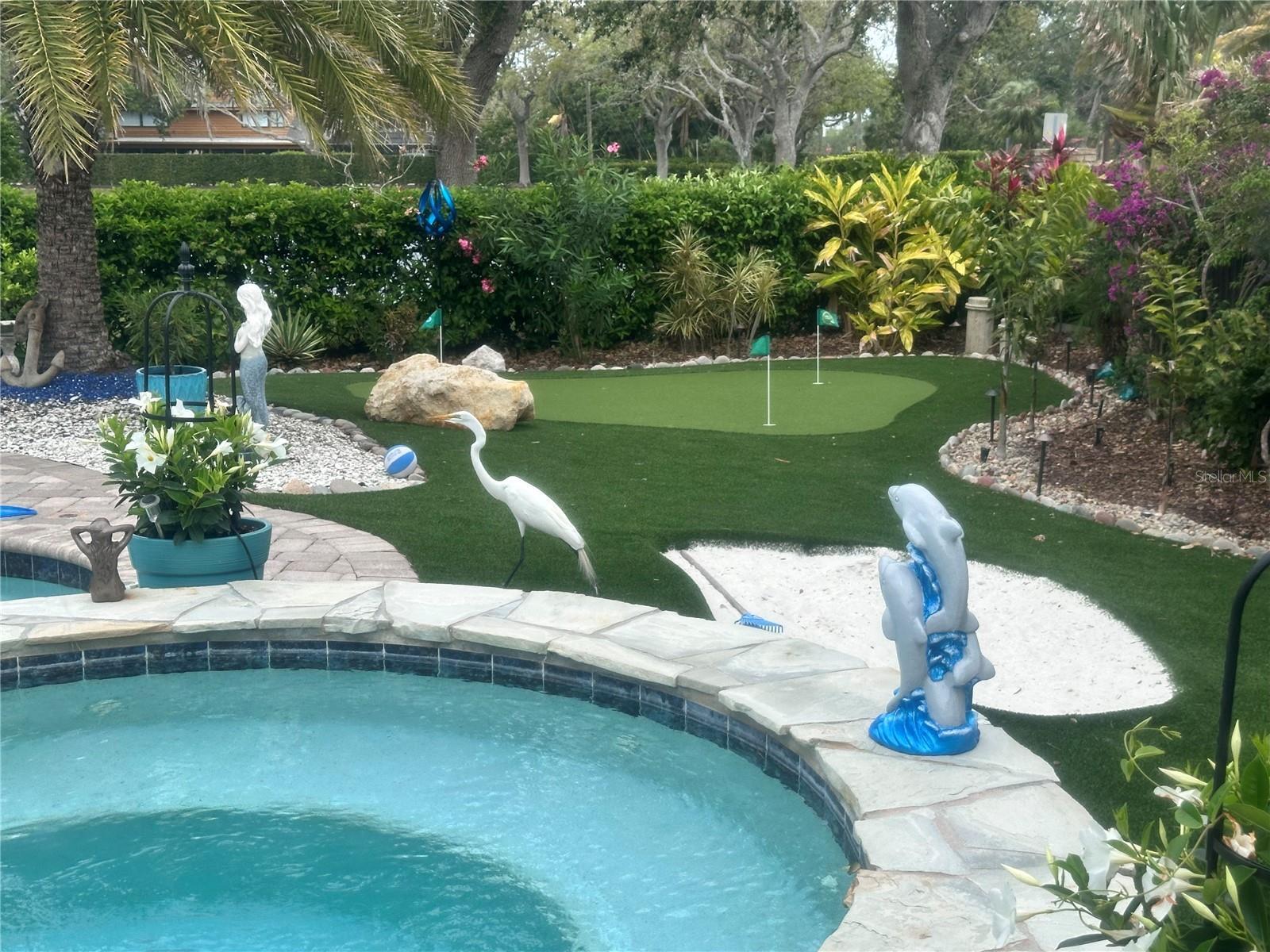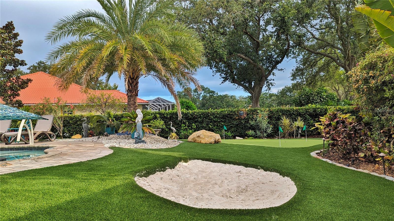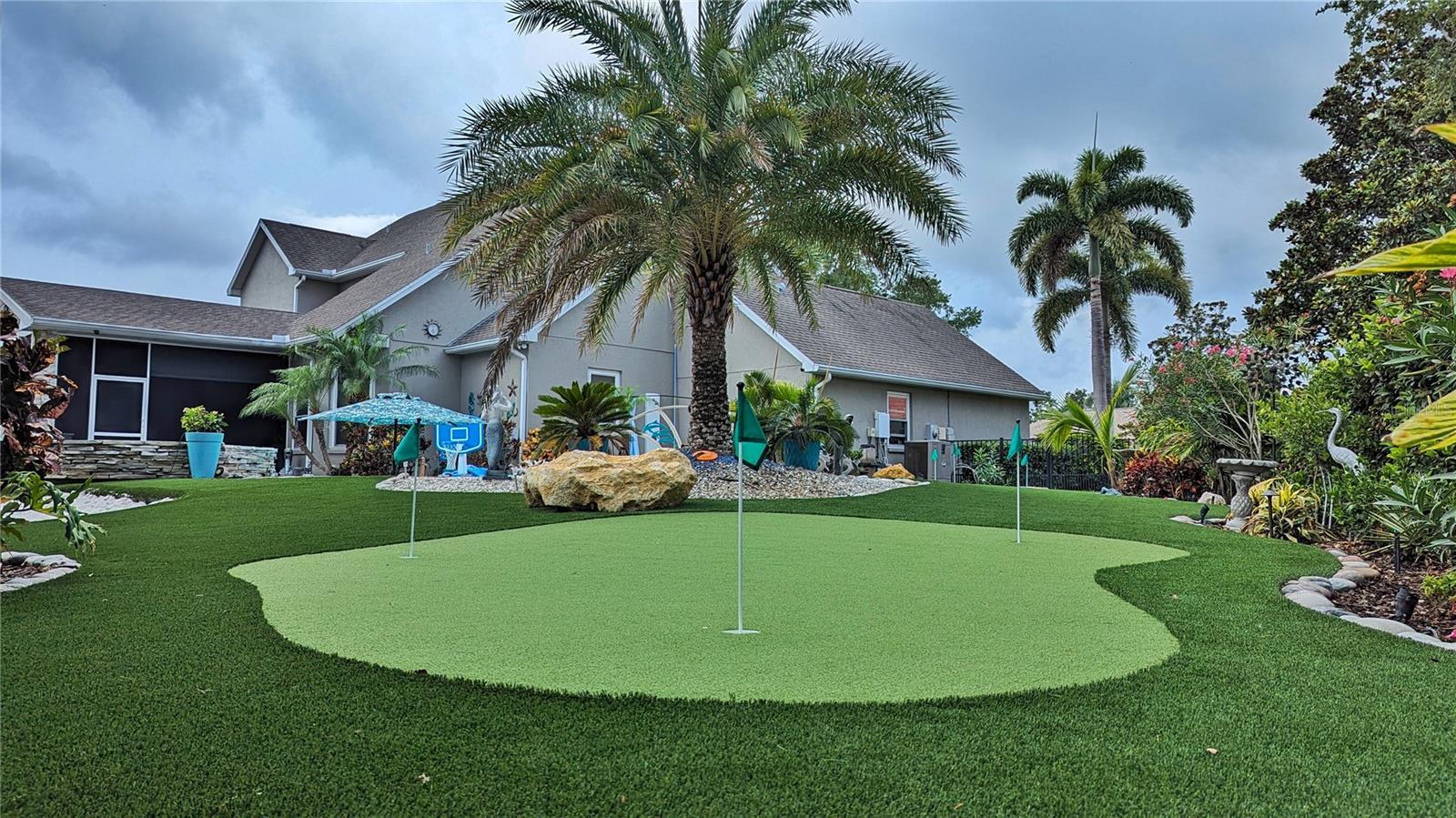 Located in the desirable Rivers Ridge Community, this stunning single-family residence is set within a fully brick-walled, gated neighborhood with an open entrance, offering both privacy and curb appeal. This solid block construction home features a new shingle roof (2025) and an exceptional layout with 4 bedrooms plus a versatile bonus room ideal for a bedroom, office, or flex space, and 3.5 bathrooms. The interior showcases hardwood flooring throughout, complemented by a spacious family room with a fireplace and surround sound speakers, perfect for entertaining. The chef’s kitchen features custom dark cherry wood cabinetry, high granite countertops, stainless steel appliances, and tile flooring, seamlessly connecting to an attached breakfast room and a generously sized formal dining area.Outdoor living is truly unmatched. The fully fenced backyard is a private retreat featuring a saltwater pool with electric heater, a gas-heated spa, and an expansive four-green putting course covering the entire backyard. A large screened-in lanai includes a built-in outdoor kitchen with grill, IBTU burner, refrigerator, sink, and fireplace, ideal for year-round enjoyment. Two storage sheds add convenience and functionality. Perfectly located near beaches, shopping, schools, and parks, this home offers luxury living with exceptional indoor and outdoor amenities. More pictures to follow soon
