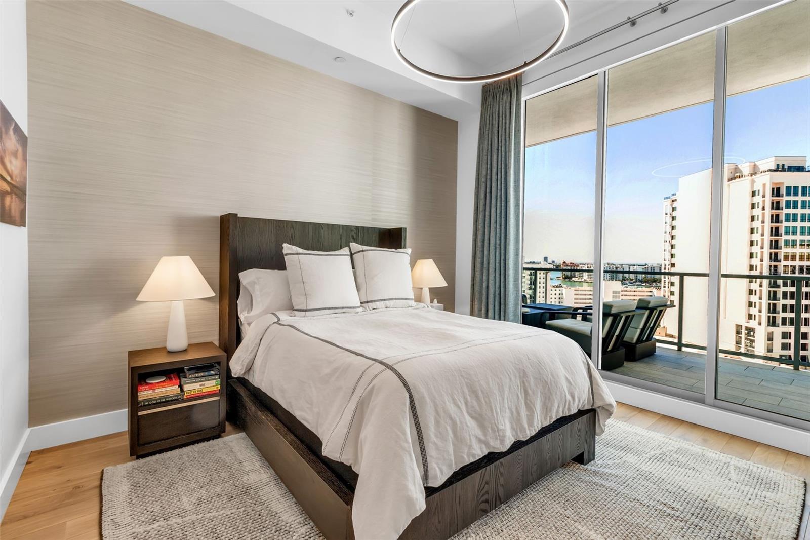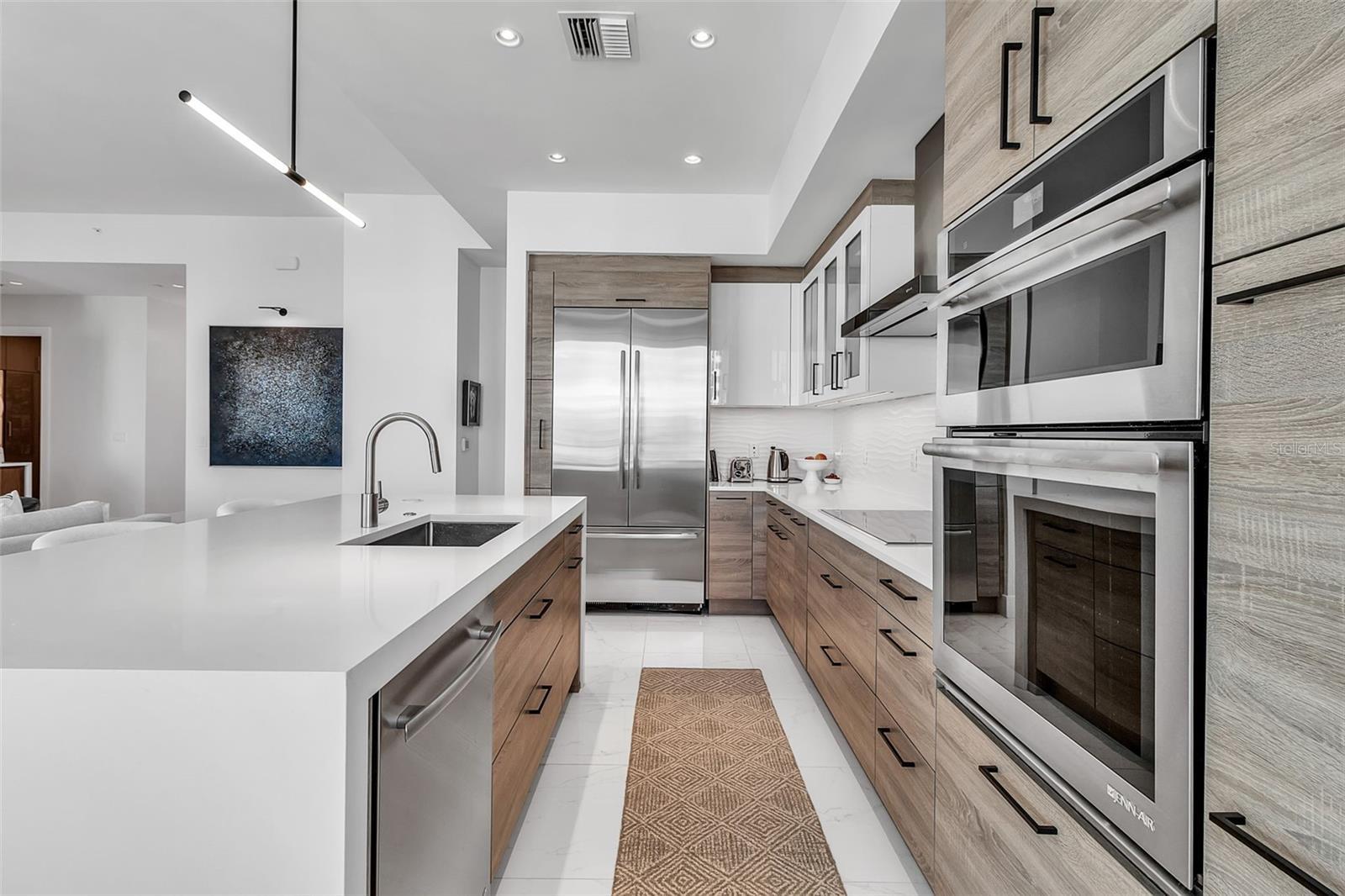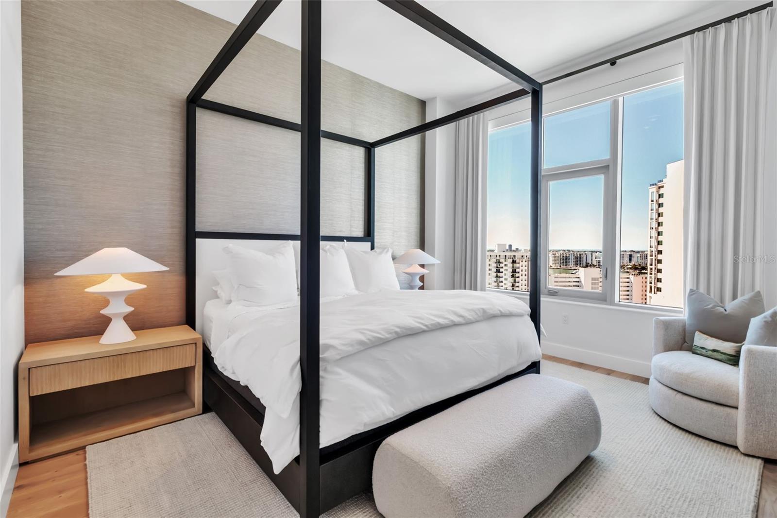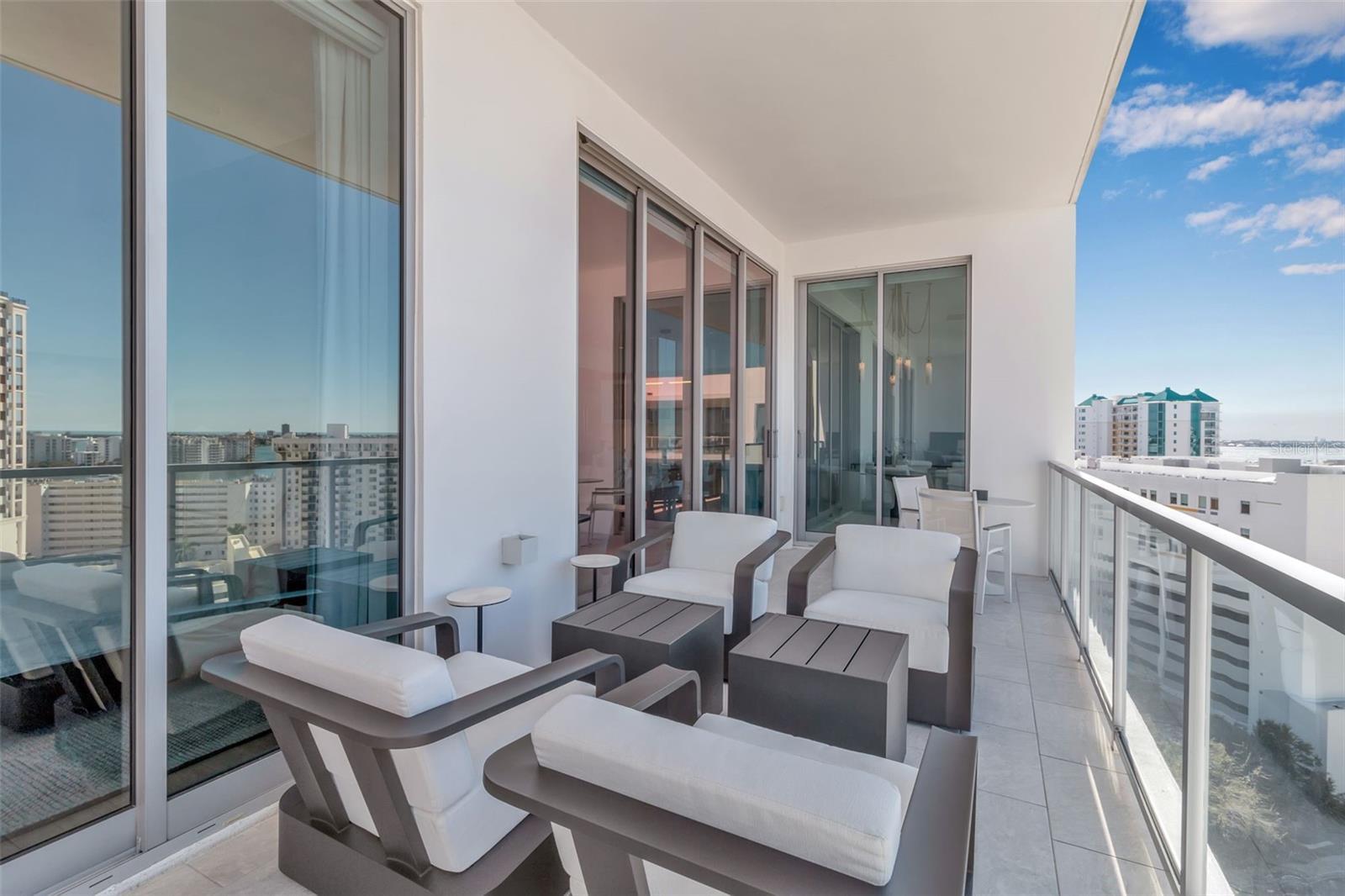Penthouse level at The Mark Sarasota, featuring complete cosmetic renovation by the owners. Enjoy sweeping west-facing views of Sarasota Bay and downtown Sarasota from this refined residence offering 2,485 square feet under air plus 342 square feet of terrace space, for a total of 2,827 square feet. The thoughtfully designed split-bedroom floor plan includes three en-suite bedrooms, a den/office, three full baths and one-half bath, with a private primary suite wing. Timeless in design, the gourmet kitchen is appointed with Nolte European cabinetry, JennAir stainless steel appliances, upgraded induction range, quartz countertops with a new 6-cm waterfall island and a modern tile backsplash, ideal for entertaining. Open-concept living and dining areas feature soaring 11-foot ceilings, floor-to-ceiling glass and large-format porcelain tile flooring, creating a bright, architecturally refined interior. An expansive west-facing terrace extends the living space outdoors with a built-in grill and beverage refrigerator, ideal for sunset dining. The primary suite is a luxurious retreat with two walk-in closets and a spa-inspired bath offering an oversized double vanity, quartz countertops, walk-in shower and soaking tub. Two guest en suites include generous closets, while the den off the foyer serves as an ideal home office. New Legno European white oak oil-waxed floors enhance all bedrooms. Additional highlights include all-new lighting fixtures throughout, new full-length mirrors in all bedrooms, new bath glass shelving and hardware, a large laundry room with utility sink and new floor-to-ceiling custom cabinetry, a new smart Lutron system controlling lighting and shades, and a new custom wet bar with Sub-Zero beverage drawers and a Scotsman ice maker. Enjoy abundant natural light and glowing Sarasota Bay sunsets overlooking the tropical pool deck. Two deeded parking spaces, with EV charging, plus a climate-controlled storage unit just a short distance from the residence. The fifth-floor amenity level offers a resort-style heated saltwater pool and spa, fire pit, lounge areas, grilling pavilion, bar, club room with catering kitchen, billiards, newsroom, and a premier fitness center with yoga and spin studio. In the heart of downtown Sarasota, enjoy walkable access to top-rated restaurants, Saturday Farmers Market, galleries, salons, cultural venues, Marina Jack and Lido Beach just over the Ringling Bridge. With 24-hour concierge service, secure access, on-site management and pet-friendly living, this residence delivers effortless luxury and coastal sophistication at one of Sarasota’s desired addresses.