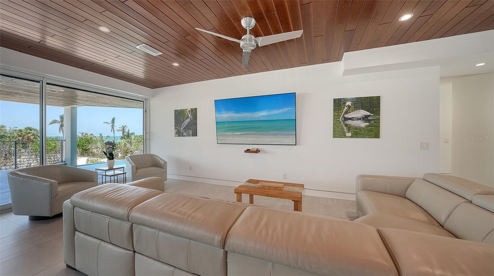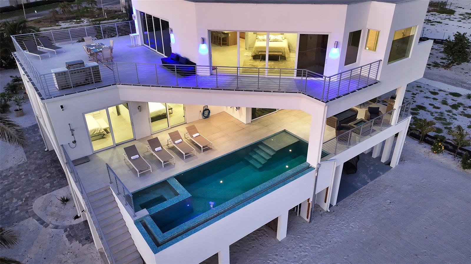 One or more photo(s) has been virtually staged. Welcome to a once-in-a-lifetime opportunity to own a sleek, modern coastal estate on one of Longboat Key’s most coveted stretches of sand. Perfectly situated on a rare double lot on the beach side of Gulf of Mexico Drive, this architectural gem incorporates uninterrupted, panoramic views of the Gulf. This completely turnkey furnished 4,420 square foot home has 4 bedrooms, 5 bathrooms and includes many upgrades showcasing incredible style. With nothing ever to be built in front, those golden sunsets and turquoise seas can be yours to savor forever. Built in 2021 with no expense spared, this home is a fortress of strength. Designed for durability by a structural architect, this home is constructed entirely of concrete utilizing sheer walls and concrete block combined with over-engineered pilings for peace of mind. Reglet trim has been achieved by utilizing metal steel framing , providing longevity and function. Inside, dramatic Euro-wall sliders blur the boundaries between indoors and outdoors, leading to a wraparound terrace that offers sweeping 260-degree views. A stunning elevated infinity-edge pool and spa, an outdoor shower and a fire table provide endless enjoyment. Level 5 drywall, oversized porcelain tile floors, and high design finishes elevate every corner. The main living level features a dazzling chef’s kitchen with European lacquer cabinetry, quartzite counters, and top-of the-line appliances: a 48” Sub-Zero fridge, 48” gas range, two ice makers, wine fridge, microwave drawer, natural gas service and more. Lutron LED lighting enhances the crisp, contemporary ambiance. The outdoor living is equally luxurious utilizing matching porcelain tile and a walnut-lined covered terrace to flow seamlessly from the interior. The top floor is a true penthouse master suite, leading to a self-contained oasis. The spa-like bathroom includes a soaking tub, a huge walk in shower and Gulf views from every room. An additional 1,150 square foot upper patio deck is framed by huge sliders allowing true indoor/outdoor living. In addition there is a second laundry room and kitchenette creating an amazing sanctuary. Whether used as a private refuge or separate guest quarters, this space can be closed off from the rest of the home, allowing the second floor, which includes 3 bedrooms and 3.5 baths, to be independently rented while preserving your own private haven. Three garages accommodate up to 9 vehicles, a gym and recreational toys. Leading outside is a large open area providing room to add a pickleball court or putting green. Beyond is over an acre of public land owned by the town of Longboat Key insuring your forever Gulf views. Additional perks include an elevator, two-zone A/C, dual laundry setups, gas tankless water heater, and electronic shades throughout. Currently operating as The Sea Grape Inn, this home offers income potential without sacrificing privacy, making it a rare hybrid of luxury retreat and smart investment. Step from your door to the sugar-white sands of Longboat Key and experience the pinnacle of Gulf-front living.