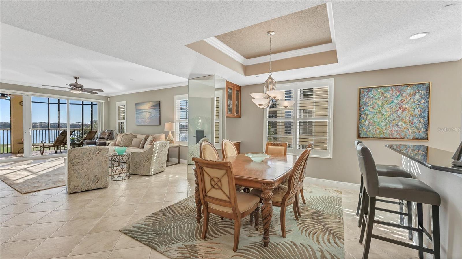 Experience luxury waterfront living in this stunning 3-bedroom Florida condo showcasing a spacious great room plan with elegant ceramic tile floors and breathtaking panoramic lake views. The updated kitchen is designed to impress with granite countertops, newer appliances, and a decorative backsplash, perfect for both everyday living and entertaining. The primary suite offers ceramic tile flooring, walk in closets with custom built ins, and a beautifully updated bathroom featuring granite countertops, soaking tub, and walk in shower. Additional highlights include an inside laundry room with ice maker, custom plantation shutters throughout, and vertical shades on all the sliding glass doors. Step outside to the expansive lanai overlooking the tranquil lake, ideal for relaxing or hosting guests. Enjoy the convenience of a private elevator entry and a spacious two car garage with painted floor and refrigerator. There is also a Craftsman storage unit in the common area for your use. This gated luxury community offers exceptional amenities including a heated pool and spa, clubhouse, and fully equipped exercise room, delivering the ultimate Florida lifestyle. All this conveniently located to Main St at Lakewood Ranch, the UTC shopping district, Sarasota/Bradenton airport, the I-75 corridor, and the Gulf beaches.