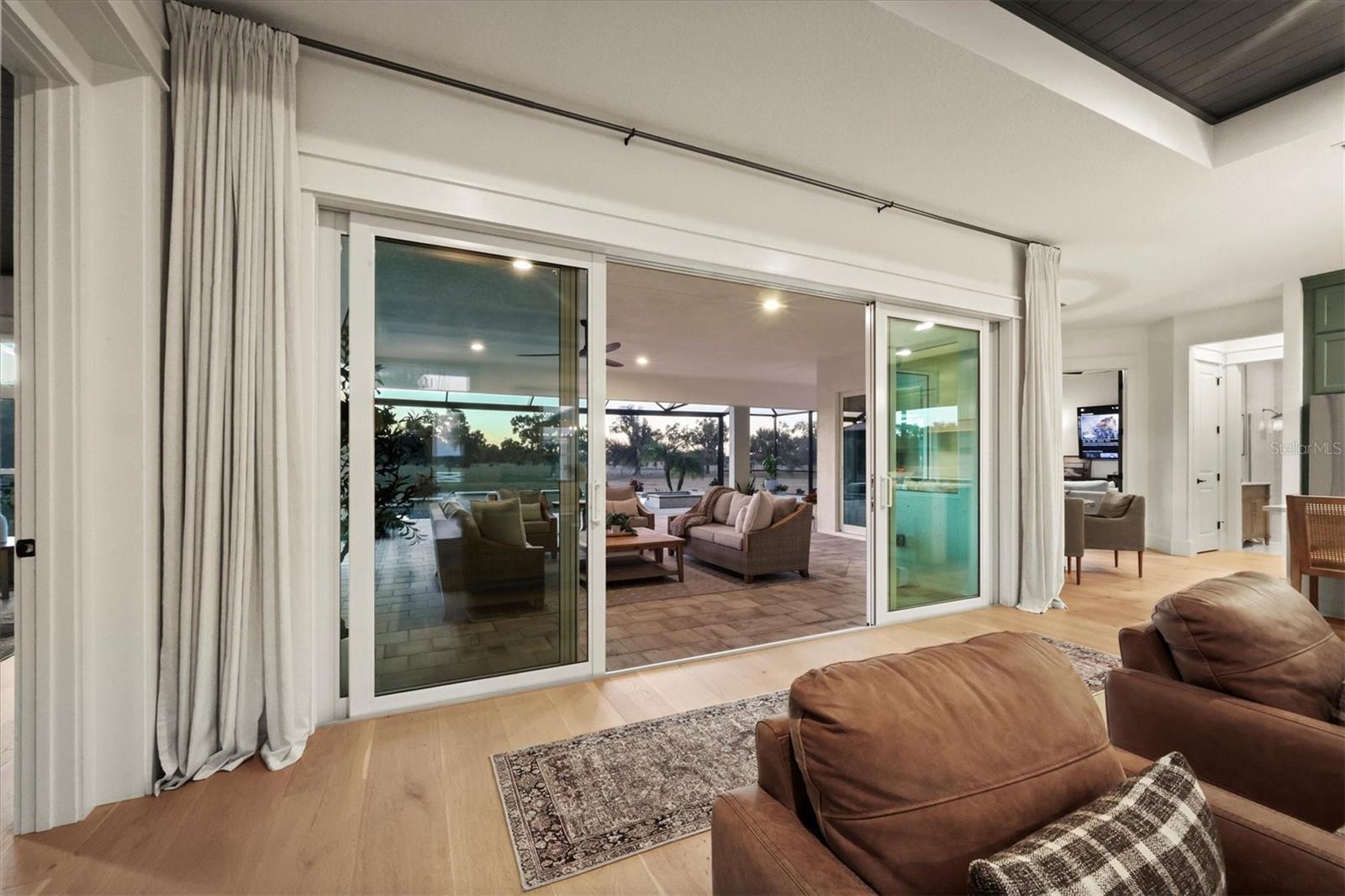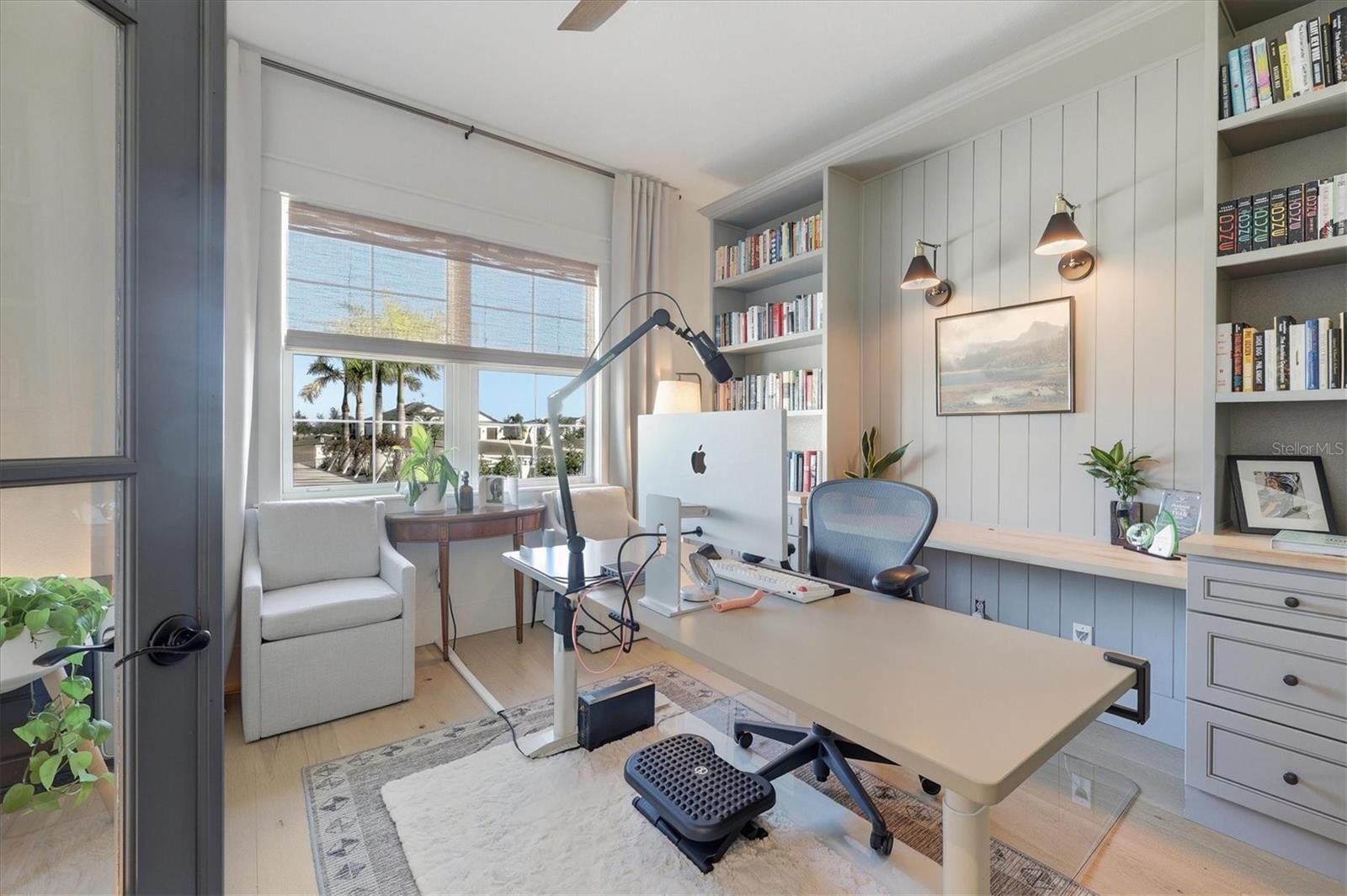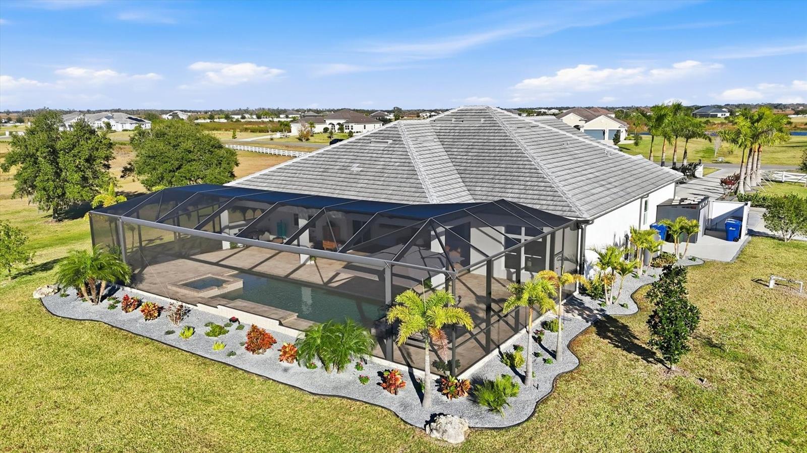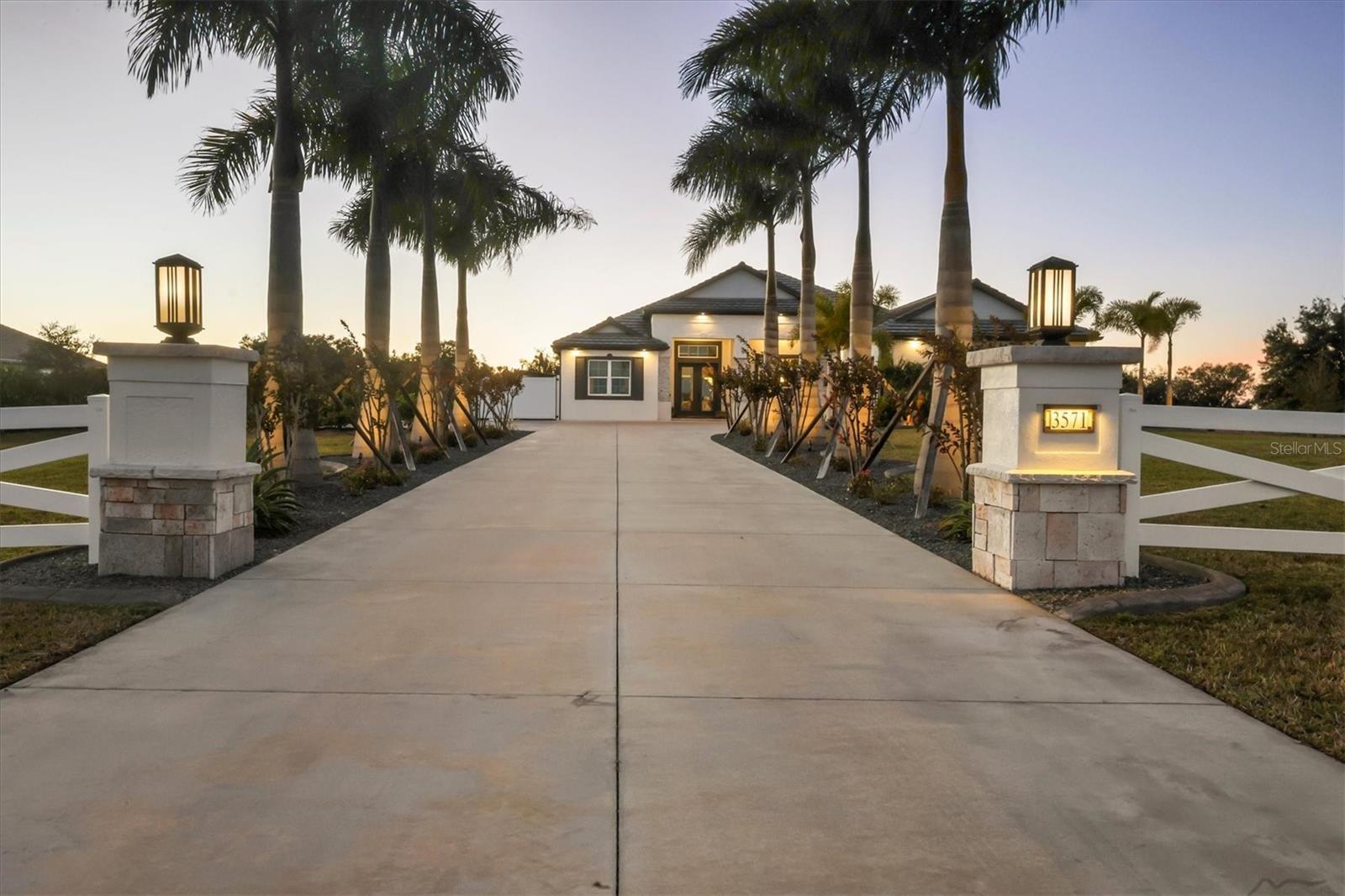 Welcome to a fairytale farmhouse where impeccable attention to detail defines this exquisitely crafted residence, set on a breathtaking about 5.28-acre homesite within the sought-after, gated community of Hampton Lakes. Designed for everyday living and entertaining, the split-bedroom open floor plan blends warmth, sophistication, and modern comfort. From the moment you enter through the grand double front doors, dramatic ceiling treatments, an architectural theme carried throughout every room, pair beautifully with newly completed custom paint and stunning millwork. The foyer features a striking herringbone European white oak ceiling, setting the tone for the layered ceiling details found throughout the home, including tongue-and-groove wood ceilings, custom beams and tray ceilings. The expansive eat-in kitchen offers quartz countertops, an oversized breakfast bar, stainless steel appliances, built-in oven, custom vent hood, pot filler, pantry and a charming dining nook. French doors open to a versatile bonus den or media room, while the oversized living room showcases about 11-foot tray ceilings, custom wood beams, built-in shelving and a statement electric fireplace. The resort-inspired owner’s suite is a serene retreat with a beautifully detailed ceiling, dual walk-in closets with custom organizers, dual vanities, a soaking tub and a walk-in shower with frameless glass. Oversized picture windows capture peaceful views of the pool and pastures, with direct access to the lanai. Guest suites feature custom built-in closets and bunk spaces, while the guest bath is finished with grass-cloth wallpaper and a marble vanity. A spacious office with custom built-ins offers flexibility as a potential fourth bedroom. Throughout the home, 10-inch-wide European white oak floors, shiplap walls, elegant wainscoting and thoughtfully designed ceiling details reflect exceptional craftsmanship. Shadowbox sliders open to an extended screened lanai overlooking the custom saltwater pool and spa with spillover feature, heater, and panoramic enclosure, creating a private outdoor oasis. Notable upgrades include a Generac whole-home generator, a newly installed, underground 500-gallon propane system, and a Culligan whole-home water filtration system with reverse osmosis, along with dual HVAC systems, central vacuum plumbing, surround-sound prewiring and an interior utility room with built-ins. The exterior impresses with updated landscaping, exterior track lighting, a palm-tree-lined driveway with extension, a covered front porch with brick pavers, and a three-car garage with epoxy flooring and overhead storage. The expansive grounds include a citrus grove, a tranquil pond with fish, an extended concrete parking pad and a storage shed. Meticulously maintained and thoughtfully enhanced, this exceptional Fairytale farmhouse offers sweeping westerly sunset views while remaining just minutes from Waterside, Lakewood Ranch Main Street, downtown Sarasota, the interstate, the airport and world-class beaches.