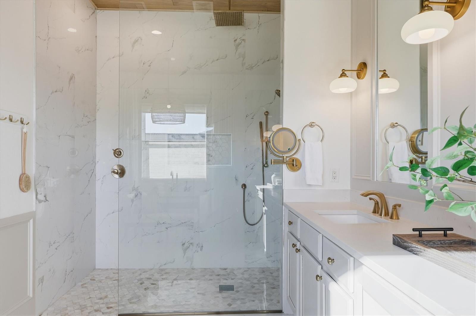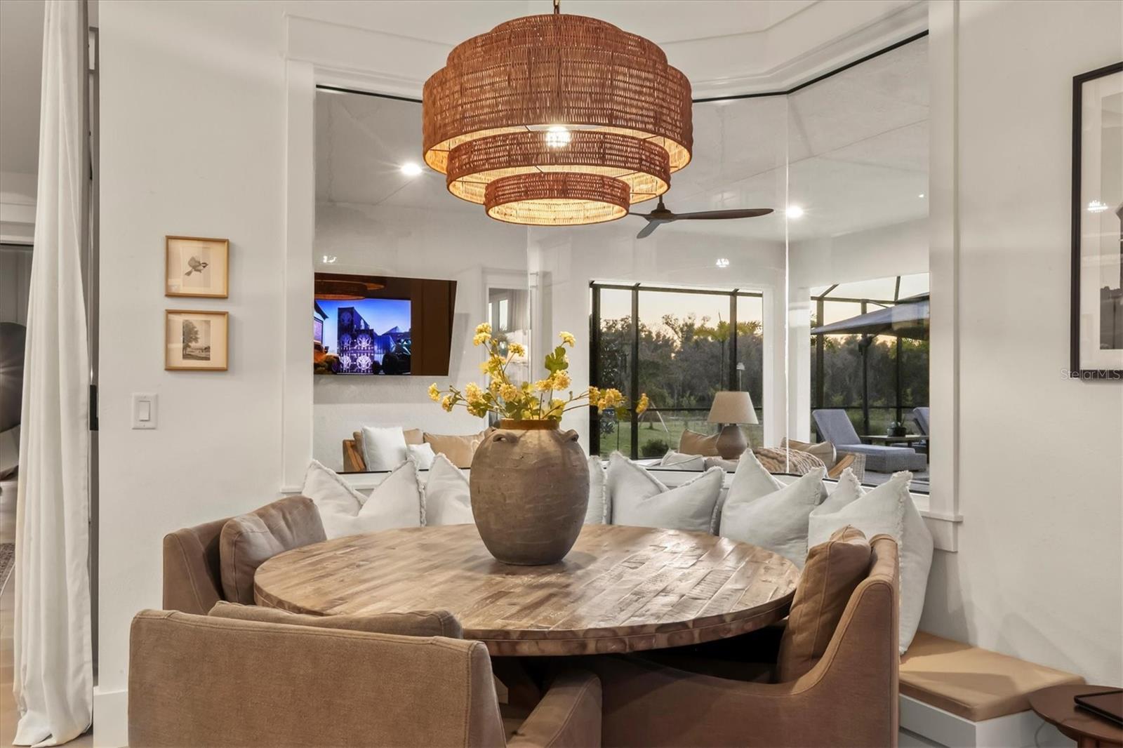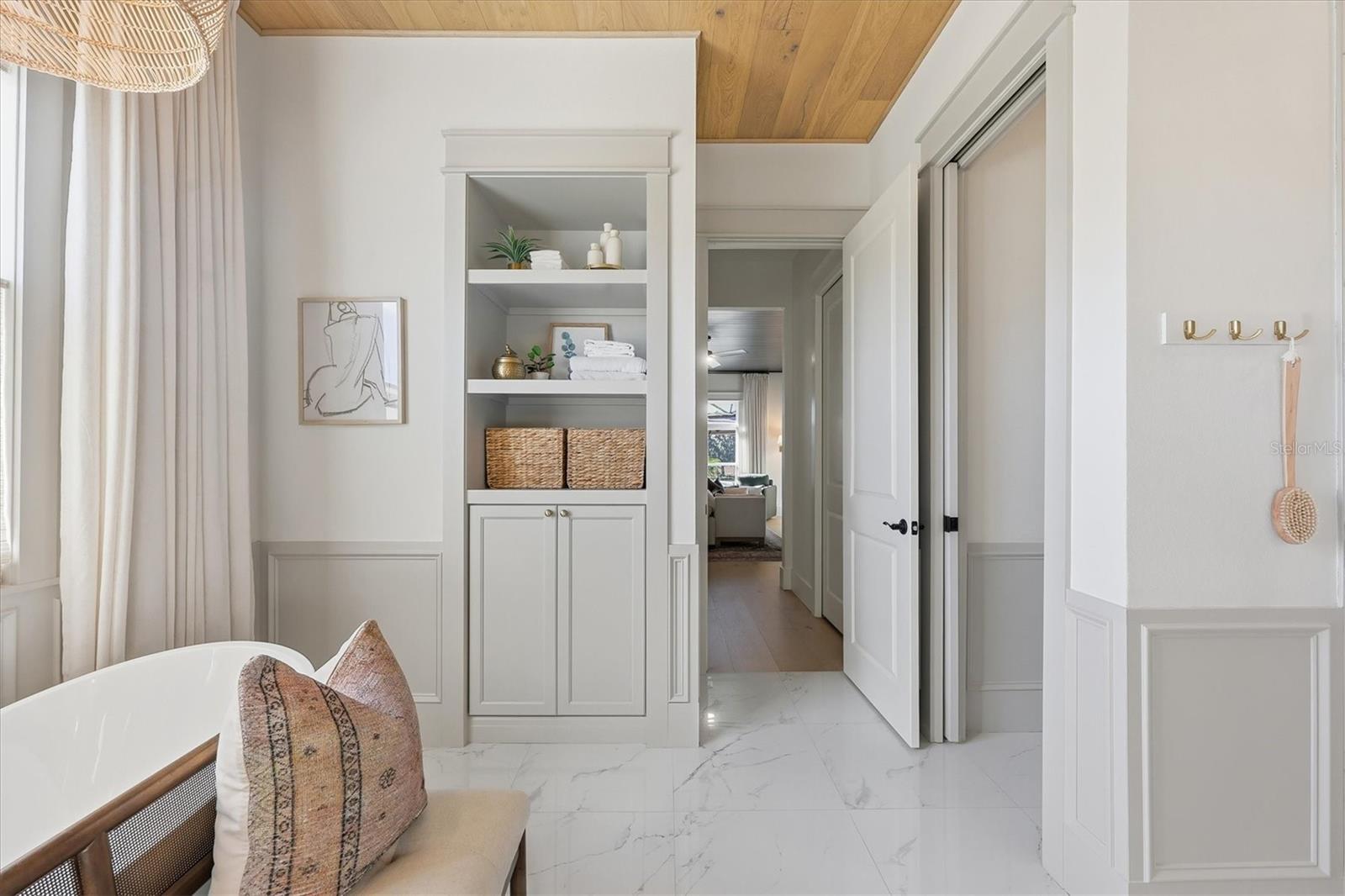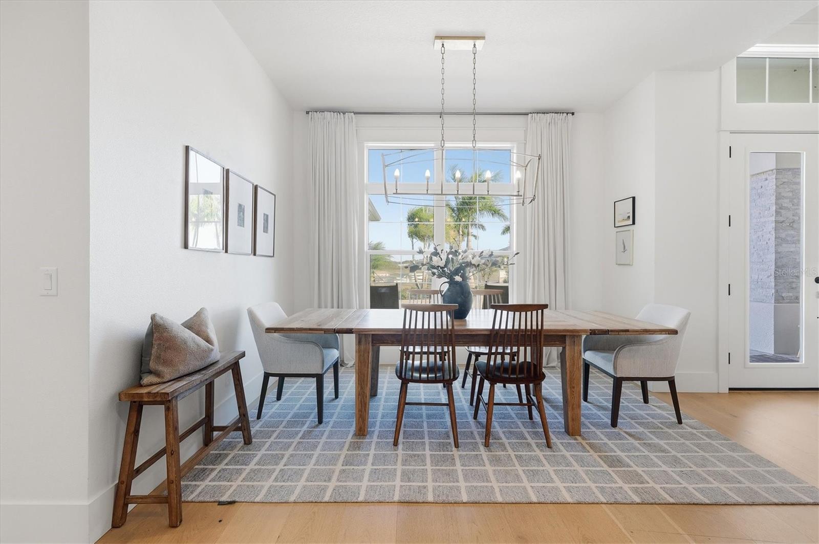 Welcome to a fairytale farmhouse where impeccable attention to detail defines this exquisitely crafted residence, set on a breathtaking about 5.28-acre homesite within the sought-after, gated community of Hampton Lakes. Designed for everyday living and entertaining, the split-bedroom open floor plan blends warmth, sophistication, and modern comfort. From the moment you enter through the grand double front doors, dramatic ceiling treatments, an architectural theme carried throughout every room, pair beautifully with newly completed custom paint and stunning millwork. The foyer features a striking herringbone European white oak ceiling, setting the tone for the layered ceiling details found throughout the home, including tongue-and-groove wood ceilings, custom beams and tray ceilings. The expansive eat-in kitchen offers quartz countertops, an oversized breakfast bar, stainless steel appliances, built-in oven, custom vent hood, pot filler, pantry and a charming dining nook. French doors open to a versatile bonus den or media room, while the oversized living room showcases about 11-foot tray ceilings, custom wood beams, built-in shelving and a statement electric fireplace. The resort-inspired owner’s suite is a serene retreat with a beautifully detailed ceiling, dual walk-in closets with custom organizers, dual vanities, a soaking tub and a walk-in shower with frameless glass. Oversized picture windows capture peaceful views of the pool and pastures, with direct access to the lanai. Guest suites feature custom built-in closets and bunk spaces, while the guest bath is finished with grass-cloth wallpaper and a marble vanity. A spacious office with custom built-ins offers flexibility as a potential fourth bedroom. Throughout the home, 10-inch-wide European white oak floors, shiplap walls, elegant wainscoting and thoughtfully designed ceiling details reflect exceptional craftsmanship. Shadowbox sliders open to an extended screened lanai overlooking the custom saltwater pool and spa with spillover feature, heater, and panoramic enclosure, creating a private outdoor oasis. Notable upgrades include a Generac whole-home generator, a newly installed, underground 500-gallon propane system, and a Culligan whole-home water filtration system with reverse osmosis, along with dual HVAC systems, central vacuum plumbing, surround-sound prewiring and an interior utility room with built-ins. The exterior impresses with updated landscaping, exterior track lighting, a palm-tree-lined driveway with extension, a covered front porch with brick pavers, and a three-car garage with epoxy flooring and overhead storage. The expansive grounds include a citrus grove, a tranquil pond with fish, an extended concrete parking pad and a storage shed. Meticulously maintained and thoughtfully enhanced, this exceptional Fairytale farmhouse offers sweeping westerly sunset views while remaining just minutes from Waterside, Lakewood Ranch Main Street, downtown Sarasota, the interstate, the airport and world-class beaches.
