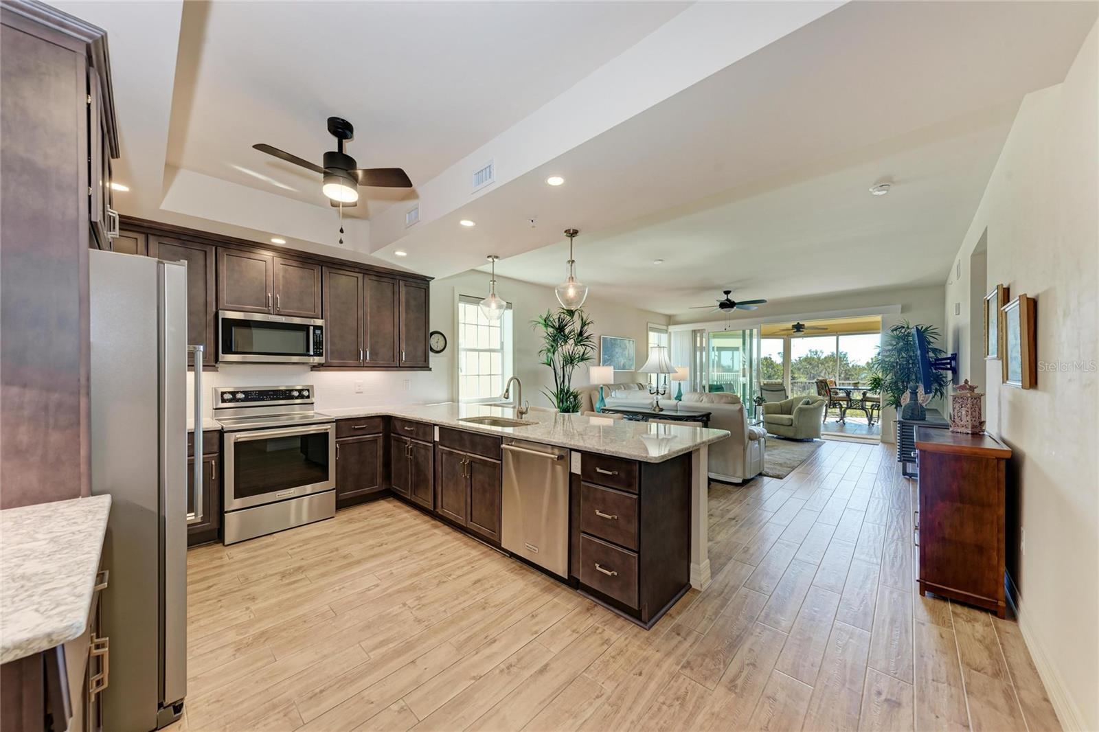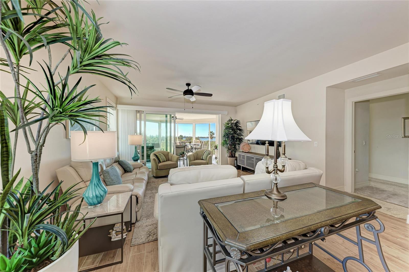Enjoy sweeping water views and stunning sunsets over Little Sarasota Bay from this spacious third-floor corner residence in the gated waterfront community of Edgewater at Hidden Bay. Built in 2017 and moved into in Jan 2018, this three-bedroom plus den, 2.5-bath condominium offers nearly 2,200 square feet of living space with easy elevator access and one assigned parking space in the building. The attractive open floor plan features soaring ceilings, impact-rated windows and sliding doors, easy maintenance tile plank flooring and abundant natural light throughout. The kitchen includes granite countertops, solid wood cabinetry, stainless steel appliances and custom storage with pullout drawers. The living area offers a built-in dry bar with wine refrigerator and opens to a large, screened-in terrace with privacy-screens and expansive bay views. The primary suite includes dual walk-in closets and a luxurious bath with dual quartz vanities, decorative tile flooring, makeup vanity and walk-in shower. Additional features include a private den/office, in-unit laundry room, two full baths and a powder room. Edgewater at Hidden Bay is a gated, resort-style community set on 14 acres along Little Sarasota Bay and the Intracoastal Waterway, directly across from Casey Key. Community amenities include a waterfront clubhouse with kitchen and quartz bar, heated pool and spa, fitness center, library, tiki hut with grilling stations, pickleball and tennis courts, kayak launch, fishing pier, dog play area, and an elevated boardwalk through mangroves and palm-lined grounds. Hidden Bay is conveniently in Osprey just south of Sarasota, near area beaches, shopping and dining, and only minutes from Venice.
