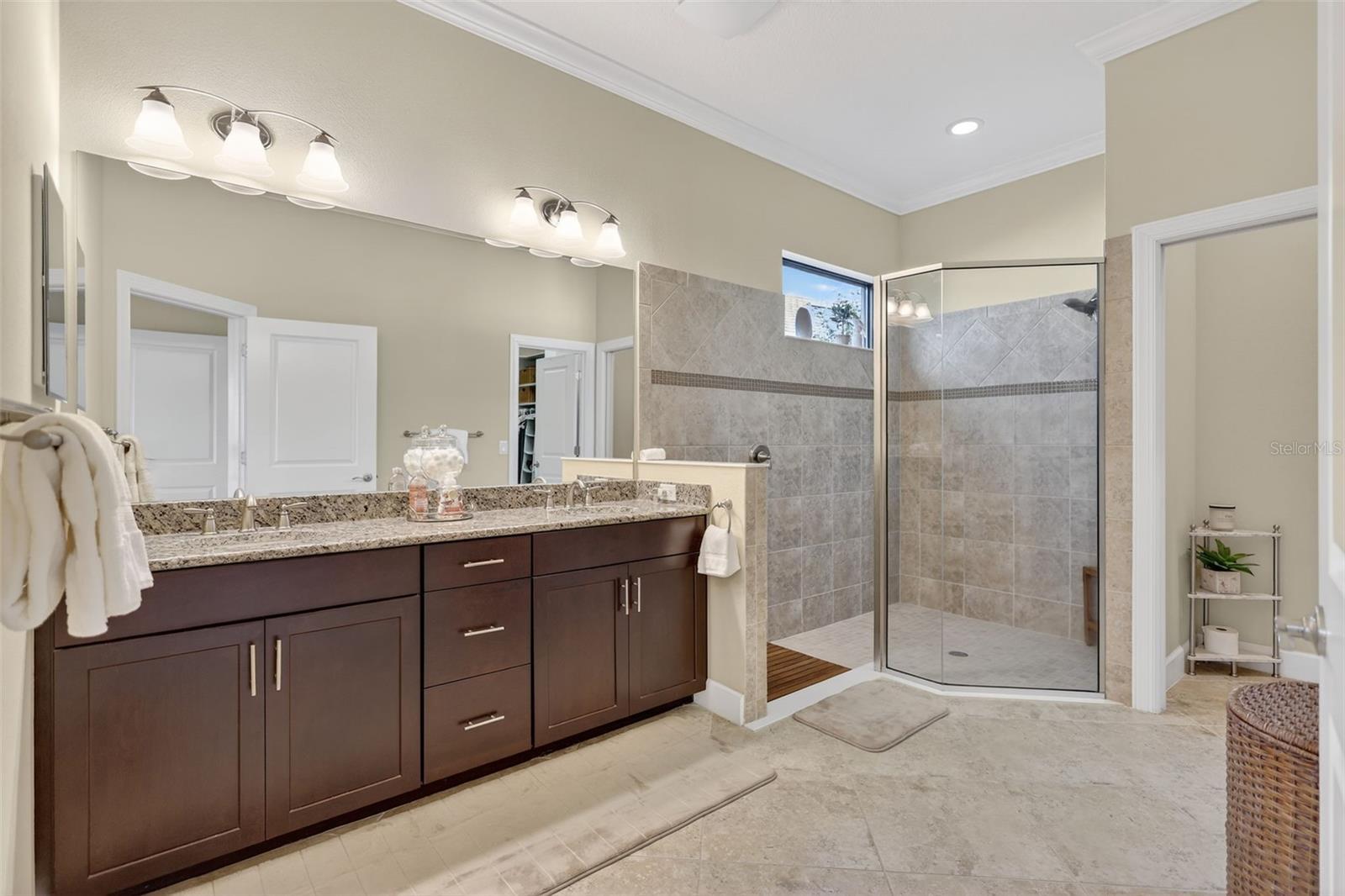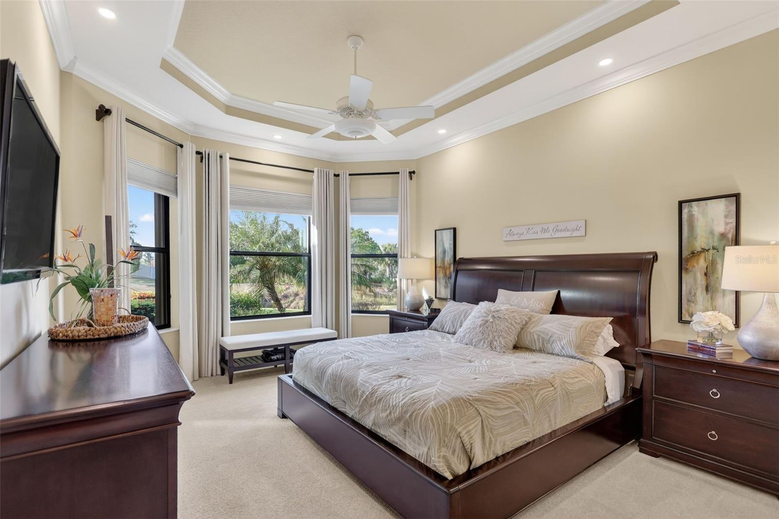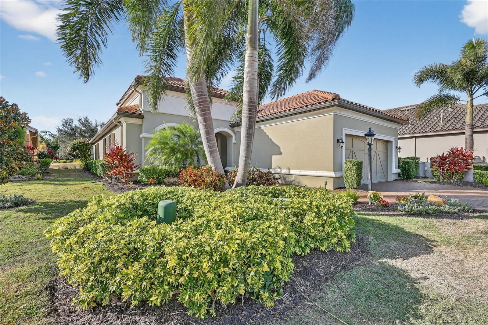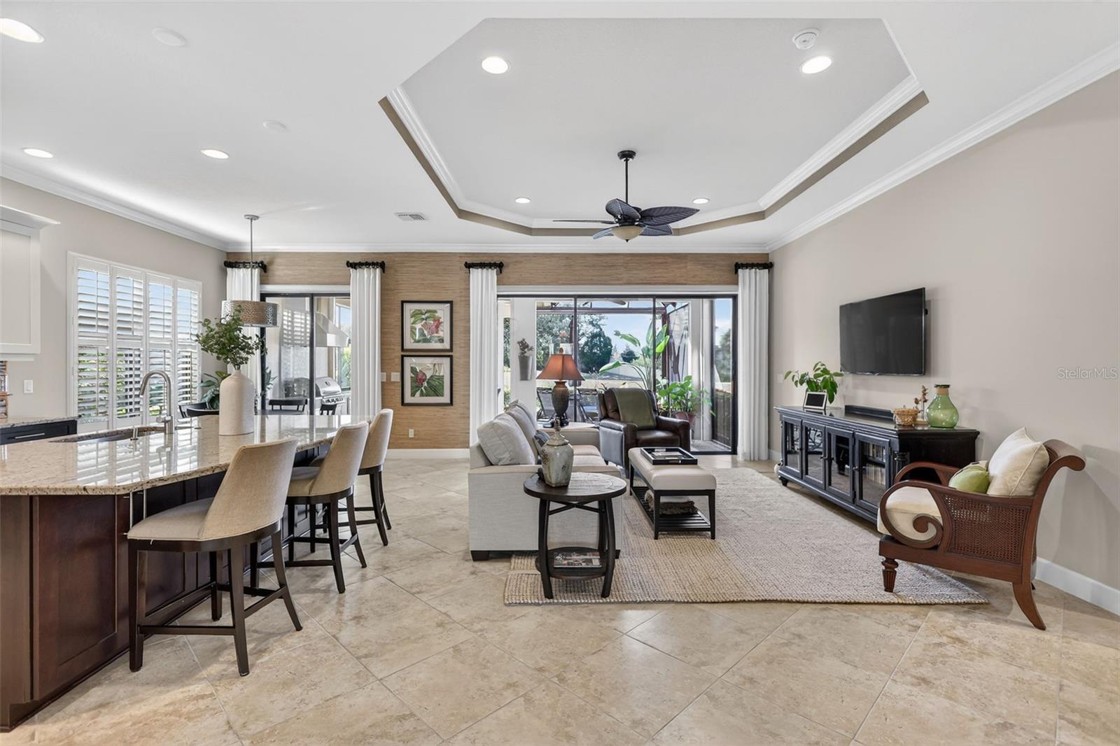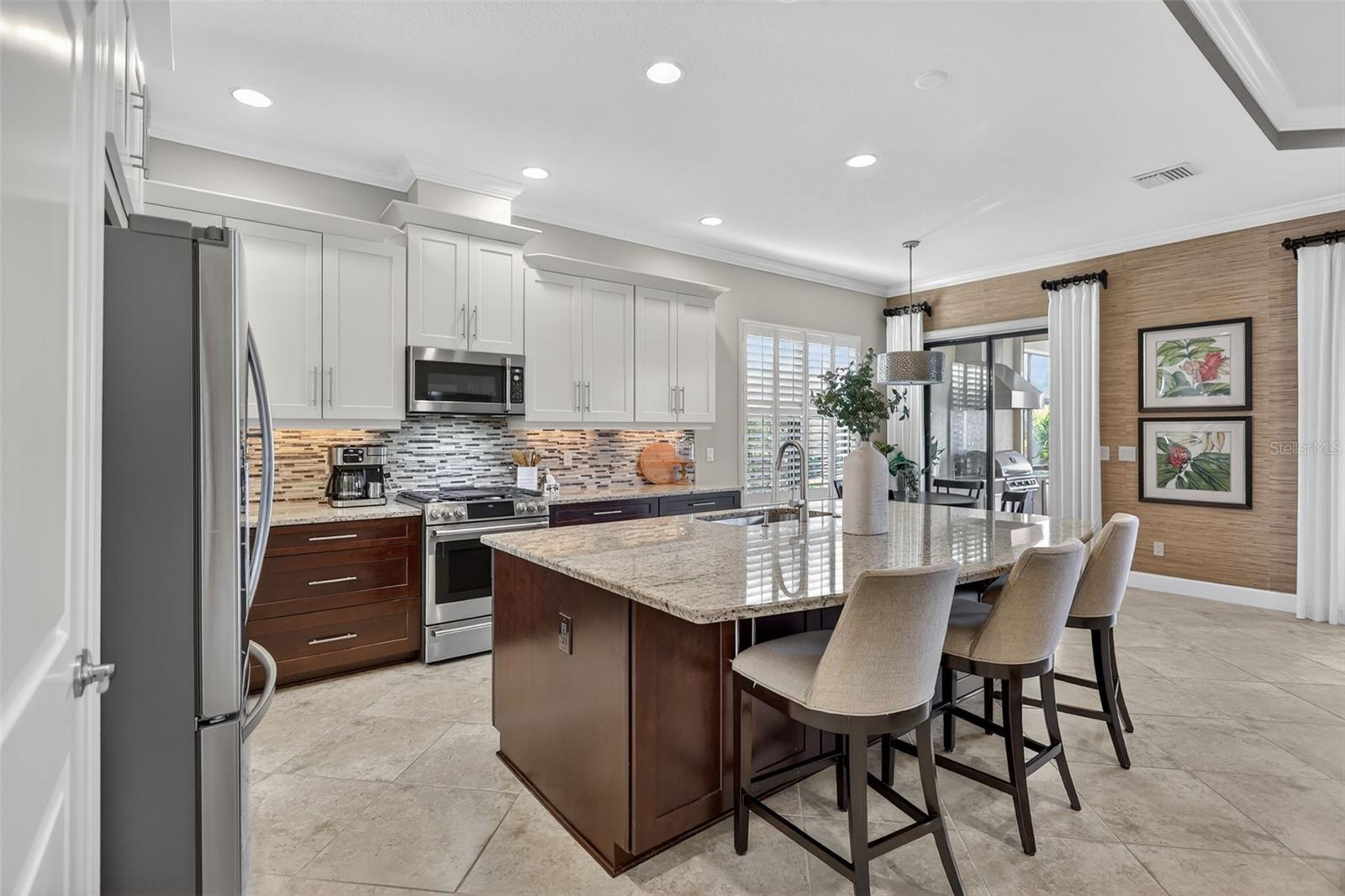 Experience elevated Florida living in this elegantly upgraded light and bright Farnese model, perfectly nestled in the prestigious Esplanade Golf and Country Club at Lakewood Ranch. This stunning 2-bedroom, 2.5-bathroom home with a versatile den offers an open-concept layout and luxurious finishes throughout. From the moment you enter, you’ll appreciate the crown molding in every room—including the closets—tray ceilings, and diagonally laid tile in the main living area that adds a touch of sophistication. The gourmet kitchen features soft-close cabinetry, a newer faucet, and a premium 2023 Café range, dishwasher, and microwave. The spacious primary suite includes a new shower floor, comfort-height toilets, and custom closet systems for maximum organization. The laundry room is enhanced with extra cabinet space and impact glass for added peace of mind. Step outside to a private lanai designed for true Florida living. Enjoy tranquil panoramic views of the pond and walking trail, complete with nebula lighting, a fully equipped summer kitchen, and Storm Smart shutters for hurricane protection. Accordion shutters and additional impact windows at the front door and laundry room provide further security. The extended garage offers epoxy floors, built-in cabinetry, attic stairs, and overhead storage—ideal for both convenience and function. Plantation shutters in the main living area, newer HVAC installed in 2023, and one of the longest driveways in the community complete this meticulously maintained home. Situated in one of Lakewood Ranch’s premier lifestyle communities, residents enjoy access to championship golf, tennis, resort pools, fitness centers, dining, and endless social events. With the CDD partially paid off you will have savings of around $900/annually. This home is a rare opportunity for luxury, location, and long-term value. No golf dues pay to play. The drapes in the dinette and great room and the shelves in the office DO NOT CONVEY.