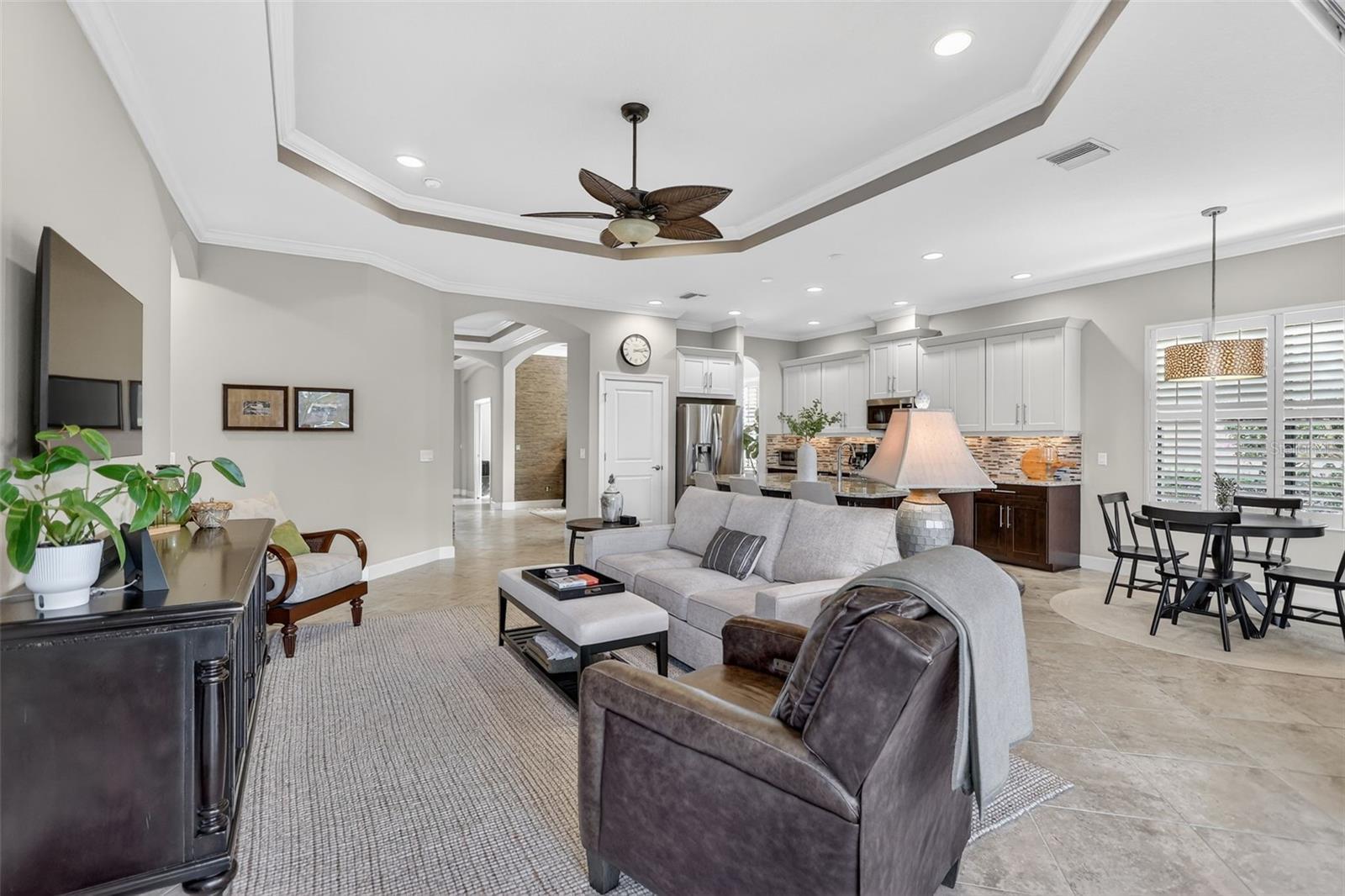 - Ceiling Fans(s), Crown Molding, Eat-in Kitchen, Living Room/Dining Room Combo, Open Floorplan, Primary Bedroom Main Floor, Stone Counters, Tray Ceiling(s), Walk-In Closet(s), Window Treatments