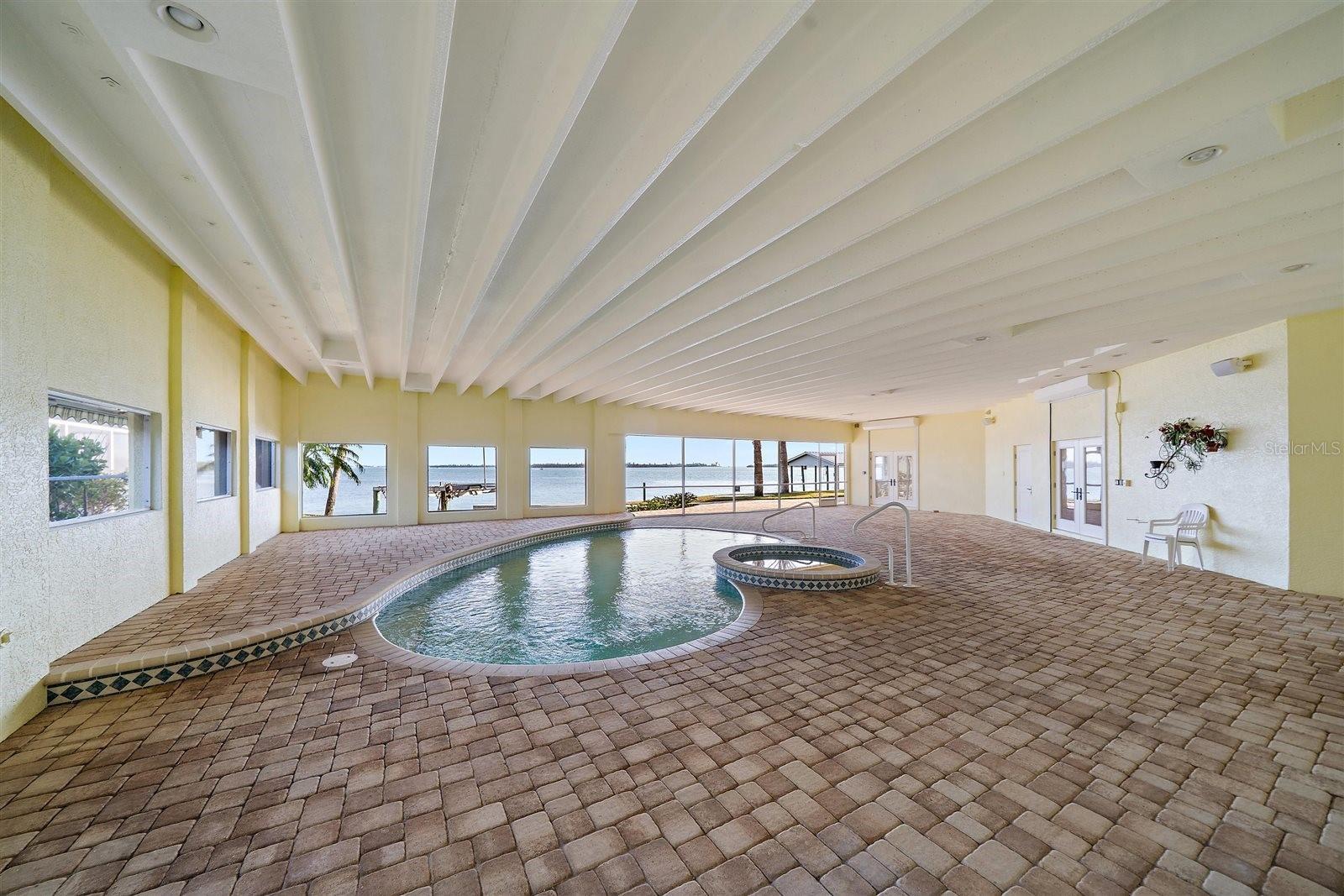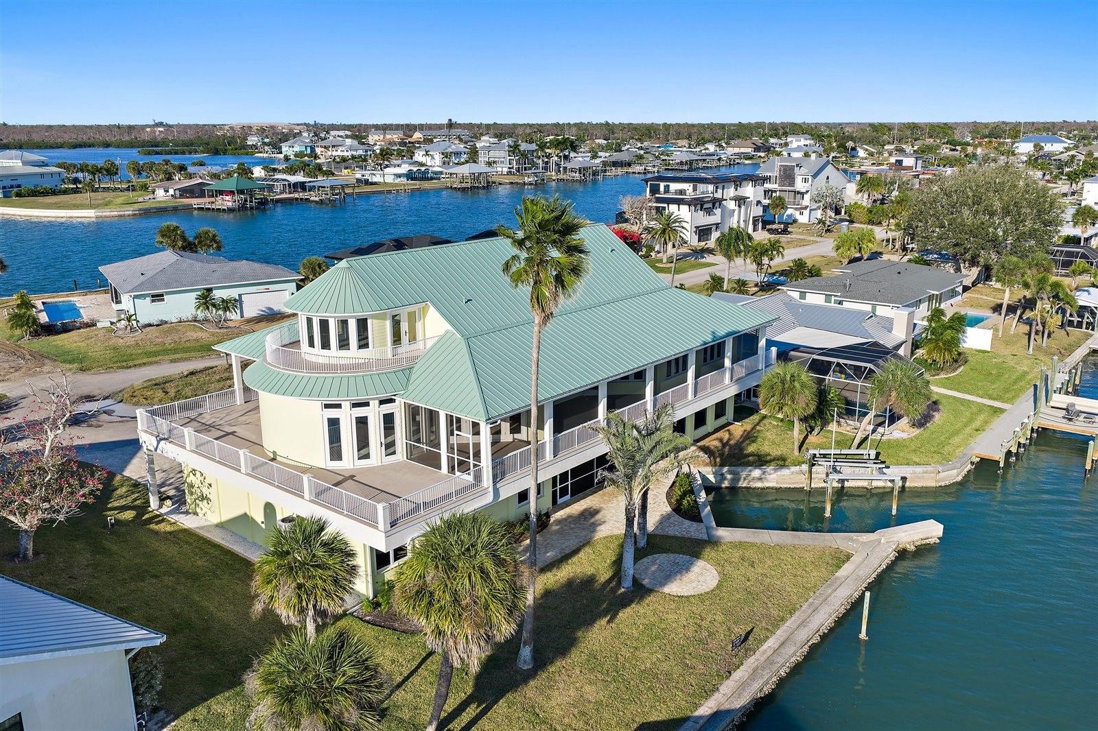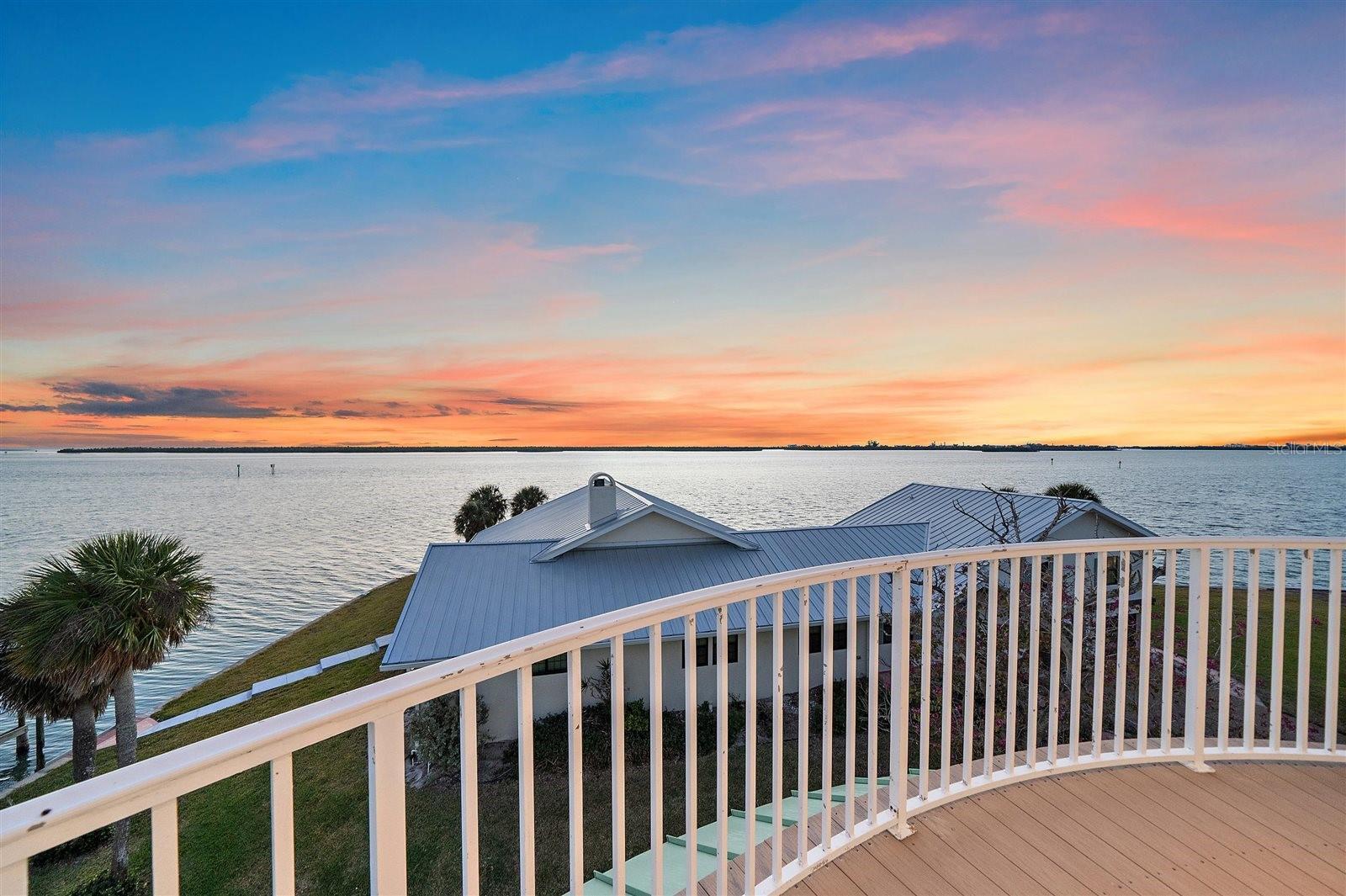 One or more photo(s) has been virtually staged. A landmark waterfront home with a story to tell, set where Lemon Bay meets the Intracoastal & the water surrounds you in every direction. Positioned at the end of a quiet cul-de-sac on Lemon Bay, this one-of-a-kind estate situated on a third acre, offers sweeping water views, exceptional structural integrity, & a design shaped by history & purpose. With water visible from nearly every room & wraparound balconies on multiple levels, the connection to the Intracoastal Waterway, canal, & distant Gulf is constant & unforgettable. The main living level is elevated & encircled by expansive Trex decking, blending covered & open-air spaces ideal for enjoying sunrise, sunset, & everything in between. Inside, the great room features soaring 10 and 12 foot ceilings, built-in cabinetry, recessed lighting, ceiling fans, & a gas fireplace, framed by travertine and French doors opening to the surrounding balconies. The dining area flows into the kitchen, where custom cherry wood cabinetry, granite countertops, a large island with seating, pantry storage, & high-end appliances, including a Thermador gas range, create a space well suited for entertaining or everyday living. Elevator access on this level adds ease & functionality. Offering 5 total bedrooms, 4.5baths + living room + bonus room. 4 bedrooms are located on the main living floor, including 2 en-suites. The primary suite offers French door balcony access, sweeping bay & distant Gulf views, built-in shelving, & a custom walk-in closet. The primary bath includes dual sinks, Corian countertops, & a glass-enclosed walk-in shower with dual shower heads. A second en-suite bedroom features balcony access, a custom walk-in closet, & a spa-style bath with dual sinks, glass walk-in shower, & a jetted tub overlooking the water. 2 additional bedrooms share a Jack-&-Jill bath with custom built-in closets. The ground level is fully built out under air & functions as a private retreat with a living area, bedroom, & full bathroom with walk-in shower, ideal for guests or poolside living. This level opens directly to the covered & screened pool & spa, where paver decking & generous ceiling height create a protected resort-style setting. At the top of the home, a bonus living space offers bird’s-eye views across Lemon Bay & surrounding waterways, with a wet bar, wine storage, refrigerator, built-in desk, attic access, & French doors to a private open wraparound balcony. Outside, the property features a large seawall, sailboat water with no fixed bridges, & a boat lift (not warranted). The seawall allows for re-engineering to accommodate vessels up to approximately 50 to 100 feet, subject to buyer verification. Additional highlights include a small dog run with retractable awning & multiple wraparound balconies maximizing water views. Notable improvements include: freshly painted interior and exterior in Nov 2024, new metal roof completed in April 2024, 3 HVAC systems replaced in 2023, hurricane impact windows & doors with additional shutter protection, pool heat pump April 2020, whole-house water filtration & softener system, security system, elevator, & solid core cherry wood interior doors & staircases. Solar panels were previously installed & removed, with infrastructure remaining for future reinstallation. This is a rare opportunity to own a structurally impressive waterfront home where history, design, & expansive water views come together in a setting that cannot be replicated.