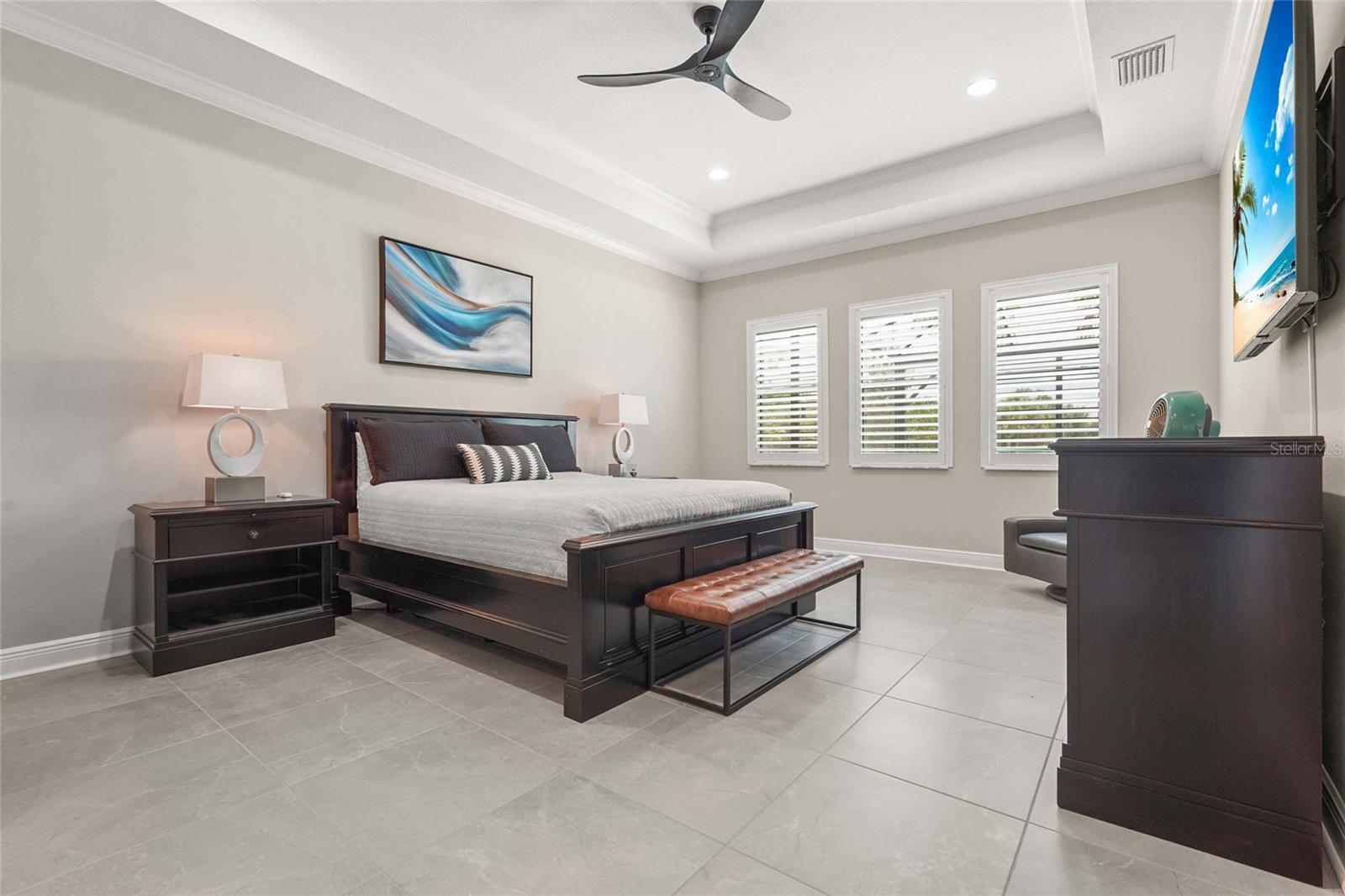 - Ceiling Fans(s), Crown Molding, Eat-in Kitchen, High Ceilings, Kitchen/Family Room Combo, Open Floorplan, Primary Bedroom Main Floor, Smart Home, Split Bedroom, Stone Counters, Tray Ceiling(s), Walk-In Closet(s)