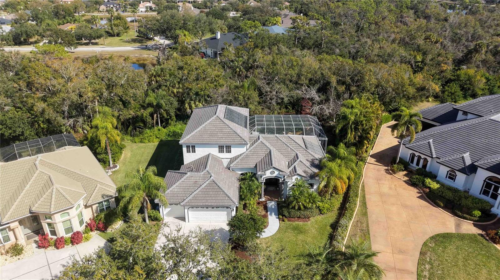Welcome to your own private natural sanctuary in the heart of Lakewood Ranch’s coveted River Club, where tranquil preserve views and a cascading natural rock waterfall pool create a setting of exceptional serenity and beauty. Gracefully positioned at the end of a quiet cul-de-sac on over an acre of pristine land, this refined Todd Johnston estate offers a rare blend of privacy, elegance, and effortless livability. With nearly 3,700 square feet of thoughtfully designed interior space, the home embraces both sophistication and a deep connection to nature. The exterior was newly painted in December 2025, while the interior has been freshly painted in 2024—including all bedrooms, living areas, bathrooms, and kitchen cabinets—paired with a stylish new tile backsplash for a modern, refreshed feel. Take in the stunning natural rock waterfall of the oversized, lagoon style pool that anchors the outdoor living space, set within an extended screened lanai and surrounded by lush preserve views. The expansive backyard features winding trails and a custom-built play area with ziplines and rope swings—creating a true retreat for both relaxation and recreation. Inside, the home offers four spacious bedrooms, three full bathrooms, a private den, and an upstairs bonus room with its own balcony. The main level features a generous primary suite with French doors opening to the lanai, a dedicated home office, and a secluded guest bedroom. The open-concept kitchen includes natural gas cooking, freshly painted cabinetry, and seamless flow into the main living areas. Additional highlights include a brand new roof (March 2025), a three-car garage, mature landscaping, and abundant storage throughout. River Club residents enjoy low HOA fees, no CDD, and a prime location near top-rated schools, championship golf, shopping, dining, and the Gulf Coast’s world-renowned beaches.