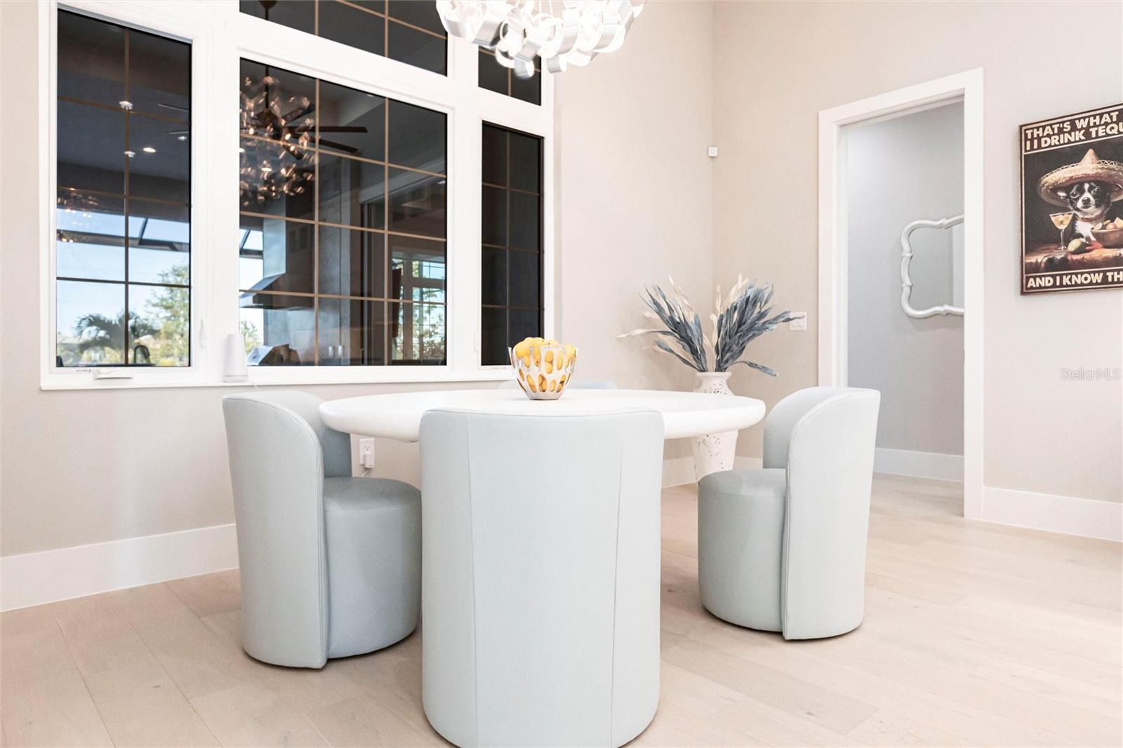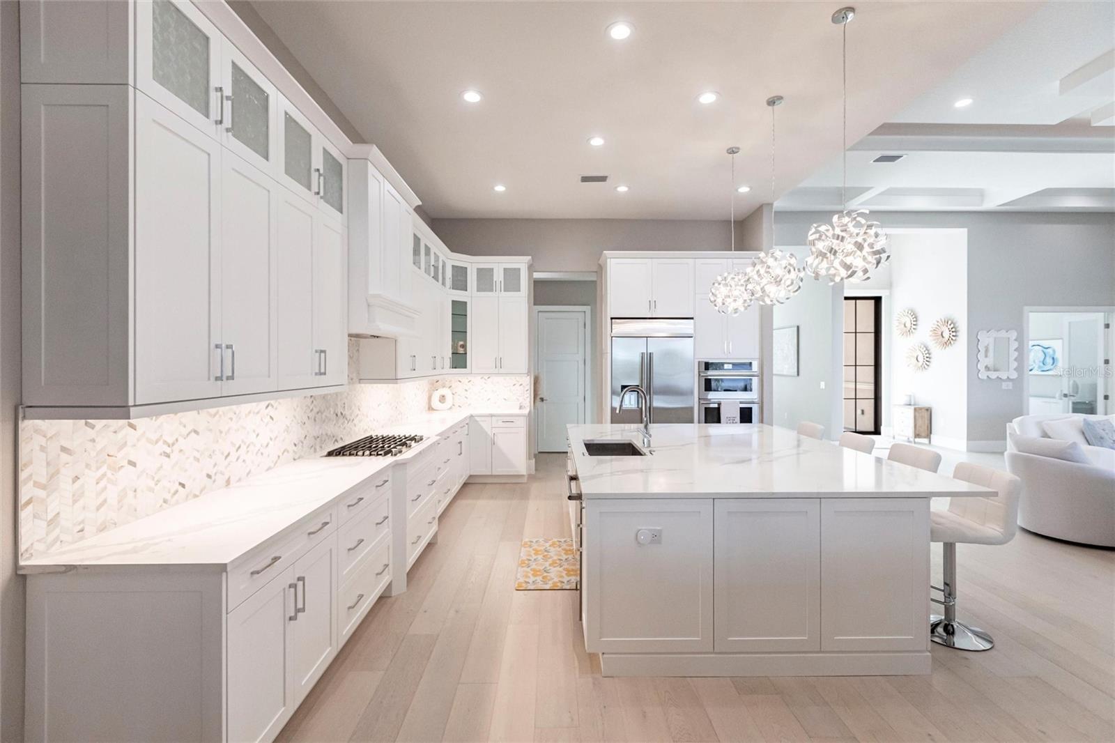 Experience refined Florida living in this nearly brand-new 2024 Stock Home, beautifully positioned to capture stunning full lake views and designed for effortless indoor-outdoor living. This exceptional residence offers an open split-floor plan, soaring ceilings, and designer finishes throughout, creating a bright, elegant, and inviting atmosphere from the moment you enter. Spanning 3,936 sq. ft. of living space (over 5,800 sq. ft. total), the home features 3 bedrooms, 4.5 baths, a private den, formal dining room, and an expansive bonus room—ideal as a media lounge, game room, home gym, or guest retreat. The heart of the home is a chef-inspired kitchen with an oversized island, premium appliances, abundant cabinetry, and seamless flow into the spectacular great room, where 15-foot coffered ceilings and 10-foot pocket sliding doors frame sweeping water views. The primary suite is a serene retreat with direct lanai access, a spa-style bath with soaking tub and walk-in shower, and dual custom walk-in closets. Two additional guest suites each offer private ensuite baths and generous closet space. Show-Stopping Outdoor Living: The oversized, resort-style lanai with gorgeous sunset views is truly one of the home’s standout features—one of the largest in the community—complete with heated saltwater pool & spa, glass fireplace for year-round ambiance, fully equipped summer kitchen, firepit with panoramic lake views, ample covered seating and entertainment space for unforgettable gatherings. Other Premium Upgrades & Comfort Features: * impact windows * Hunter-Douglas powered shades * engineered hardwood flooring * water softener * hot water recirculation system * whole-house surge protection * plantation shutters * gas water heater * irrigation system * advanced security provide both luxury and peace of mind. Located in one of Lakewood Ranch’s most prestigious gated communities, residents enjoy access to a grand clubhouse, spa, fitness center, resort pools, tennis courts, and concierge-style amenities. Furniture is negotiable—move in with ease and start enjoying the Florida lifestyle immediately.