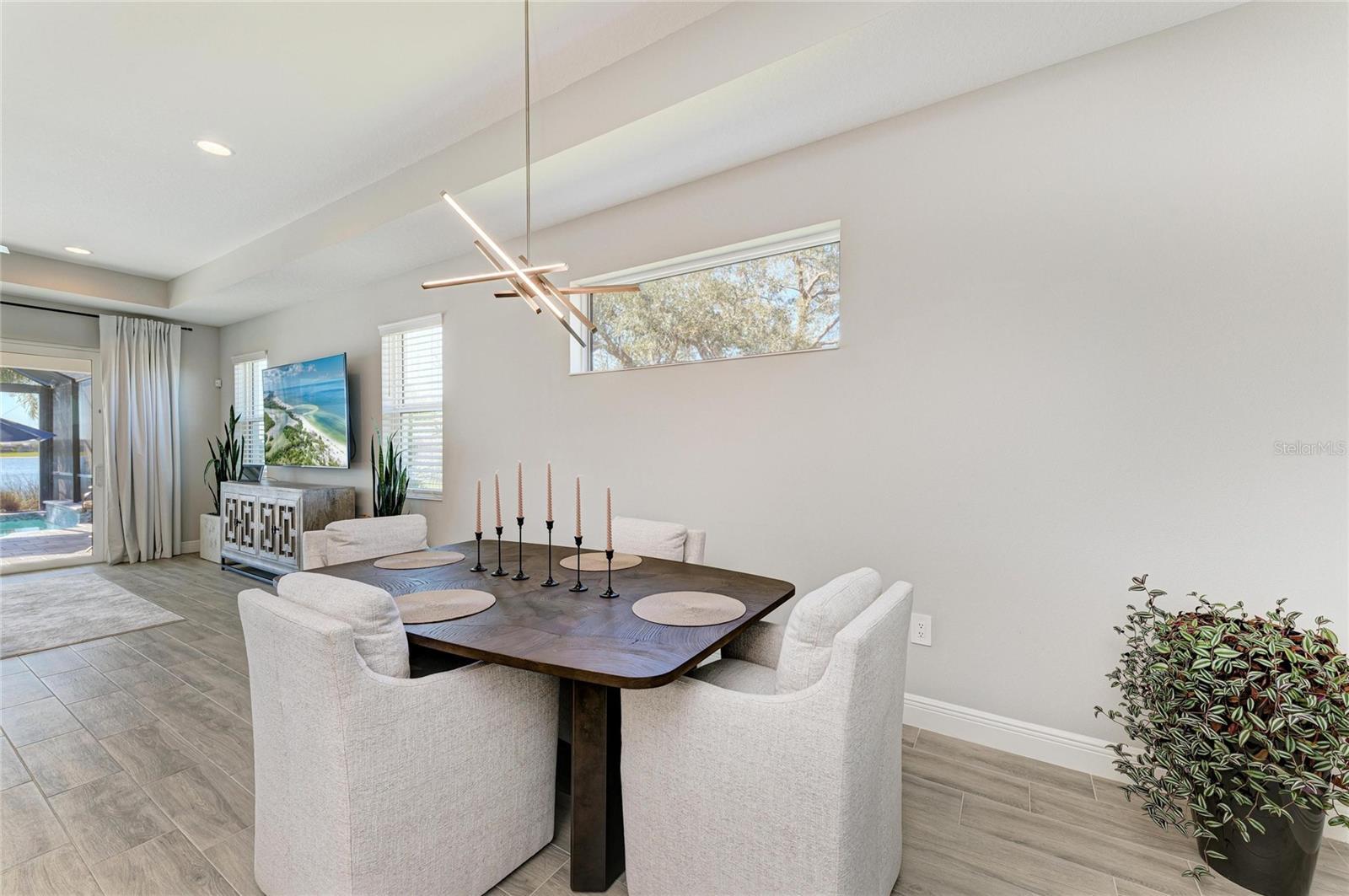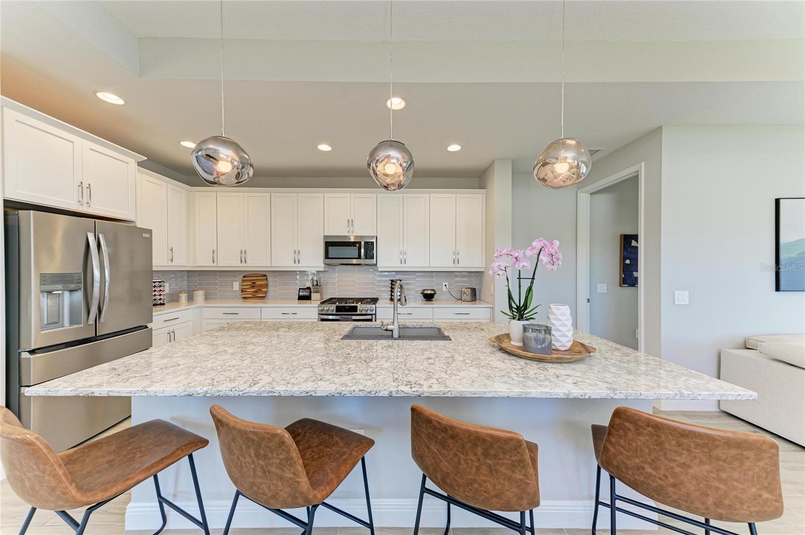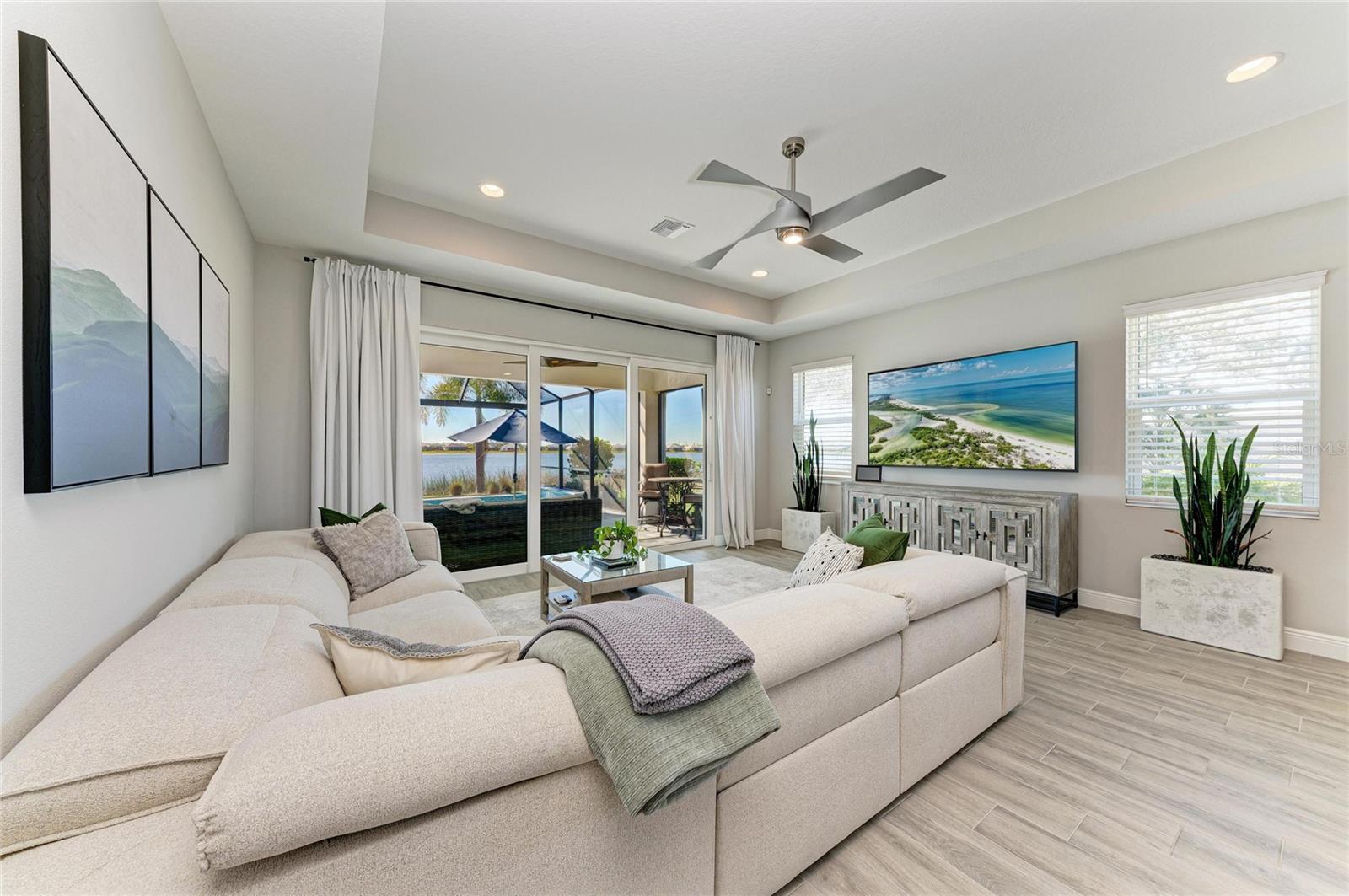 Set along the tranquil shores of Lake Ibis, this exceptional lakefront residence showcases spectacular, long, uninterrupted water views and breathtaking sunset vistas that define true Florida living. Built in 2022 by Homes by Towne, the Skiff floor plan offers thoughtful design, quality construction, and an enviable waterfront setting. Spanning 2,158 square feet, the home features three bedrooms, two full baths, a dedicated office/den, and an open-concept layout designed to maximize natural light while framing the stunning lake views from multiple living areas. The kitchen is both stylish and functional, featuring quartz countertops, custom cabinetry with soft-close drawers and pull-out shelving, under-cabinet lighting, stylish backsplash, and a layout ideal for everyday living or elaborate entertaining. The great room opens seamlessly to an extended lanai with a full-view screen enclosure, preserving clear sightlines across the water and front-row views of vibrant sunsets. The outdoor living area is a true highlight, offering a pool, separate standalone spa, generous covered seating area, an ideal setting for morning coffee overlooking the lake or evening gatherings as the sun sets aglow with color over the water. The owner’s suite is positioned to capture serene water views and glowing sunsets, creating a peaceful retreat complemented by a spa-inspired bath with dual quartz vanities, and upgraded finishes. Two additional bedrooms and full bath on the other side of the home provide private flexibility for guests or family, while a light-filled office offers a quiet space for work or hobbies. Additional features include a large laundry room and a two-car garage with epoxy flooring and storage. Residents of LakeHouse Cove enjoy resort-style amenities, including a pool and spa, state of the art fitness center, clubhouse with catering kitchen, boathouse with kayak launches, pickleball courts, fire pits, dog parks, and a full calendar of social activities. Be as social as you want within this community. Conveniently located just minutes from Waterside Place, Lakewood Ranch Main Street, University Town Center, and downtown Sarasota, this exceptional residence offers effortless access to world-renowned beaches, celebrated cultural attractions, and Sarasota-Bradenton International Airport. A short journey opens the door to Florida’s iconic theme parks, adding yet another dimension to the lifestyle. This is a rare opportunity to enjoy spectacular lake views, unforgettable sunset vistas, and the peace of mind that comes with newer construction, all within one of Lakewood Ranch’s most sought-after communities.