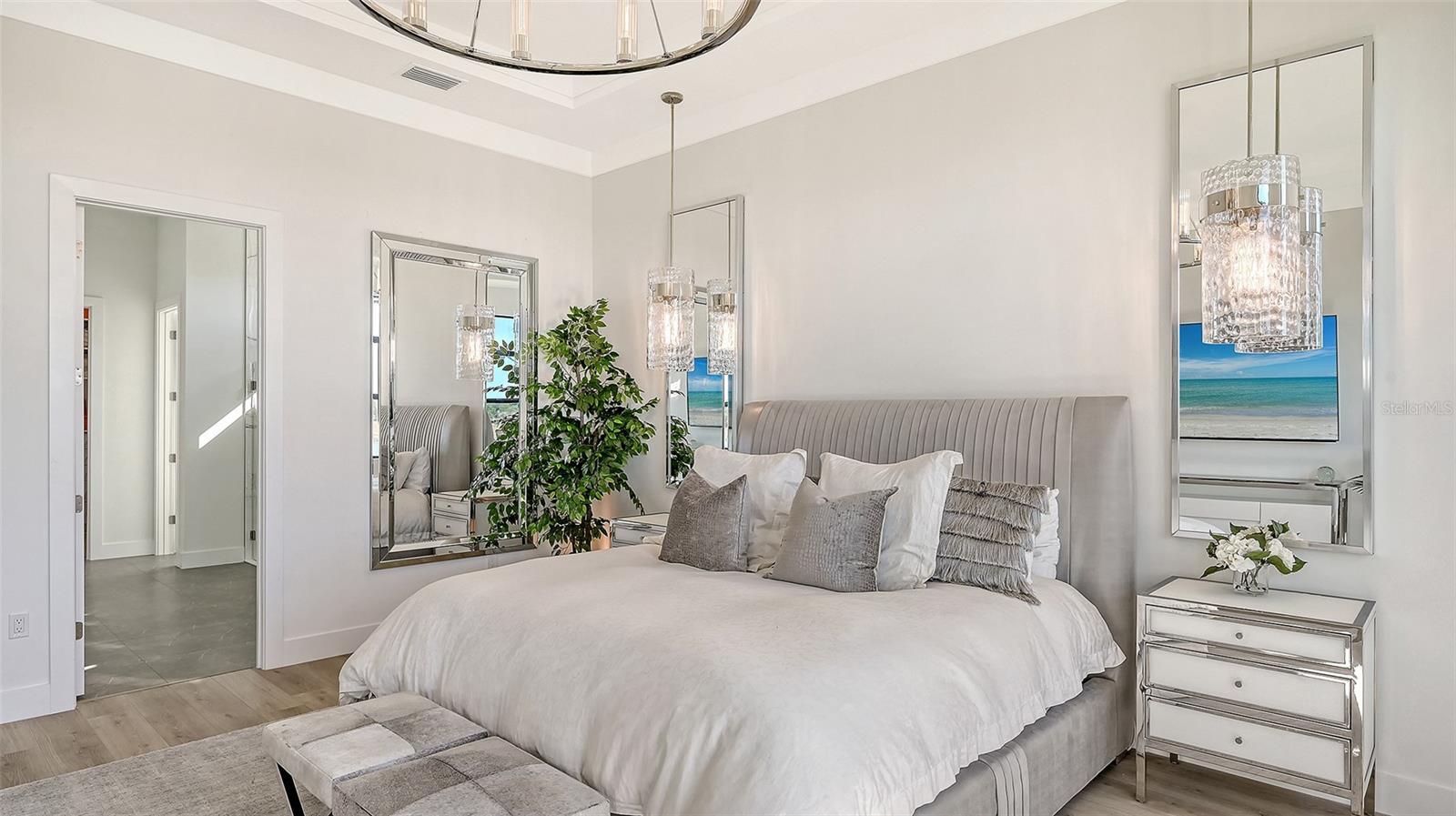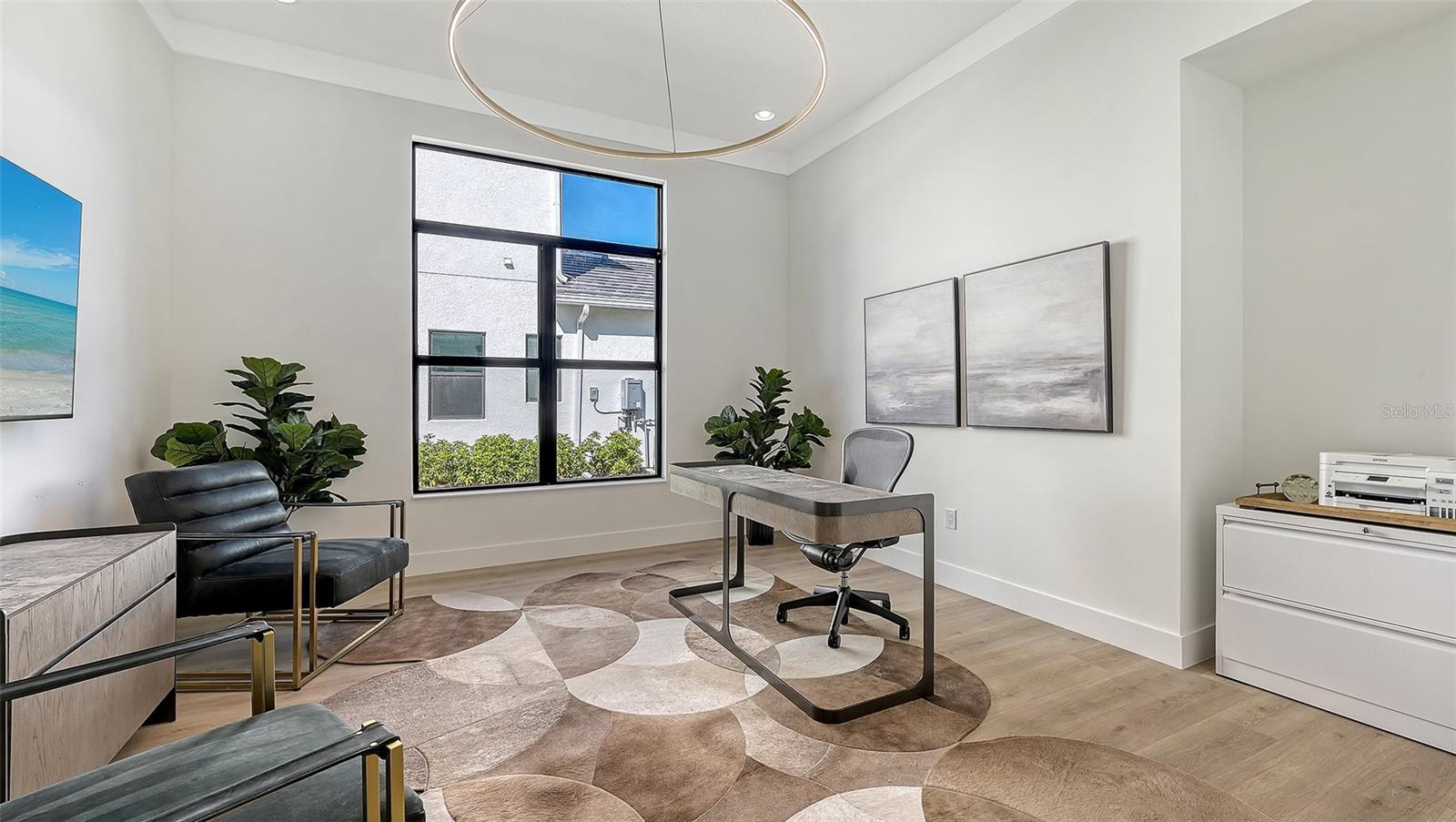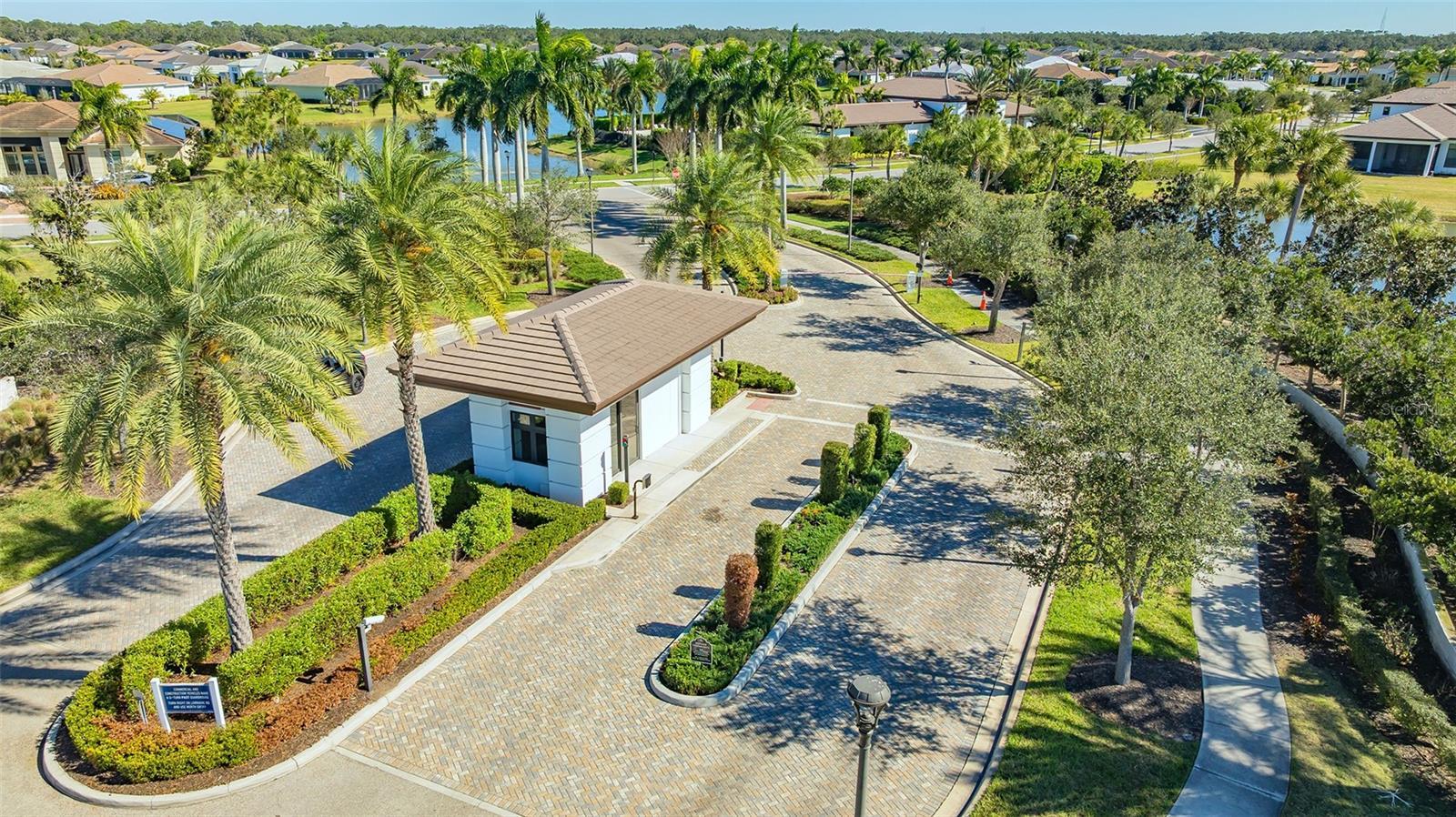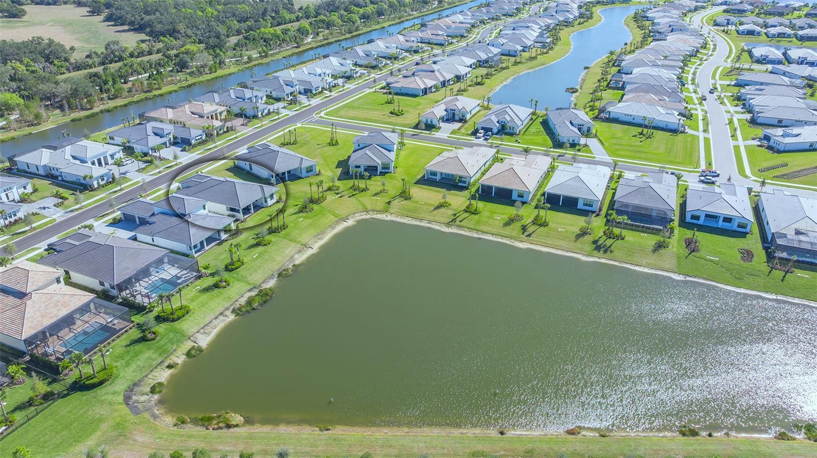 Sunsets become a daily celebration in this extraordinary lakefront residence, where architectural refinement, generous scale and serene water views come together in perfect harmony. Built in 2025 and set within the gated Artistry Sarasota community, this newly constructed home offers 3,097+/- sq. ft. of thoughtfully designed interior space with an additional 600 sq. ft. of outdoor living, all positioned to capture western exposure and breathtaking evening skies across the horizon. From the moment you arrive, the home feels intentional and welcoming. Soaring high ceilings with tray accents, grand 8’ doors and dramatic walls of glass create an atmosphere that feels refined yet relaxed. More than 20’ of sliders with transoms frame the lake beyond and open directly from the great room to the extended covered lanai, allowing indoor and outdoor living to flow effortlessly. Morning light filters through the double-glass entry with transom while evenings glow with reflections dancing across the water. The flowing open floor plan centers around a beautifully appointed gourmet kitchen, featuring an expansive quartz waterfall island and quartz countertops that continue seamlessly into the backsplash. The white shaker style cabinetry with upgraded pull-out drawers and a second row of upper cabinets ensures ample storage. Beautiful, antique brushed gold accent hardware adds to the thoughtful design touches. For the Chef in the family, enjoy entertaining with the beautiful GE Monogram appliance suite that includes, a natural 36” gas cooktop with designer hood, a 30" built-in Advantium convection microwave, 30" professional french-door electronic convection wall oven, 48” built-in side-by-side double door refrigerator and the 30” fully integrated dishwasher with statement handle. A large office offers flexibility for work or retreat, while three bedrooms include two private ensuite accommodations ideal for guests or family. The primary suite overlooks the lake and sunset horizon, offering an expanded layout with angled windows, a spa-inspired bath with soaking tub, designer tile running from floor to ceiling, an oversized frameless shower with added bench, dual vanities, and a linen closet. Enjoy the oversized custom walk-in closet offering three-tiers of ample storage. More than $400k in builder upgrades enhance the home, including smart systems for HVAC, appliances, security, whole house audio, ceiling speakers, wi-fi extender, smart garage system and keyless entry. Added upgrades are the impact glass on all windows and doors, foam insulation, tankless water heater, custom laundry room, epoxy-finished three-car tandem garage, custom wood ceiling accents on the front porch and lanai, ceiling fans, recessed lighting with dimmers and pre-wired pool package and a beautiful summer kitchen being installed in February. Artistry is a true maintenance-free lifestyle with NO CDD fees, and the HOA fee also covers lawn maintenance, mulching, irrigation and 2 secured gated entrances. Enjoy the resort-style clubhouse, fitness and yoga studio, heated saltwater pool, pickleball and basketball courts as well as miles of scenic walking trails. Conveniently located near Sarasota’s most desirable destinations for fine dining, shopping, world renowned culture, world-class beaches as well as the nearby Lakewood Ranch, Waterside and several top-ranked Golf courses.