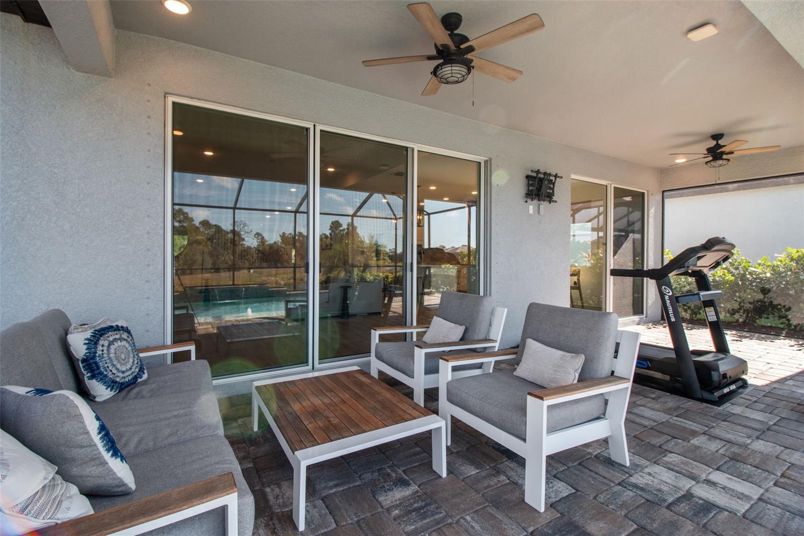 - Lighting, Outdoor Shower, Rain Gutters, Sidewalk, Sliding Doors