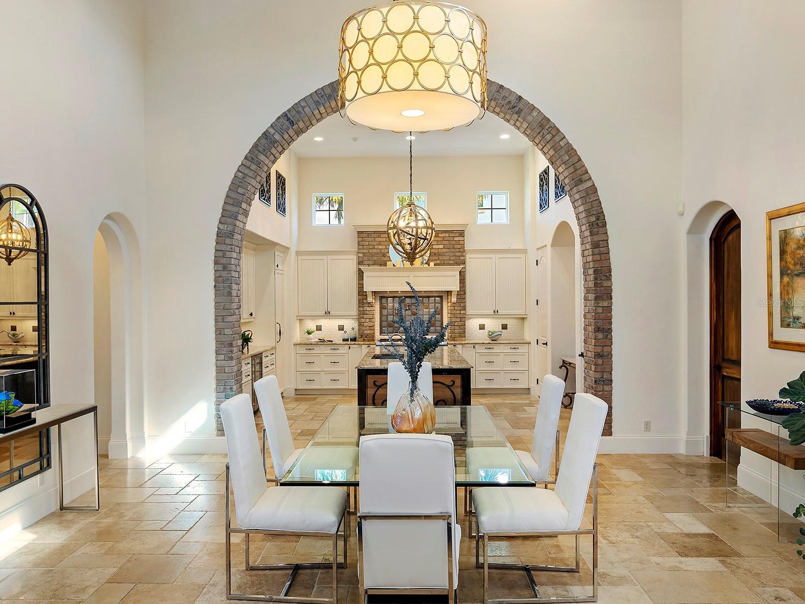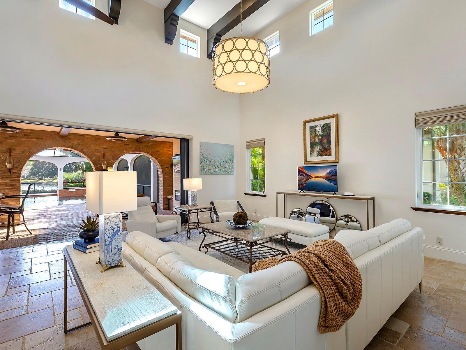 Set within The Lake Club at Lakewood Ranch, this home offers thoughtfully designed indoor–outdoor living, introduced by a gated courtyard entry, paver drive, paver walkways, landscaped grounds, exterior lanterns, and a landscaped front island. Travertine flooring spans the main living areas, with engineered wood floors throughout all bedrooms. A glass front door opens to a foyer with grasscloth wallcovering, while center-pocketing impact-rated sliders connect the great room directly to the lanai. The great room features plaster-textured walls, crown molding, brick archways, soaring 18-foot ceilings with exposed beams, abundant natural light, and motorized shades. The kitchen centers around an oversized island with extended breakfast bar seating and includes a Thermador appliance suite with a paneled refrigerator and freezer, a gas cooktop with griddle, double ovens, a warming drawer, a microwave, a paneled Bosch dishwasher, and a U-Line wine cooler. Additional features include granite countertops, a coffee bar, pot filler, decorative backsplash framed by wood and brick, custom pantries, and upgraded lighting, with the dining area positioned nicely between the kitchen and family room, making it ideal for entertaining. The primary wing features French doors to the lanai and is adorned with walls of windows overlooking the pool, fire pit, and lake. Additionally, this primary suite is appointed with crown molding, designer draperies, and motorized blinds. The luxurious bath offers separate granite vanities, a floor-to-ceiling tiled walk-in shower, a sunken soaking tub framed by windows, and a private water closet. The expansive custom closet includes built-ins, a center island with locking drawers, an integrated hamper, and a chandelier. Both guest bedrooms are en-suite. One guest bedroom is equipped with a double-door entry and a custom Murphy bed, and the other offers a built-in closet, granite vanity, and a walk-in shower with ceiling-height tile and a window. Interior features also include a half bath with a brick archway and linen storage, hallway storage, and a laundry room that includes granite counters, ample cabinetry, a sink, a window, and trim detailing. The lanai features a heated saltwater pool and spa with a Pentair heater, paver decking, exposed ceiling beams, dual ceiling fans with lighting, motorized shades, remote-controlled awnings, and brick archways. A linear electric fireplace finished in Crema Marfil marble with built-in bench seating and a gas fire pit overlooking the lake. The outdoor kitchen includes granite countertops, a sink, hood, and complementary brick and Crema Marfil finishes. FGBC-certified for energy efficiency and comfort, this smart home features Icynene spray-foam insulation, LED lighting, tankless gas water heater, whole-house generator, EV charger, whole-house water filtration with reverse osmosis, and Control4 and Sonos whole-home audio. Smart controls manage security, cameras, thermostat, garage doors, motorized blinds, and water heater, while the epoxy-finished garage includes EV and generator hookups. Located in The Lake Club’s maintenance-free section with pool care and landscaping included, residents also enjoy resort-style amenities such as a clubhouse, pool, fitness center, tennis and pickleball courts, dining, social events, and scenic lakes for kayaking and fishing, just minutes from top-rated schools, shopping, dining, and Sarasota’s beaches.