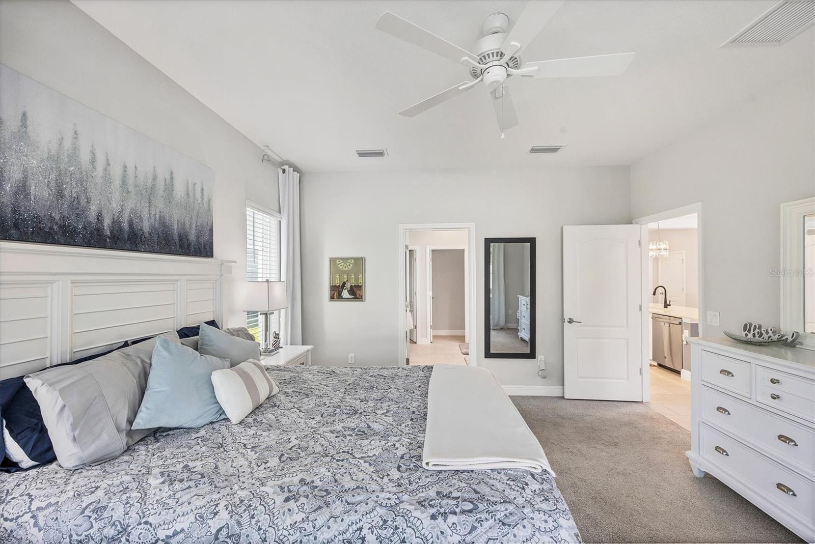 - Ceiling Fans(s), Crown Molding, Eat-in Kitchen, High Ceilings, Open Floorplan, Primary Bedroom Main Floor, Smart Home, Solid Wood Cabinets, Stone Counters, Thermostat, Walk-In Closet(s), Window Treatments
