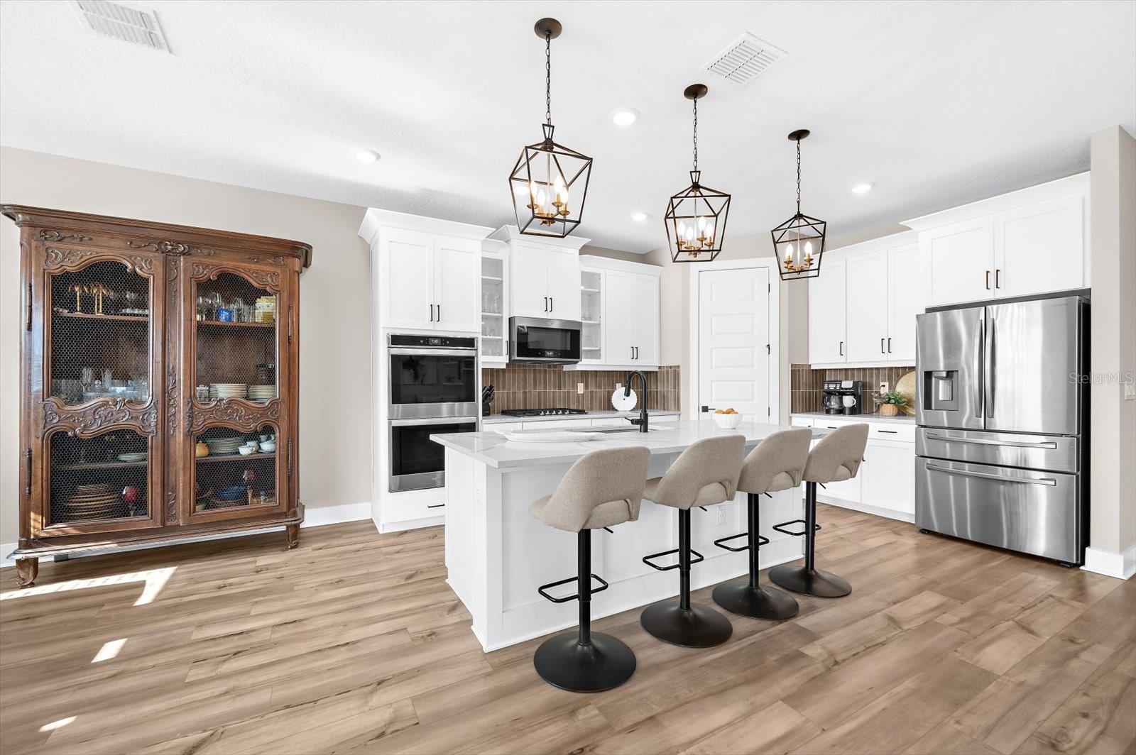Welcome to this beautifully appointed residence located in the gated community of Savanna at Lakewood Ranch, where refined living meets natural serenity. Offering approximately 2,475 square feet of thoughtfully designed living space, this home features four bedrooms, three bathrooms, and a versatile bonus room/den ideal for a home office, media room, or flexible living area. Set on a meticulously landscaped homesite, the property boasts a northeast-facing backyard overlooking a tranquil nature preserve, providing exceptional privacy and a peaceful backdrop. Step outside to the covered lanai, the perfect retreat to relax, enjoy serene views, and observe local wildlife in a quiet, natural setting. Inside, the home is highlighted by luxury vinyl flooring throughout, window blinds, ceiling fans, and a bright, open layout designed for both comfort and entertaining. The chef’s kitchen is a standout, featuring quartz countertops, natural gas cooking, built-in double ovens, stainless steel appliances, a spacious walk-in pantry, and a grand center island with ample breakfast bar seating—perfect for gatherings large and small. Additional features include a three-car garage with epoxy-coated floors, smart home enhancements, and a well-designed laundry room offering abundant shelving and pre-plumbing for a sink. A pavered driveway and mature landscaping further enhance the home’s impressive curb appeal. Residents of Savanna enjoy access to resort-style amenities, including a community pool, fitness center, and dog park, all within the highly desirable Lakewood Ranch lifestyle. This exceptional home offers the perfect balance of elegance, functionality, and tranquility. Schedule your private showing today and experience it for yourself.