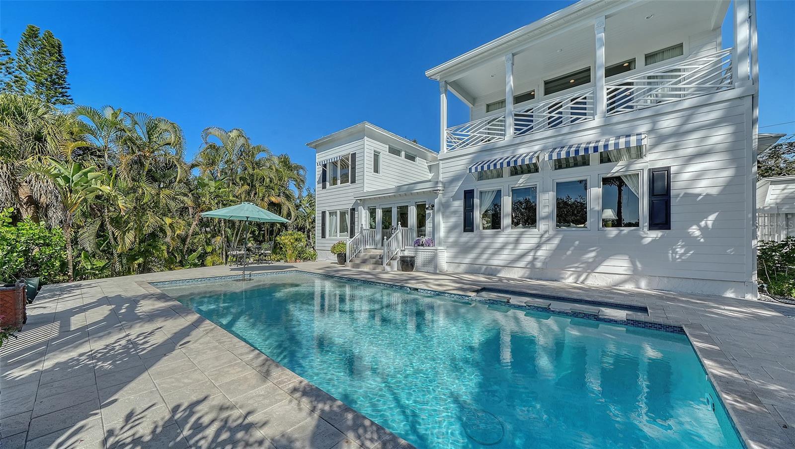 Gated Siesta Key Estate with Guest House & Boating Access. Experience the best of Siesta Key living, where award-winning white quartz sand beaches meet a relaxed island lifestyle, just minutes from Sarasota’s vibrant arts, dining, and cultural attractions. Tucked inside its own gated enclave, this exceptional waterfront estate with a detached guest house is surrounded by lush tropical landscaping, creating a secluded oasis. The thoughtfully designed open floor plan offers many possibilities. The kitchen serves as the heart of this home, opening seamlessly to a casual living area and dining space, while the expansive living room beyond features a fireplace and picture windows framing tranquil water and tropical views. A versatile flex room at the front of the home easily adapts to your lifestyle — ideal as a home office, formal dining room, or playroom. Additional conveniences include a half bath and an oversized laundry room with access to a spacious two-car garage with abundant storage. French doors at the rear of the home lead to the outdoor living area, where a heated saltwater pool and spa overlook peaceful canal views wrapping along the rear and side of the property. Upstairs, the impressive primary suite offers a true retreat, complete with its own fireplace and a luxuriously appointed spa-style bathroom. A generous second bedroom features an ensuite bathroom, while two additional bedrooms share a third bathroom. Wood flooring, marble tile, high-end finishes, and distinctive architectural details are showcased throughout. Adding flexibility, the detached guest suite includes a private entrance, studio, bathroom, kitchenette, and private courtyard — perfect for guests, multigenerational living, live-in staff, home office space, or fitness studio. Boating enthusiasts will appreciate immediate access to the waterfront lifestyle with a private dock, 7,000-pound boat lift, plus an included 18-foot boat with trailer and two kayaks — ready for adventure from day one. Ideally located in the heart of Siesta Key, the home is just steps from the prestigious Out-of-Door Academy, and a walk or bike ride to Siesta Beach and Siesta Village. Convenient access to the north bridge makes reaching downtown Sarasota easy. Offered turnkey furnished, this extraordinary property is move-in ready and perfectly suited as a primary residence, seasonal retreat, vacation home, or rental investment opportunity.