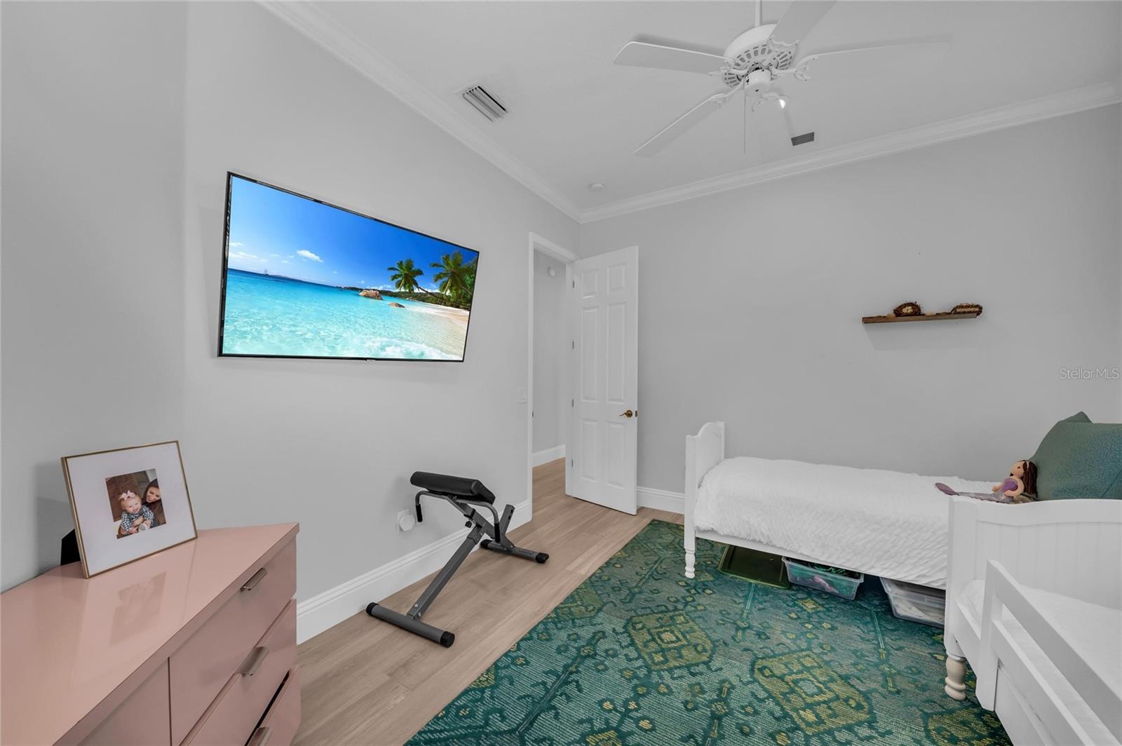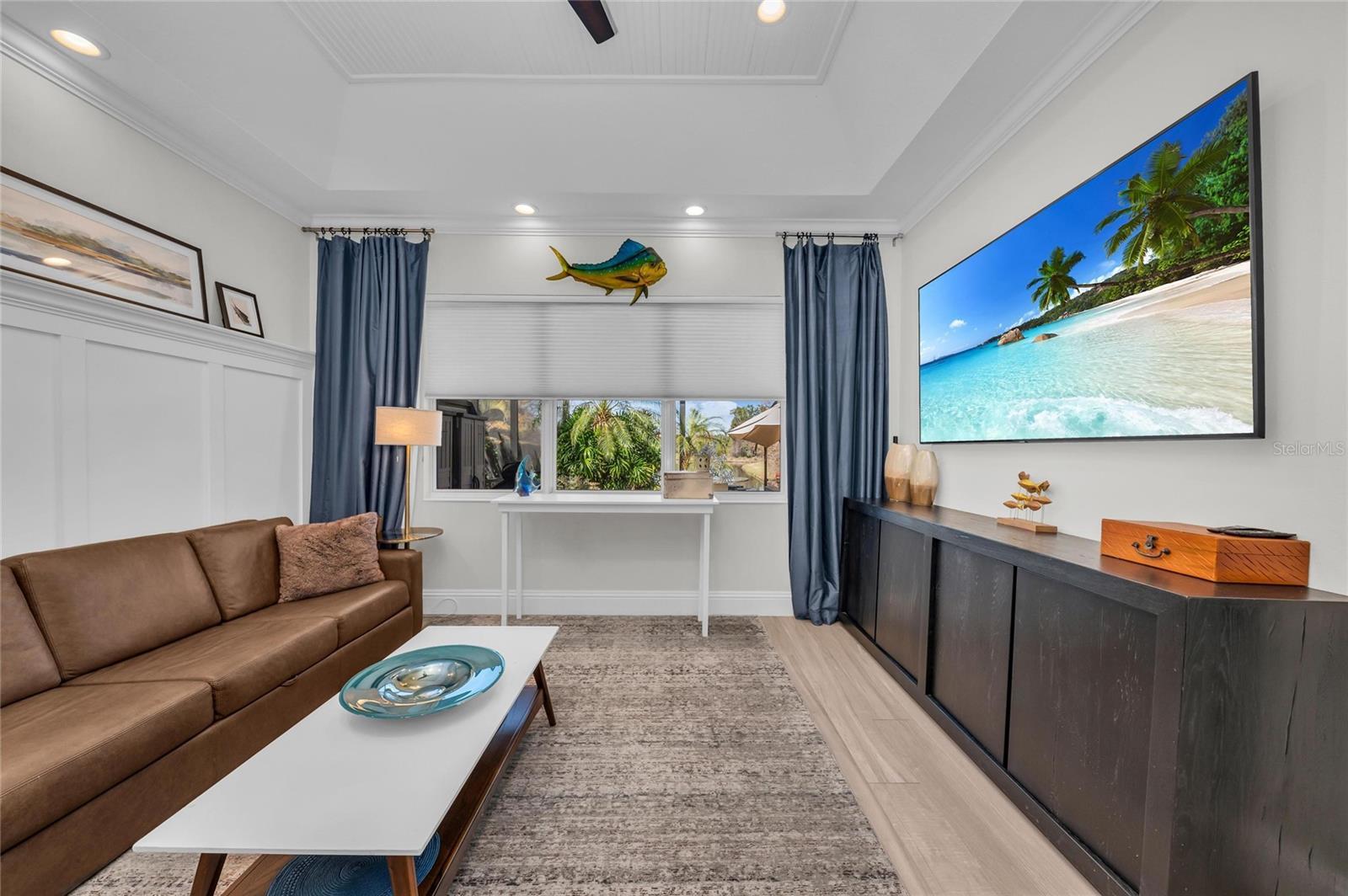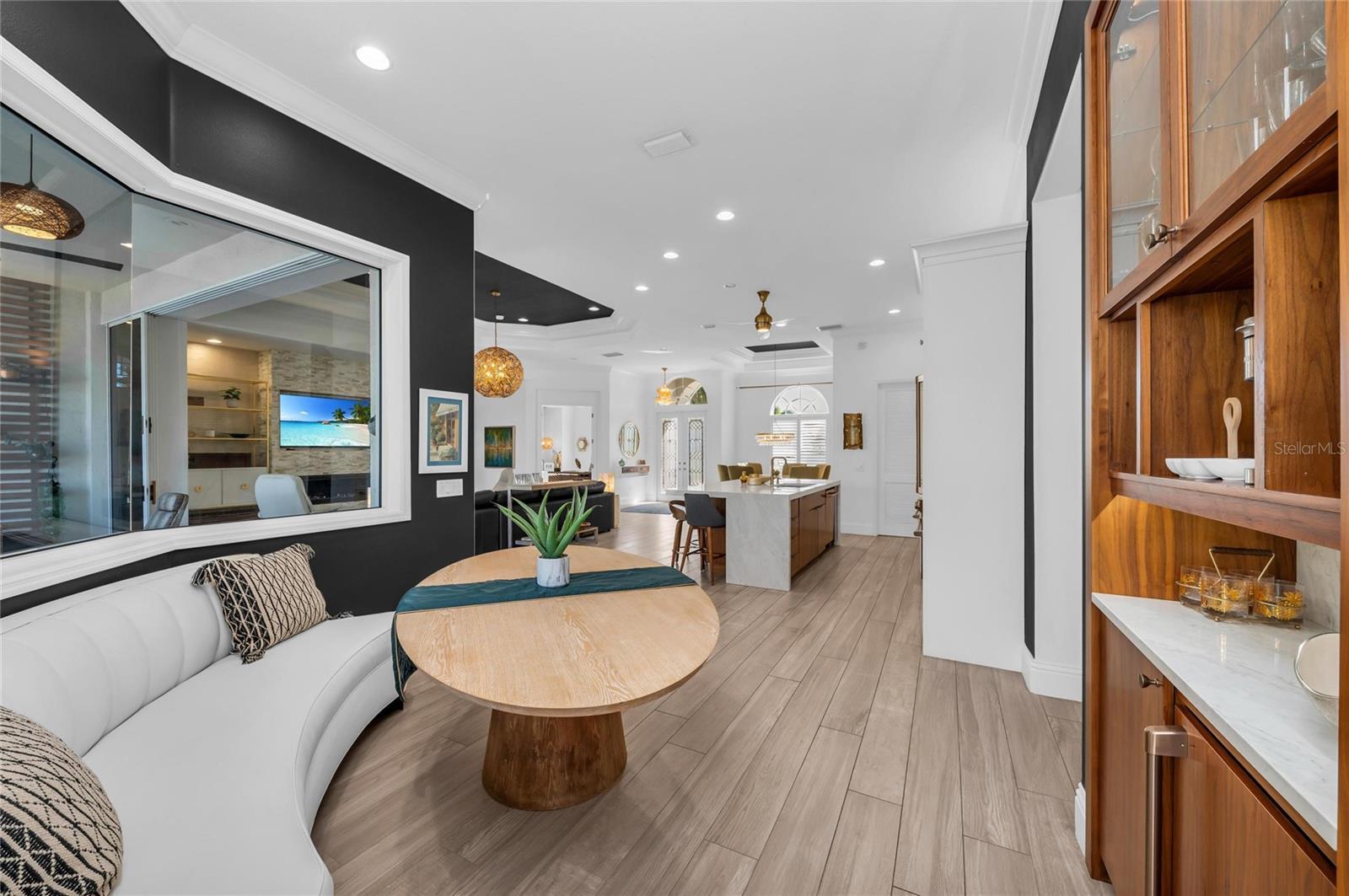 - Built-in Features, Ceiling Fans(s), Coffered Ceiling(s), Crown Molding, Eat-in Kitchen, In Wall Pest System, Kitchen/Family Room Combo, Open Floorplan, Solid Surface Counters, Solid Wood Cabinets, Split Bedroom, Stone Counters, Thermostat, Tray Ceiling(s), Walk-In Closet(s)