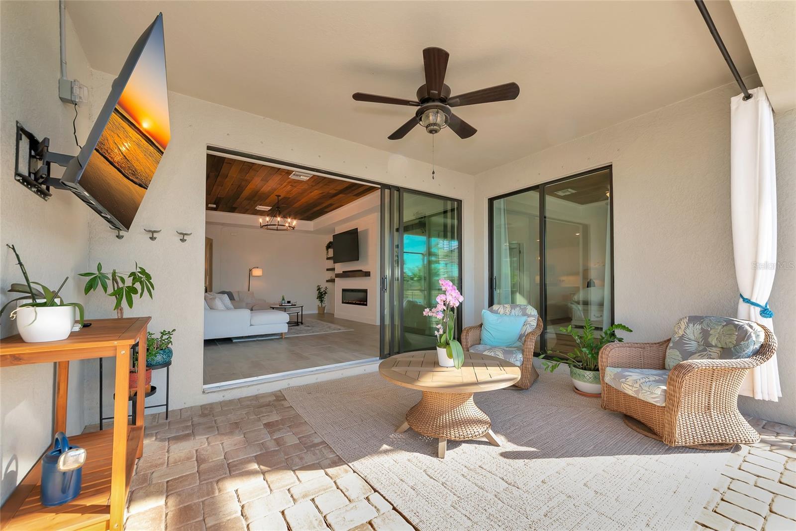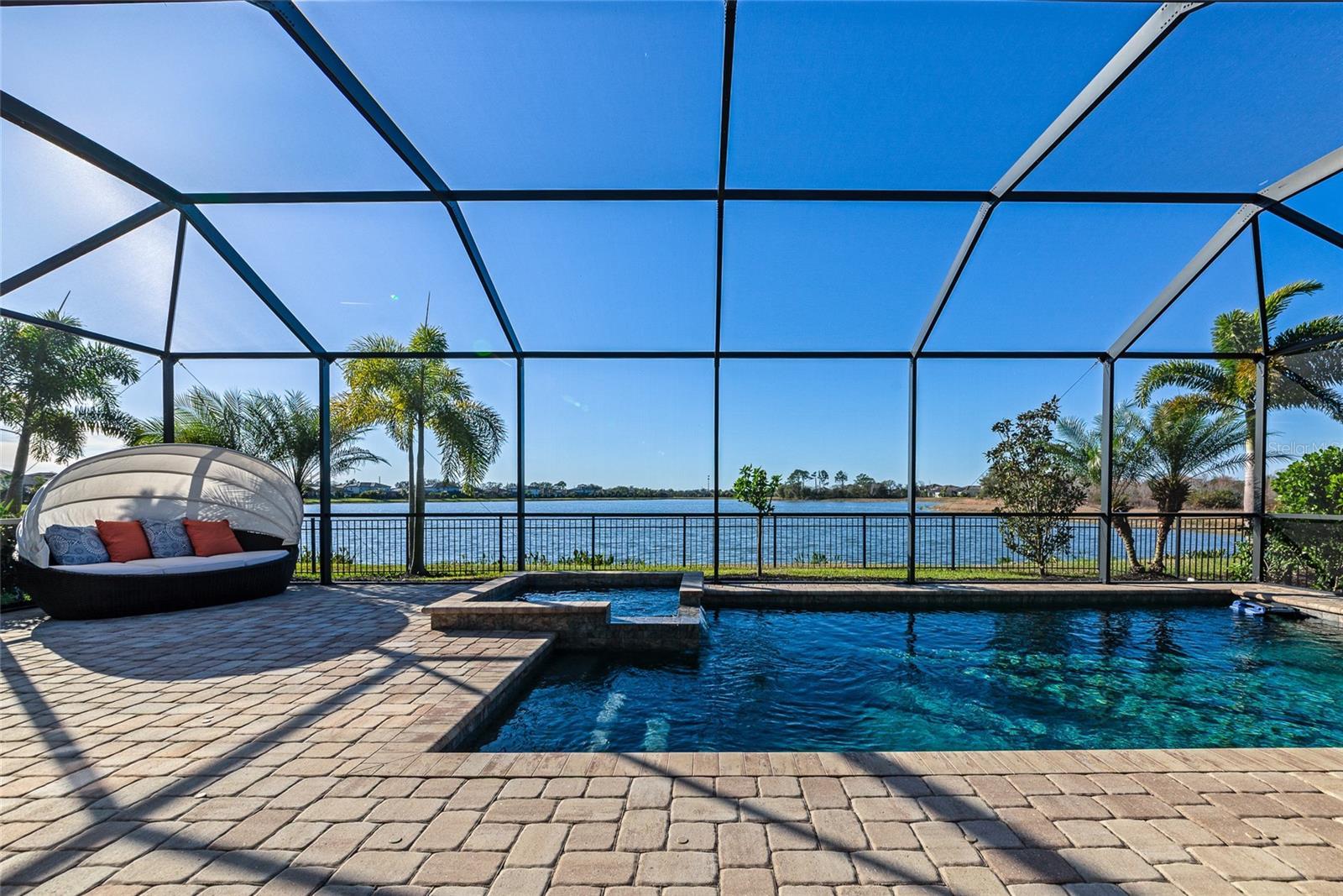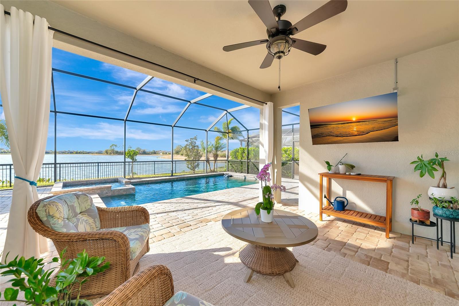 This Summerville model in Polo Run at Lakewood Ranch offers a rare combination of a west-facing water view, a highly desirable floor plan, and extensive upgrades throughout. The unobstructed lake view is perfectly positioned to enjoy exceptional Florida sunsets. The home features a functional great room layout with three bedrooms, three full baths, a dedicated den or home office, and a spacious three-car garage. One secondary bedroom includes an ensuite bathroom, making it ideal for guests. The open kitchen serves as the heart of the home, featuring quartz countertops, white cabinetry, a fireclay farmhouse sink, a custom backsplash, stainless steel appliances including a Bosch dishwasher and GE four-door refrigerator, and a large center island. The primary suite offers a generous custom walk-in closet and a spa-style bathroom with dual vanities, a soaking tub, and an upgraded walk-in shower with custom tile. Additional interior upgrades include luxury vinyl plank flooring, custom shiplap accent wall with floating shelves, ceiling plank installation, whole-house interior paint, designer lighting, wainscoting, and custom fireplace and island enhancements. Outside, the screened lanai features a saltwater pool and spa overlooking the lake, complemented by a fully fenced backyard that provides convenience for pets while preserving the view. Practical upgrades include a whole-house water softener and carbon filtration system, a natural gas generator hookup, and an upgraded laundry with LG washer and dryer. Polo Run is a gated, maintenance-free community with resort-style amenities, including a pool, pickleball courts, a fitness center, and a clubhouse. Residents enjoy access to top-rated schools, trails, parks, golf, and dining that make Lakewood Ranch one of the most desirable communities on Florida’s Gulf Coast. Please view the 3D virtual tour to experience the layout, upgrades, and exceptional setting firsthand.