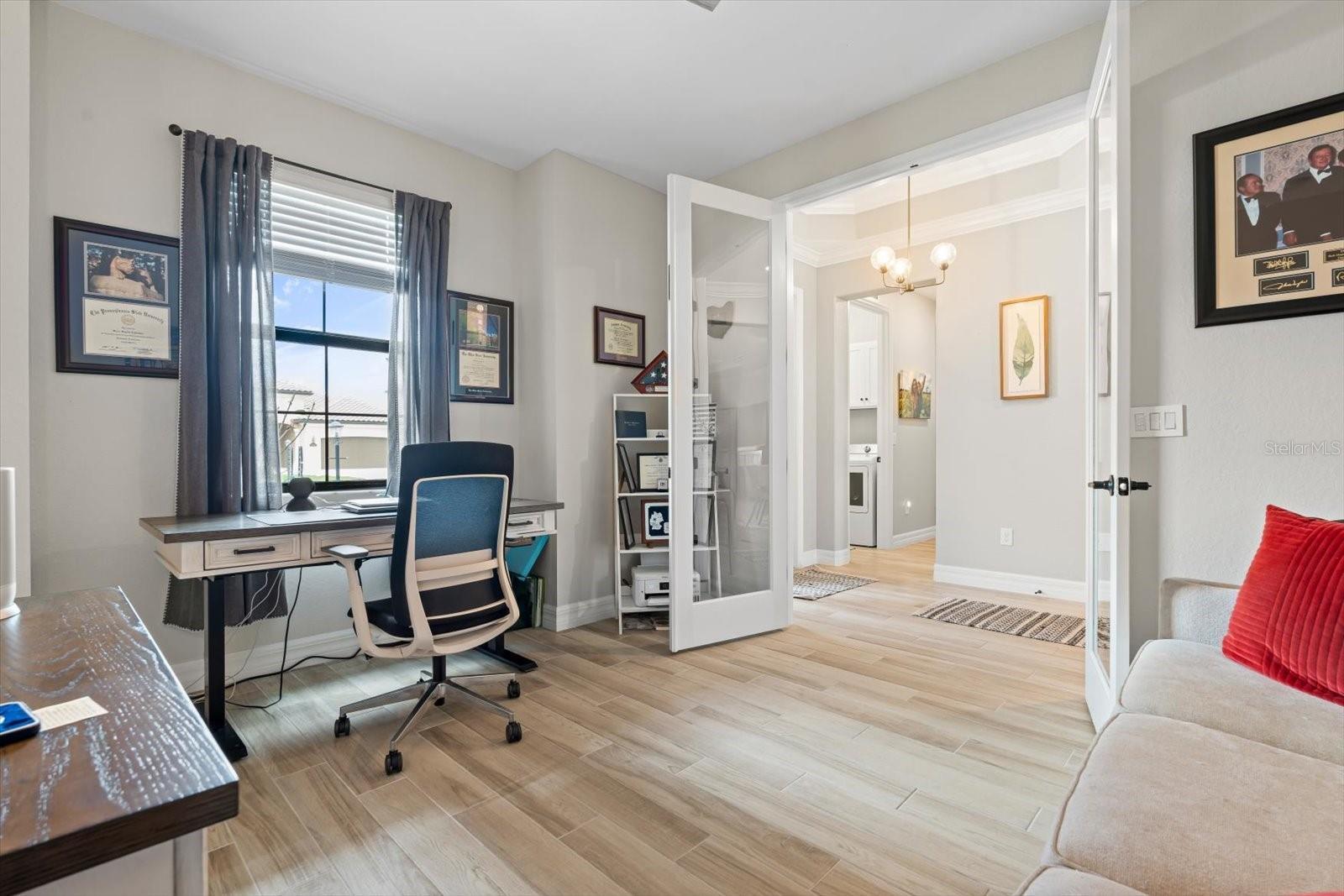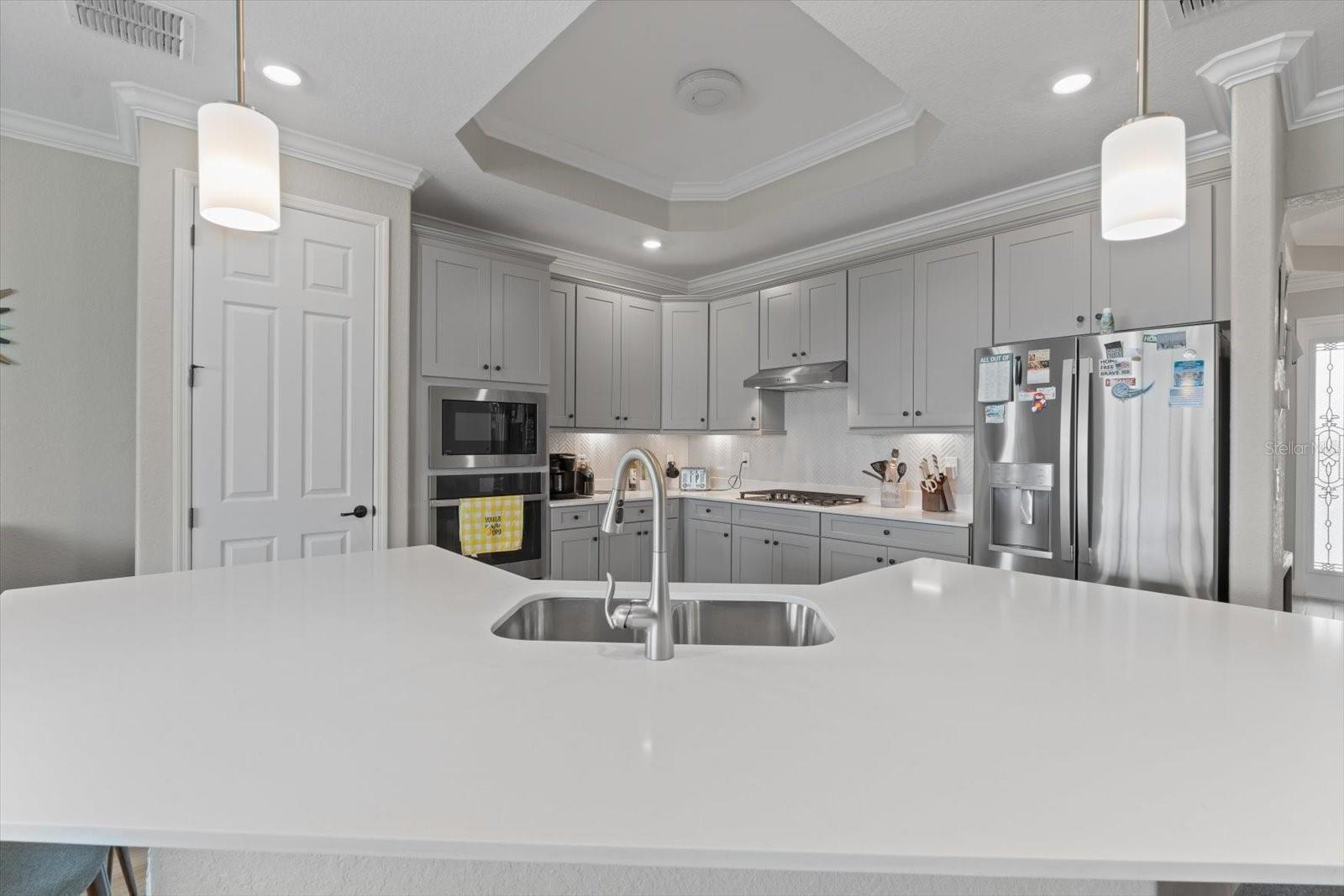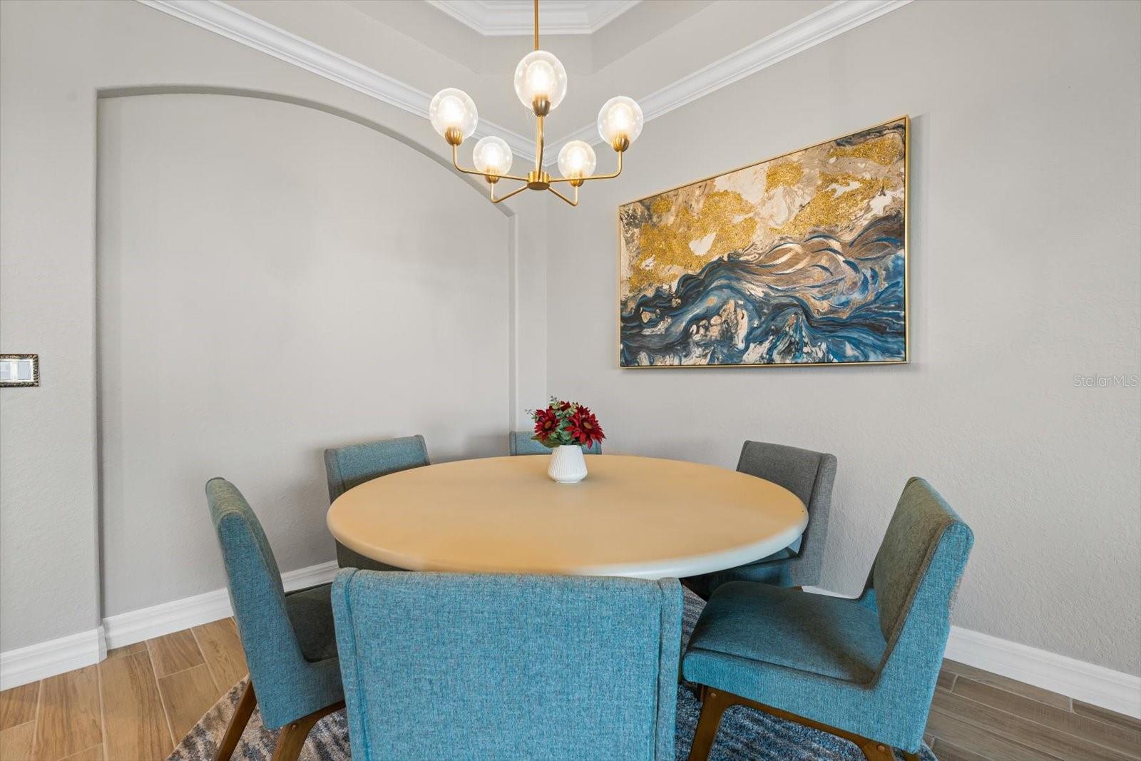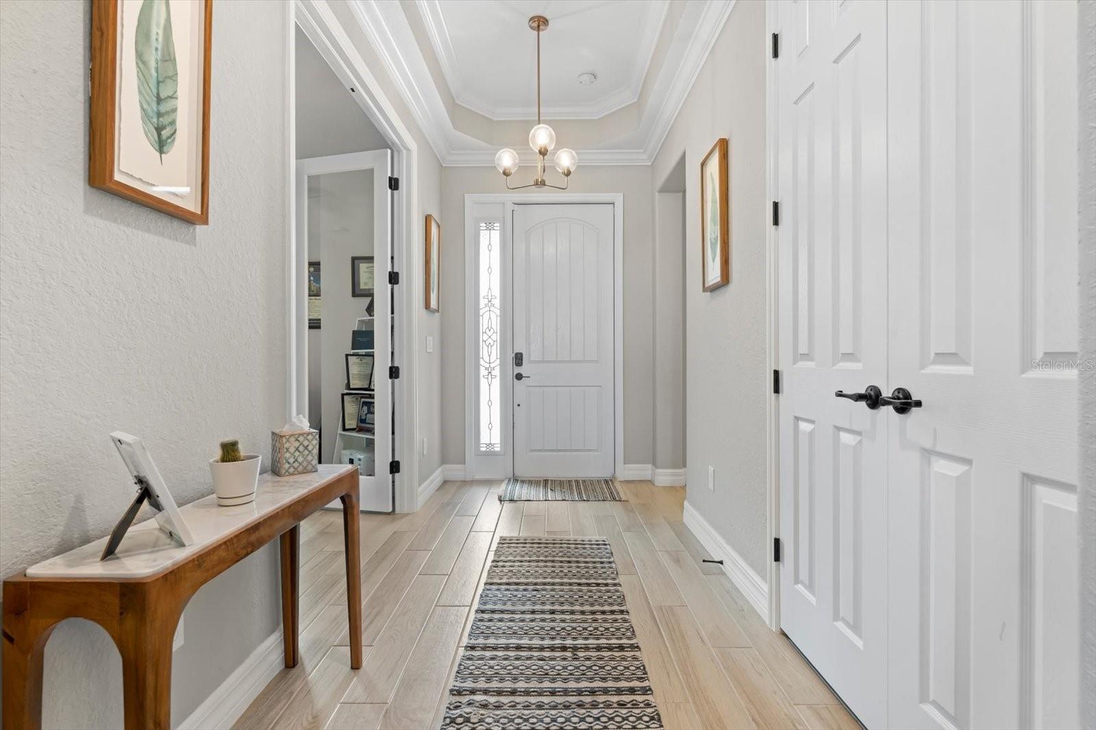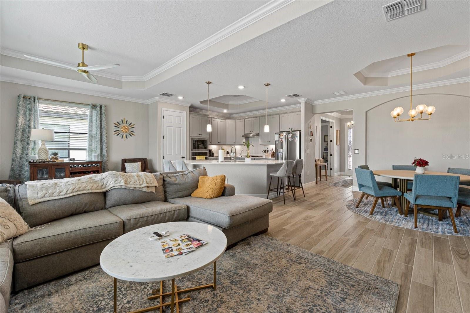 - Crown Molding, High Ceilings, Kitchen/Family Room Combo, Living Room/Dining Room Combo, Primary Bedroom Main Floor, Solid Wood Cabinets, Split Bedroom, Stone Counters, Tray Ceiling(s), Walk-In Closet(s), Window Treatments