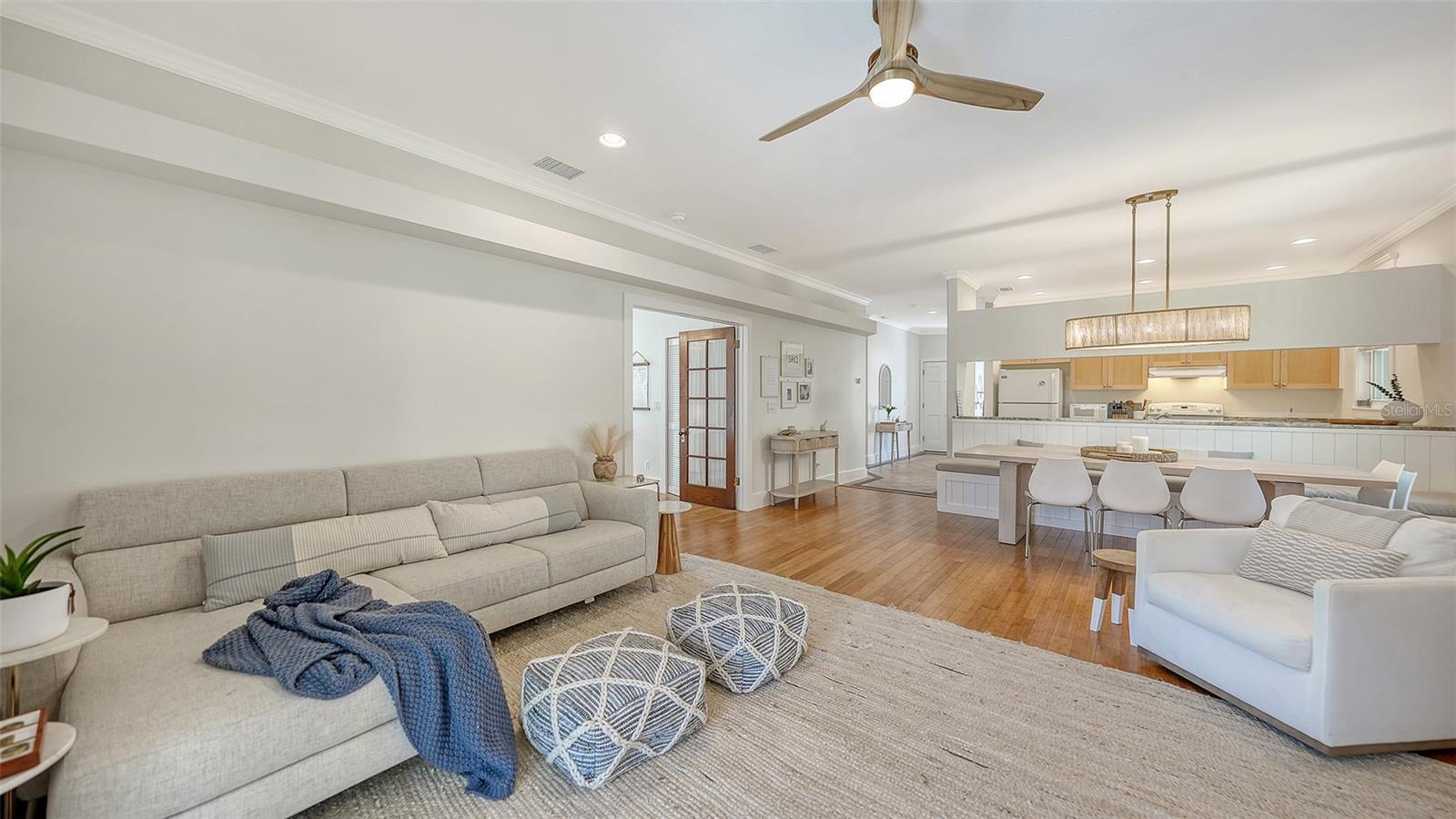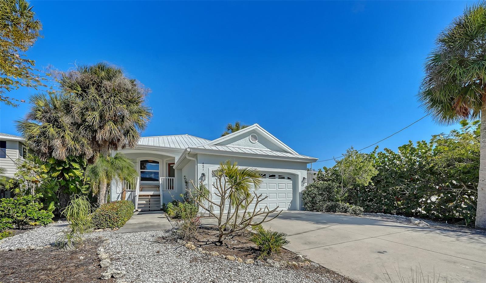 Ideally located on Palm Island in the heart of Siesta Key, this elevated block-construction home offers the ultimate blend of style and resilience. Situated on nearly a quarter-acre, this 2-bedroom, 2-bathroom residence includes a generously-sized office currently utilized as a 3rd bedroom. Elevated over 10 feet, the home features a metal roof (2019), hurricane impact windows (2019), newer HVAC (2022) and new exterior paint (2026). The interior shines with fresh paint, designer lighting, and a custom statement banquette. An updated kitchen with marble countertops is open to the ample living and dining space, perfect for entertaining. The oversized owner’s suite boasts a walk-in closet and an ensuite bath with dual sinks, and double doors opening to the deck and pool area. Outside, enjoy the newly installed heated pool and paver deck overlooking a tranquil saltwater pond, which provides additional privacy. Just blocks from the world-famous Siesta Key Beach and less than a mile from the Village, this is island living at its finest.