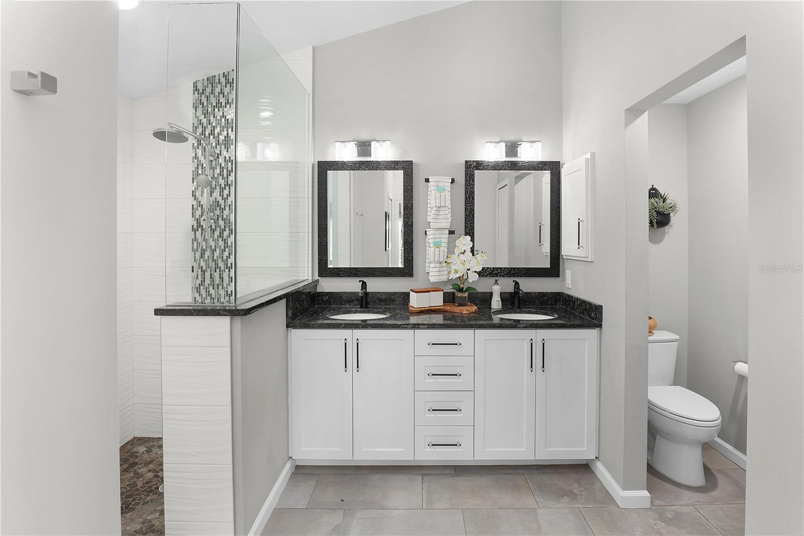 - Cathedral Ceiling(s), Eat-in Kitchen, Living Room/Dining Room Combo, Open Floorplan, Primary Bedroom Main Floor, Solid Wood Cabinets, Stone Counters, Thermostat, Walk-In Closet(s)