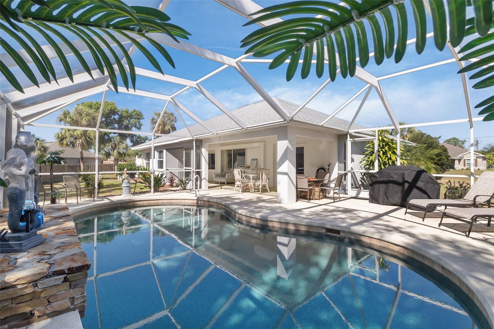 As the days begin to cool up North, now is the time to plan your Winter escape. With DECEMBER AND JANUARY NOW OPEN, Kenvil offers the perfect setting for your long weekend or extended stay. If you are traveling alone or with another couple, this home comfortably accommodates up to six people. Your four legged travel companions are welcome too with advance approval. The Owners enjoy the home in their downtime, so you can expect everything is here to settle in and feel right at home. Sunlight fills the space, from floor to soaring ceiling, and provides a rejuvenating oasis. The interior is cozy but certainly the majority of your time will be spent pool side. Picture this-yacht rock on the bluetooth, pina coladas mixing in the blender, rafts lazily bouncing on the pool surface and the grill mistro making magic over the propane flame. The living room provides a comfortable setting to relax as well. Strong wi-fi with smart tv's to stream from your favorite platforms. Inside dining options at the formal table, in the dinette overlooking the pool or grab a quick snack seated at the breakfast bar. If you are sharing space, the split bedroom plan is ideal. The primary suite is a retreat all on its own. Spacious with a garden soaking tub, separate shower and vanity space for two. Private entrance to the lanai via the French doors from the primary. The guest bedrooms share a common bathroom and provide comfortable bedding and linens for a restful slumber. North Port is centrally located where shopping, dining and retail are right on hand here or in neighboring Port Charlotte. The gorgeous Gulf Beaches in Venice or along Manasota Key are scenic 30 minute drive. We are looking forward to hosting you. Call today to begin planning. Prices vary depending on length and time of stay.