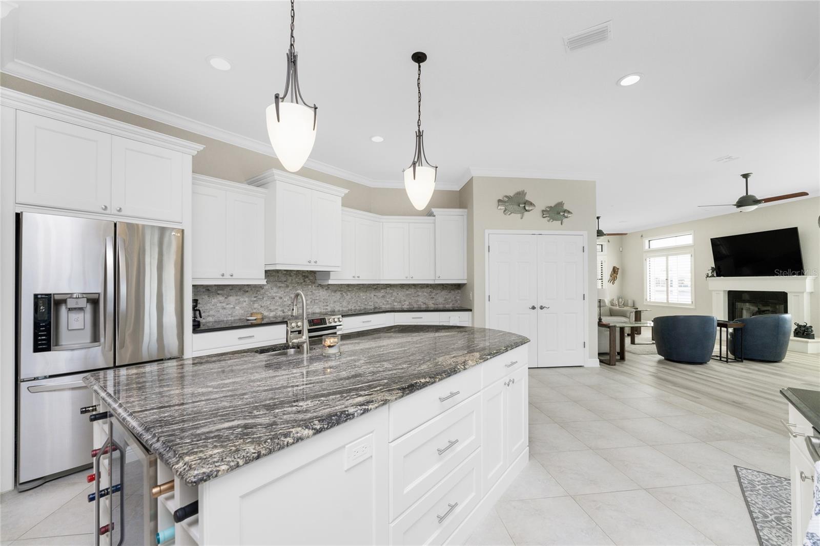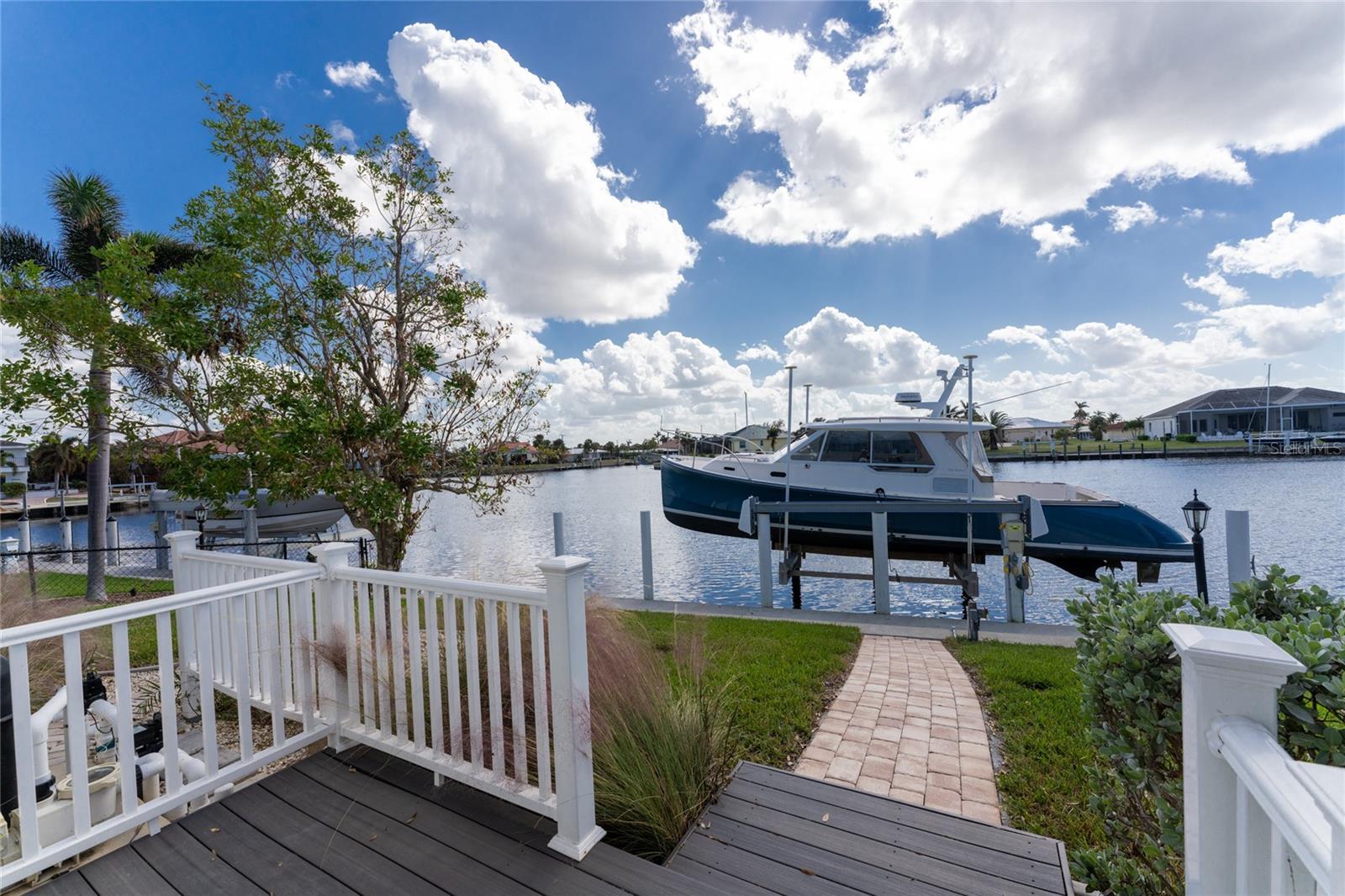 Stunning custom WATERFRONT pool home located on JAMAICA WAY the most sought after street in desirable deed restricted PUNTA GORDA ISLES. This property offers QUICK deep water SAILBOAT ACCESS and is only 4 minutes to Charlotte Harbor and on to the Gulf of Mexico. Jamaica Way is a dead end street with a cul-de-sac and is walking distance to the Isles Yacht Club. This light and bright home offers 3 Bedrooms, 3.5 Bathrooms and a 2.5 Car Garage. Beautiful design features throughout the home. There is an open concept and split bedroom floor plan with Foyer, Great Room, formal Dining Area, Family Room, well appointed Kitchen, Inside Laundry and Office/Den. The Kitchen features staggered height white wood cabinetry with crown molding, granite counters, tile backsplash, pantry closet, breakfast bar with seating for 4, tile floor. There is an island with seating for 2, sink, storage and built in wine rack. Appliances are stainless: French door refrigerator, oven/range, dishwasher, built in microwave. The Kitchen opens to the formal Dining Area with porcelain wood look tile flooring and French doors with transom windows that lead to the Lanai. There is a half bath off the Kitchen. The Inside Laundry offers front loading washer and dryer, counter for folding, cabinets, drawers, shelf, built in double closet. The Family Room features natural light through numerous windows and glass French doors to the Lanai, propane gas Fireplace and lovely porcelain wood look tile flooring. French doors lead to the spacious office/den with large arched window, built in wall electric fireplace and porcelain wood look tile flooring. The impressive Master Bedroom suite has porcelain wood look tile flooring, French doors with transom windows to the Lanai, arched windows, 2 spacious custom walk in closets with wood shelving and drawers. Each closet measures 6.9 x 6.7 and each is also a HURRICANE ROOM. The Master Bedroom has a private bathroom with his and hers sinks, wood vanities, granite counters and large frameless walk in shower with clear glass wall. There are two additional generous sized bedrooms- each has double built in closets and storage above. The guest bathroom has a walk in shower and large vanity with white wood cabinets and granite counters. Your living space extends via French doors to the screened Lanai with inground heated pool and spa, full Pool Bath, paver deck, large covered area with two ceiling fans. The pool cage has picture window screening facing the water offering an unobstructed water view. Continue down the paver walkway to the 60 foot concrete dock and 20,000 lb boat lift. There is an 85 foot concrete seawall maintained by the city of Punta Gorda. There is NO HOA and utilities are city water and sewer. Other features include: hurricane protection, front door with sidelights and transom window, crown molding, plantation shutters throughout, paver walkway and driveway, irrigation system, lush tropical landscaping. **NEW** METAL ROOF, soffits, gutters, pool cage, doors. This home is 5 minutes to Golf and Fishermen's Village and 10 minutes to historic downtown Punta Gorda shopping, dining, medical care, waterfront parks, walking and biking paths, art galleries, weekend farmers markets, Charlotte Harbor Event Center and more! This is a very impressive home in a special community.