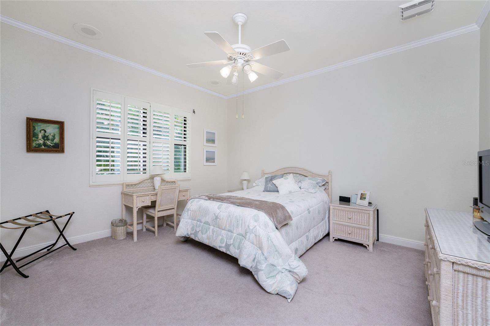 - Ceiling Fans(s), Crown Molding, High Ceilings, Open Floorplan, Solid Wood Cabinets, Split Bedroom, Stone Counters, Thermostat, Walk-In Closet(s), Window Treatments