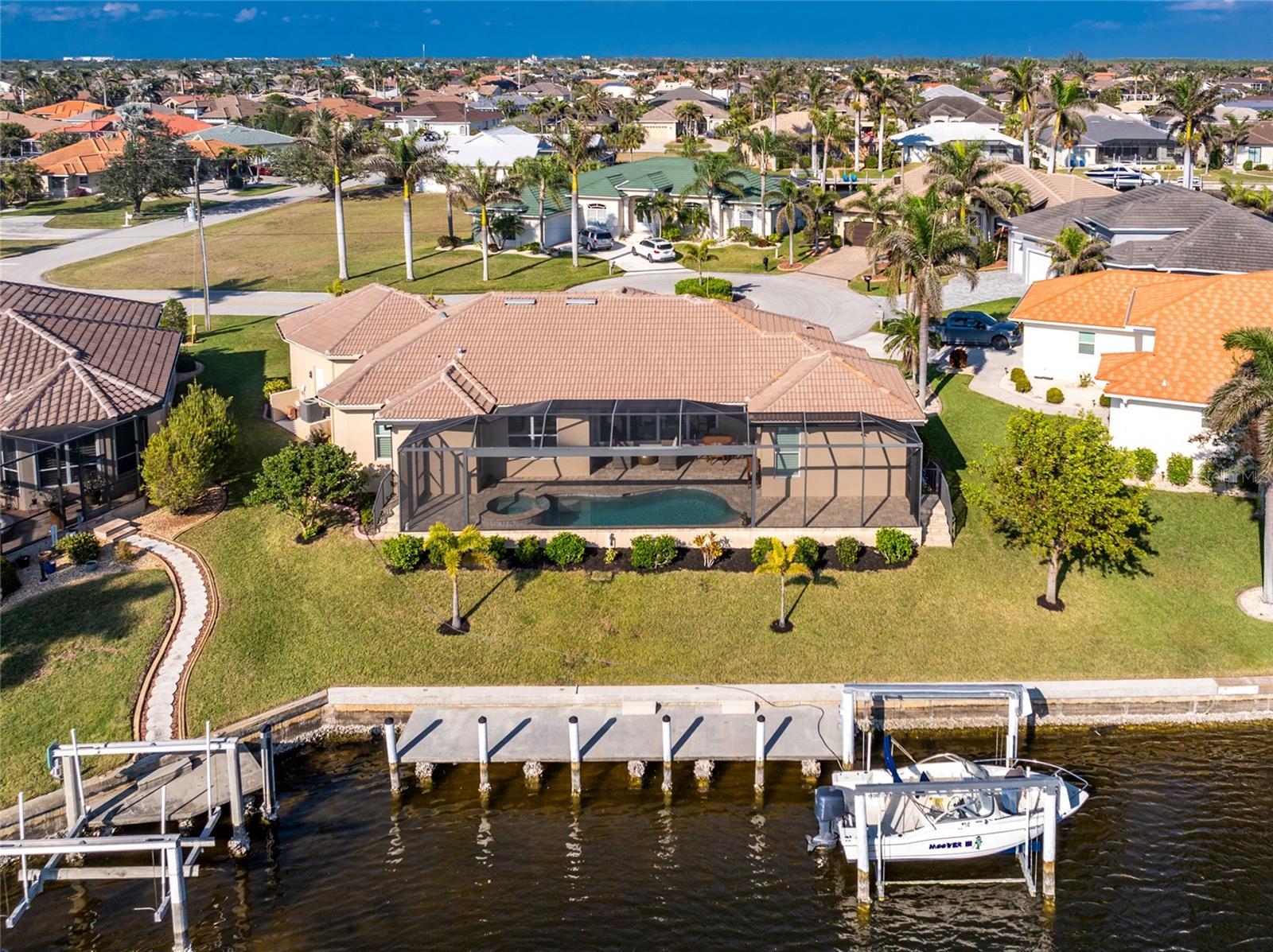 SIGNIFICANT PRICE ADJUSTMENT! You’ll be enchanted by this stunning custom-built luxury home in the heart of Burnt Store Isles, Punta Gorda. Nestled on a meticulously landscaped lot, this masterpiece overlooks an extended intersecting canal view, complete with a 30-foot dock and a 10,000-pound lift, offering direct access to Charlotte Harbor and the Gulf of Mexico. A blend of architectural beauty and modern functionality, this home is an ode to style, sophistication, and waterfront living. From the moment you arrive, the charm of this property is undeniable. The paver driveway, lined with pristine landscaping, leads to a welcoming tiled front entrance. French leaded glass doors, accented by an arched window, set the tone for the grandeur within. Stepping inside, you are greeted by tile floors, soaring ceilings, and a flood of natural light that illuminates every meticulously designed corner. Plantation shutters and fantastic ceiling fans adorn almost every room. The heart of the home, the Great Room, dazzles with its double-tray ceiling, elegant uplighting, and crown molding. Eight-foot, 90-degree sliding glass doors dissolve the boundaries between indoor and outdoor spaces, seamlessly opening to the screened lanai. Whether you're hosting a lively gathering or savoring a quiet evening, the fluid transition amplifies the beauty of Florida living. For culinary enthusiasts, the kitchen is a dream come true. Solid wood cabinet fronts, striking stone countertops with designer pendant lighting above and GE Profile graphite stainless steel appliances are complemented by a large single sink and a convection microwave. A 300-gallon propane tank fuels the gas cooktop, ensuring effortless gourmet meal preparation. The Primary suite is a sanctuary, offering a spacious 9x8 walk-in closet, a cozy sitting area, and a luxurious ensuite bath. Tray ceilings with crown molding elevate the space, while a deep soaking tub, a walk-in frameless glass shower, and a double sink vanity with decorative stone trim provide the ultimate in relaxation. The two spacious guest bedrooms share a beautiful bathroom with a door to the lanai to act as a pool bath. Step outside to find your private paradise. The propane heated, remote controlled saltwater pool and spa, sparkles against the backdrop of the serene canal. The lanai, with the clear view pool cage, enhances the breathtaking water views. Pavers grace the pool deck, which features a generous covered sitting area perfect for alfresco dining. This home features impact rated doors and windows, 8 foot interior doors with wide casings and tall baseboards, a central vacuum system and electric roll down sun shades. Located at the very end of Tripoli Boulevard on a quiet cul-de-sac and conveniently located just minutes from downtown Punta Gorda's fine dining and vibrant culture. Shopping and daily essentials are a breeze with Publix and Home Depot just 2 miles away. This is the home that you’ve been looking for.