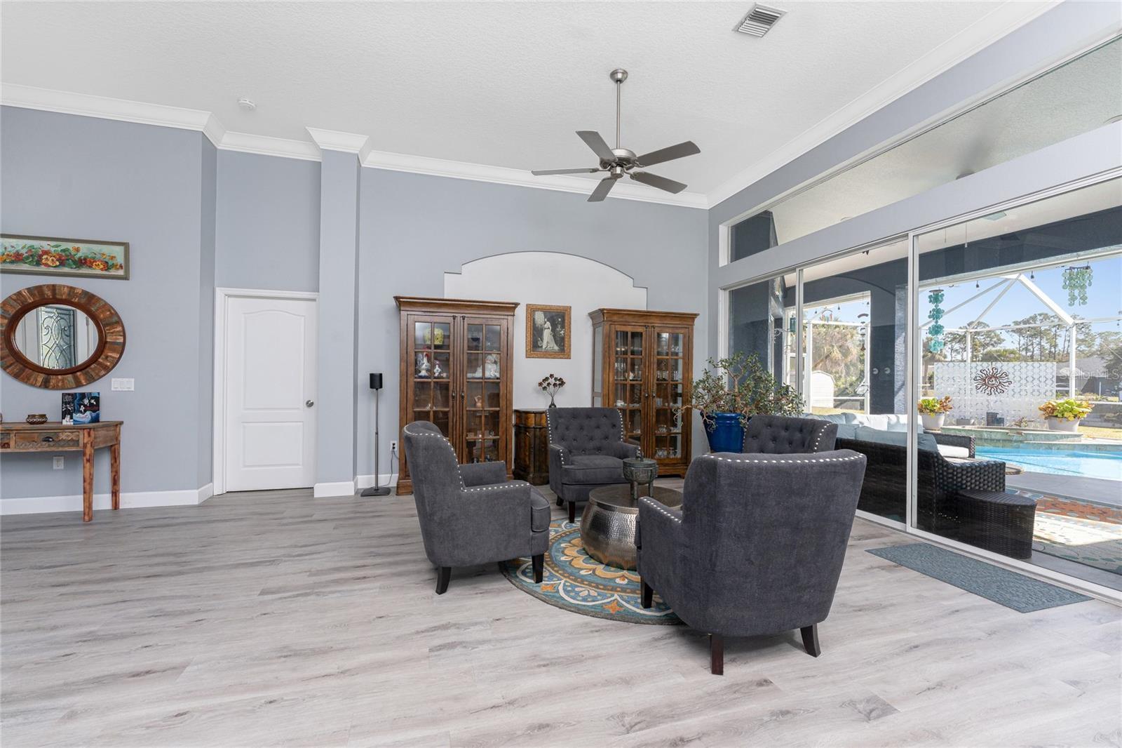 - Ceiling Fans(s), Crown Molding, High Ceilings, Open Floorplan, Primary Bedroom Main Floor, Walk-In Closet(s)